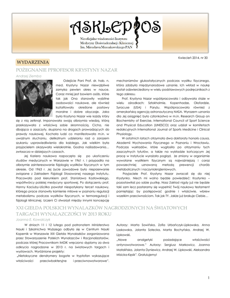 Kwiecień 2014, nr 30 WYDARZENIA POŻEGNANIE PPROFESOR KRYSTYNY NAZAR Andrzej Ziemba Odejście Pani Prof. dr. hab. n. med. Krystyny Nazar niewątpliwe zamyka pewien okres w nauce. Coraz mniej jest bowiem osób, które tak jak Ona stanowiły wybitne osobowości naukowe, ale również kształtowały określone postawy moralne i dobre obyczaje. Jaka była Krystyna Nazar wie każdy który się z nią zetknął. Imponowała swoją olbrzymia wiedzą, którą przekazywała z właściwą sobie skromnością. Cicha, nie dbająca o zaszczyty, skupiona na drogach prowadzących do prawdy naukowej. Kochała ludzi co manifestowała m.in. w uważnym słuchaniu, delikatnym udzielaniu rad a zarazem szukaniu usprawiedliwienia dla każdego. Jak wielkim była przyjacielem okazywała wielokrotnie. Godna naśladowania… zwłaszcza w dzisiejszych czasach. Jej Kariera naukowa rozpoczęła się po ukończeniu studiów medycznych w Warszawie w 1961 r. i przypadła na olbrzymie zainteresowanie fizjologią wysiłków fizycznych w tym okresie. Od 1963 r. Jej życie zawodowe było nieprzerwanie związane z Zakładem Fizjologii Stosowanej naszego Instytutu. Pracowała pod kierunkiem prof. Stanisława Kozłowskiego, współtwórcy polskiej medycyny sportowej. Po dołączeniu prof. Hanny Kaciuby-Uściłko powstał niespotykany tercet naukowy, którego prace stanowiły kamienie milowe w poznaniu regulacji metabolizmu podczas wysiłków fizycznych, w termoregulacji i fizjologii klinicznej. Uczeni Ci stworzyli między innymi koncepcję mechanizmów glukostatycznych podczas wysiłku fizycznego, która zdobyła międzynarodowe uznanie. Ich wkład w naukę został odzwierciedlony w wielu podstawowych podręcznikach z tego zakresu. Prof. Krystyna Nazar współpracowała i odbywała staże w wielu ośrodkach: Sztokholmie, Kopenhadze, Oksfordzie, Syracuse (USA) i Paryżu. Współpracowała również z amerykańską agencją astronautyczną NASA. Wyrazem uznania dla Jej osiągnięć było członkostwo w m.in. Research Group on Biochemistry of Exercise, International Council of Sport Science and Physical Education (UNESCO) oraz udział w komitetach redakcyjnych International Journal of Sports Medicine i Clinical Physiology. W ostatnich latach otrzymała dwa doktoraty honoris causa, Akademii Wychowania Fizycznego w Poznaniu i Wrocławiu. Podczas wykładów, które wygłosiła po otrzymaniu tych zaszczytnych tytułów, a także na wykładzie kończącym Jej pracę w Instytucie wyrażała pogląd, że zmiany w organizmie wywołane wysiłkiem fizycznym są najważniejszą i coraz powszechniej uznawaną metodą prewencji chorób metabolicznych i naczyniokrążeniowych. Przyjaciele Prof. Krystyny Nazar zwracali się do niej Krystynko. Niech mi wolno będzie powiedzieć: Krystynko – pozostawiłaś po sobie pustkę. Nasz Zakład nigdy już nie będzie taki sam lecz postaramy się wypełnić Twój naukowy testament pamiętając by postępować godnie i właściwie, wbrew wszelkim przeciwnościom. Tak jak TY. Jakże już brakuje Ciebie… XXI GIEŁDA POLSKICH WYNALAZKÓW NAGRODZONYCH NA ŚWIATOWYCH TARGACH WYNALAZCZOŚCI W 2013 ROKU Joanna E. Kowalczyk W dniach 11 i 12 lutego pod patronatem Ministerstwo Nauki i Szkolnictwa Wyższego odbyła się w Centrum Nauki Kopernik w Warszawie XXI Giełda Wynalazków zorganizowana przez Stowarzyszenie Polskich Wynalazców i Racjonalizatorów, podczas której Pracownikom IMDiK wręczono dyplomy za dwa odkrycia nagrodzone w 2013 r. na światowych targach i wystawach. Wyróżnione projekty: „Nietoksyczne dendrymery bogate w tryptofan wykazujące właściwości przeciwbakteryjne Autorzy: Marta Sowińska, Zofia Urbańczyk-Lipkowska, Anna Laskowska, Jolanta Sołecka, Marta Bochyńska, Andrzej W. Lipkowski. „Nowe analgetyki antynowotworowe.” Autorzy: posiadające Sergiusz właściwości Markowicz, Joanna Matalińska, Jolanta Dyniewicz, Andrzej W. Lipkowski, Aleksandra Misicka-Kęsik”. Gratulujemy! i przeciwnowotworowe”. 1 DOKTORANTKA IMDIK NAGRODZONA STYPENDIUM „ALZHEIMER'S DRUG DISCOVERY FOUNDATION” Maria Kawalec, Pracownia Biologii Molekularnej Doktorantka Pracowni Biologii Molekularnej, mgr farm. Maria Kawalec, została nagrodzona stypendium Amerykańskiego Towarzystwa do Badań nad Lekami w Chorobie Alzheimera (Alzheimer's Drug Discovery Foundation; ADDF YOUNG INVESTIGATOR SCHOLARSHIP). Stypendium przyznano 24 młodym badaczom z całego świata, który wyróżnili się szczególnymi osiągnięciami na wczesnych etapach kariery naukowej i wykazali szczególne zaangażowanie w badania nad rozwojem leków neurologicznych. Stypendyści wzięli udział w corocznym spotkaniu Fundacji: Annual Drug Discovery For Neurodegeneration Conference: An Intensive Course on Translating Research into Drugs, w dniach 2-4 lutego w Miami, USA. Podczas spotkania mgr Maria Kawalec zaprezentowała wyniki badań dotyczących neuroprotekcyjnego działania hybryd peptydowych opioid – neurotensyna w modelu ekscytotoksycznego uszkodzenia hipokampa szczura w hodowli organotypowej (Effects of the hybridization of opioid and neurotensin pharmacophores on neurotoxicity in hippocampal organotypic cultures. Kawalec M., Kleczkowska P., Zabłocka B., Lipkowski A.W.). Organizacja Alzheimer's Drug Discovery Foundation została założona w 1998 roku w celu wspierania badań nad rozwojem nowych leków neurologicznych poprzez finansowanie nowatorskich projektów badawczych na całym świecie oraz wspieranie transferu wiedzy pomiędzy środowiskiem nauki i biznesu m. in. poprzez organizację konferencji i kursów teoretycznych. Więcej informacji o fundacji znajduje się na stronie: http://www.alzdiscovery.org DOKTORANTKA IMDIK W FINALE KONKURSU FAMELAB 2014 Joanna E. Kowalczyk Jest nam miło poinformować, iż doktorantka IMDiK mgr Malwina Roszkowska-Chojecka z Zakładu Fizjologii Nerek i Płynów Ustrojowych znalazła się w gronie 10 finalistów konkursu FameLab 2014. To międzynarodowy konkurs, do którego przystępują bada