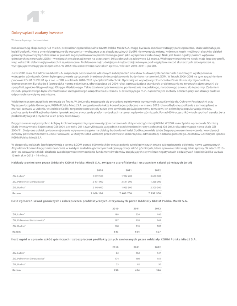 Dobry sąsiad i zaufany inwestor W stronę lepszego budownictwa Konsekwencją eksploatacji rud miedzi, prowadzonej przed kopalnie KGHM Polska Miedź S.A. mogą być m.in. możliwe wstrząsy parasejsmiczne, które oddziałują na ludzi i budynki. Nie są one niebezpieczne dla otoczenia – w obszarze prac eksploatacyjnych Spółki nie występują rejony, które na skutek możliwych skutków działań górniczych powinny być określone w planach zagospodarowania przestrzennego gmin jako wyłączone z zabudowy. Niski jest także ogólny poziom wpływów górniczych na terenach LGOM – w rejonach eksploatacji teren na przestrzeni 50 lat obniżył się zaledwie o 3,5 metra. Wielkopowierzchniowe niecki mają łagodny profil, więc wskaźniki deformacji powierzchni są nieznaczne. Problemem najtrudniejszym i najbardziej złożonym pod względem metod skutecznych zabezpieczeń są występujące wstrząsy parasejsmiczne. W 2012 roku zanotowano 525 takich zjawisk, w latach 2010–2011 – po 581. Już w 2006 roku KGHM Polska Miedź S.A. rozpoczęła poszukiwanie właściwych zabezpieczeń obiektów budowanych na terenach o możliwym występowaniu wstrząsów górniczych. Celem było opracowanie wytycznych branżowych do projektowania budynków na terenie LGOM. W latach 2006–2008 na tym zagadnieniem pracował KGHM CUPRUM sp. z o.o. – CBR, a w latach 2010–2011 specjaliści Politechniki Opolskiej we współpracy z Eurocentre Pavia University zajmowali się dostosowaniem Eurokodu 8 (europejska norma sejsmiczna, obowiązująca od 2004 roku, wprowadzająca standardy projektowania na terenach sejsmicznych) do specyfiki Legnicko-Głogowskiego Okręgu Miedziowego. Takie działania były konieczne, ponieważ nie ma polskiego, narodowego aneksu do tej normy. Zadaniem zespołu projektowego było sformułowanie szczegółowego uzupełnienia Eurokodu 8, zawierającego m.in. najważniejsze metody obliczeń przy konstrukcji budowli odpornych na wpływy sejsmiczne. Wieloletnie prace szczęśliwie zmierzają do finału. W 2012 roku rozpoczęła się procedura opiniowania wytycznych przez Komisję ds. Ochrony Powierzchni przy Wyższym Urzędzie Górniczym, KGHM Polska Miedź S.A. zorganizowała także konsultacje społeczne – w marcu 2012 roku odbyło się spotkanie z samorządami, w marcu i czerwcu w Lubinie, w siedzibie Spółki zorganizowane zostały także dwa seminaria poświęcone temu tematowi. Ich celem była popularyzacja wiedzy, podnoszenie kwalifikacji urbanistów i projektantów, stworzenie platformy dyskusji na temat wpływów górniczych. Ponad 60% uczestników tych spotkań uznało, że ta problematyka jest przydatna w ich pracy zawodowej. Przygotowanie wytycznych to kolejny krok ku bezpieczniejszym inwestycjom na terenach aktywności górniczej KGHM. W 2004 roku Spółka opracowała Górniczą Skalę Intensywności Sejsmicznej GSI-2004, a w roku 2011 zweryfikowała ją zgodnie z oczekiwaniami strony społecznej. Od 2012 roku obowiązuje nowa skala GSI 2004/11. Służy ona zobiektywizowanej ocenie wpływu wstrząsów na obiekty budowlane i ludzi. Spółka powołała także Zespoły porozumiewawcze ds. koordynacji ochrony powierzchni miast Lubin i Polkowice, w których skład wchodzą przedstawiciele samorządów, administracji nadzoru górniczego, Zakładów Górniczych Spółki i KGHM Polska Miedź S.A. W ciągu roku oddziały Spółki przyjmują z terenu LGOM ponad 500 wniosków o naprawienie szkód górniczych oraz o zabezpieczenia obiektów nowo wznoszonych. Aby ułatwić komunikację z mieszkańcami, w każdym zakładzie górniczym funkcjonują działy szkód górniczych, które sprawnie załatwiają takie sprawy. W latach 2010– 2011 na usuwanie szkód i działania zapobiegawcze (wzmocnienia fundamentów domów znajdujących się w sferze negatywnych oddziaływań kopalń) Spółka wydała 13 mln zł, w 2012 – 14 mln zł. Nak ł ady ponies ione pr zez O ddział y K GHM P ols k a Miedź S.A . związane z pr ofilak t y k ą i us uwaniem s zk ód gór niczy ch (w zł ) 2010 2011 2012 ZG „Lubin” 1 039 500 1 932 200 3 630 600 ZG „Polkowice-Sieroszowice” 2 471 000 3 511 000 1 258 000 ZG „Rudna” 2 149 600 1 965 500 2 309 300 5 660 100 7 408 700 7 197 900 Ra zem I loś ć zgł os zeń s zk ód gór niczy ch i zabezpieczeń pr ofilak t y czny ch ot r zy many ch pr zez O ddział y K GHM P ols k a Miedź S.A . 2010 2011 2012 ZG „Lubin” 188 234 180 ZG „Polkowice-Sieroszowice” 187 195 165 ZG „Rudna” 168 135 182 Ra zem 543 564 527 I loś ć ugód w s pr awie s zk ód gór niczy ch i zabezpieczeń pr ofilak t y czny ch zawier any ch pr zez oddział y K GHM P ols k a Miedź S.A . ZG „Lubin” ZG „Polkowice-Sieroszowice” ZG „Rudna” Ra zem 2010 2011 2012 83 162 137 174 180 159 33 82 50 290 424 346