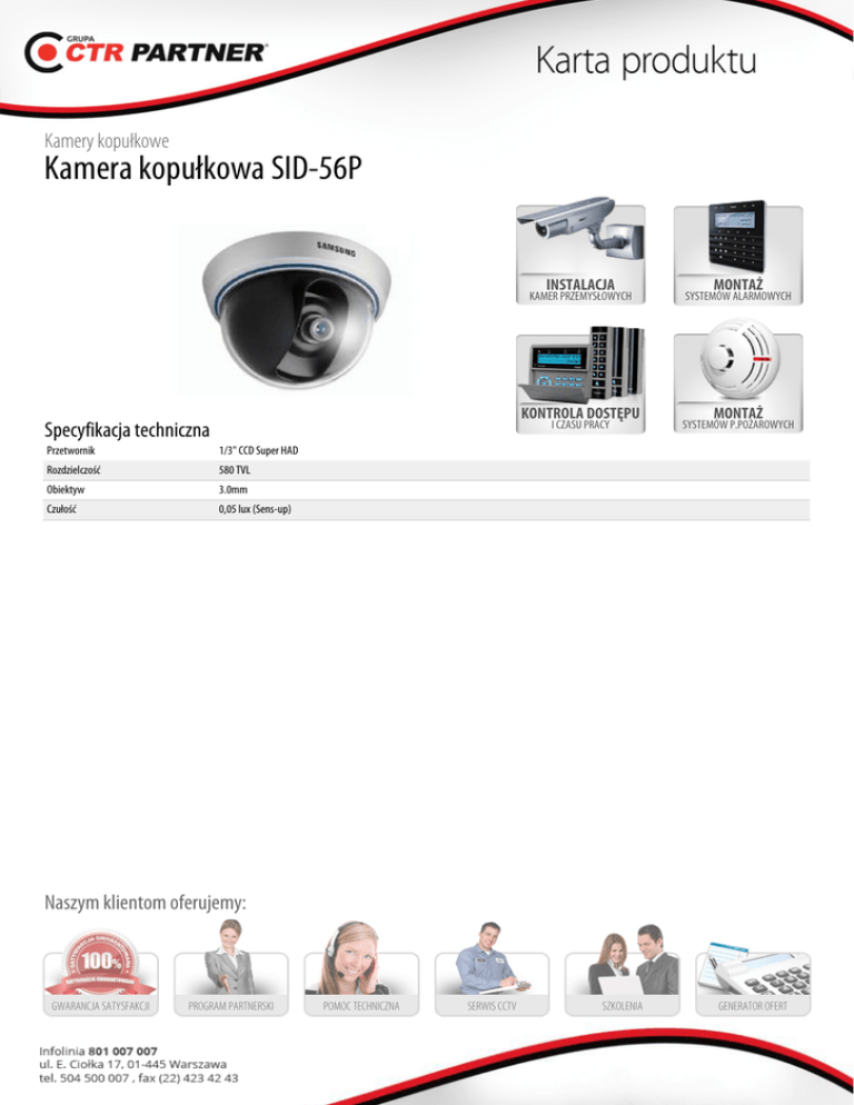 Kamery kopułkowe Kamera kopułkowa SID-56P INSTALACJA KAMER PRZEMYSŁOWYCH KONTROLA DOSTĘPU I CZASU PRACY Specyfikacja techniczna Przetwornik 1/3" CCD Super HAD Rozdzielczość 580 TVL Obiektyw 3.0mm Czułość 0,05 lux (Sens-up) MONTAŻ SYSTEMÓW ALARMOWYCH MONTAŻ SYSTEMÓW P.POŻAROWYCH Naszym klientom oferujemy: GWARANCJA SATYSFAKCJI PROGRAM PARTNERSKI POMOC TECHNICZNA SERWIS CCTV SZKOLENIA GENERATOR OFERT