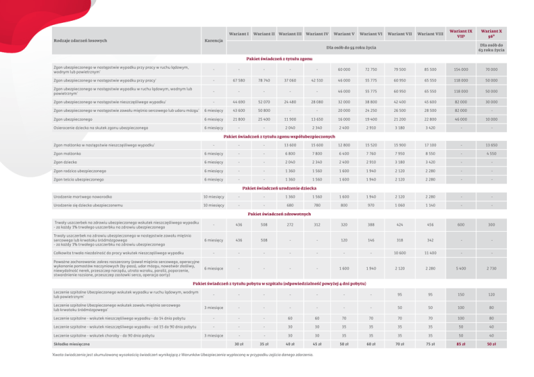 Rodzaje zdarzeń losowych Wariant I Karencja Wariant II Wariant III Wariant IV Wariant V Wariant VI Wariant VII Wariant VIII Wariant IX VIP Dla osób do 55 roku życia Pakiet świadczeń z tytułu zgonu Wariant X 56 + Dla osób do 63 roku życia Zgon ubezpieczonego w następstwie wypadku przy pracy w ruchu lądowym, wodnym lub powietrznym* - - - - - 60 000 72 750 79 500 85 500 154 000 70 000 Zgon ubezpieczonego w następstwie wypadku przy pracy - 67 580 78 740 37 060 42 510 46 000 55 775 60 950 65 550 118 000 50 000 - - - - - 46 000 55 775 60 950 65 550 118 000 50 000 - 44 690 52 070 24 480 28 080 32 000 38 800 42 400 45 600 82 000 30 000 * Zgon ubezpieczonego w następstwie wypadku w ruchu lądowym, wodnym lub powietrznym* Zgon ubezpieczonego w następstwie nieszczęśliwego wypadku* 6 miesięcy 43 600 50 800 - - 20 000 24 250 26 500 28 500 82 000 - Zgon ubezpieczonego 6 miesięcy 21 800 25 400 11 900 13 650 16 000 19 400 21 200 22 800 46 000 10 000 Osierocenie dziecka na skutek zgonu ubezpieczonego 6 miesięcy - - 2 040 2 340 2 400 2 910 3 180 3 420 - - 15 900 17 100 - 13 650 Zgon ubezpieczonego w następstwie zawału mięśnia sercowego lub udaru mózgu * - Zgon małżonka w następstwie nieszczęśliwego wypadku* Pakiet świadczeń z tytułu zgonu współubezpieczonych - - 13 600 15 600 12 800 15 520 Zgon małżonka 6 miesięcy - - 6 800 7 800 6 400 7 760 7 950 8 550 - 4 550 Zgon dziecka 6 miesięcy - - 2 040 2 340 2 400 2 910 3 180 3 420 - - Zgon rodzica ubezpieczonego 6 miesięcy - - 1 360 1 560 1 600 1 940 2 120 2 280 - - Zgon teścia ubezpieczonego 6 miesięcy - - 1 360 1 560 1 600 1 940 2 120 2 280 - - Urodzenie martwego noworodka 10 miesięcy - Urodzenie się dziecka ubezpieczonemu 10 miesięcy - Trwały uszczerbek na zdrowiu ubezpieczonego wskutek nieszczęśliwego wypadku - za każdy 1% trwałego uszczerbku na zdrowiu ubezpieczonego Trwały uszczerbek na zdrowiu ubezpieczonego w następstwie zawału mięśnia sercowego lub krwotoku śródmózgowego - za każdy 1% trwałego uszczerbku na zdrowiu ubezpieczonego Całkowita trwała niezdolność do pracy wskutek nieszczęśliwego wypadku Poważne zachorowanie: zakres rozszerzony (zawał mięśnia sercowego, operacyjne wykonanie pomostów naczyniowych (by-pass), udar mózgu, nowotwór złośliwy, niewydolność nerek, przeszczep narządu, utrata wzroku, paraliż, poparzenie, stwardnienie rozsiane, przeszczep zastawki serca, operacja aorty) Pakiet świadczeń urodzenie dziecka - 1 360 1 560 1 600 1 940 2 120 2 280 - - - 680 780 800 970 1 060 1 140 - - Pakiet świadczeń zdrowotnych - 436 508 272 312 320 388 424 456 600 300 6 miesięcy 436 508 - - 120 146 318 342 - - - - - - - - - 10 600 11 400 - - 6 miesiące - - - - 1 600 1 940 2 120 2 280 5 400 2 730 Pakiet świadczeń z tytułu pobytu w szpitalu (odpowiedzialność powyżej 4 dni pobytu) Leczenie szpitalne Ubezpieczonego wskutek wypadku w ruchu lądowym, wodnym lub powietrznym* - - - - - - - 95 95 150 120 3 miesiące - - - - - - 50 50 100 80 Leczenie szpitalne - wskutek nieszczęśliwego wypadku - do 14 dnia pobytu - - - 60 60 70 70 70 70 100 80 Leczenie szpitalne - wskutek nieszczęśliwego wypadku - od 15 do 90 dnia pobytu - - - 30 30 35 35 35 35 50 40 Leczenie szpitalne Ubezpieczonego wskutek zawału mięśnia sercowego lub krwotoku śródmózgowego* Leczenie szpitalne - wskutek choroby - do 90 dnia pobytu Składka miesięczna * 3 miesiące - - 30 30 35 35 35 35 50 40 30 zł 35 zł 40 zł 45 zł 50 zł 60 zł 70 zł 75 zł 85 zł 50 zł Kwota świadczenia jest skumulowaną wysokością świadczeń wynikającą z Warunków Ubezpieczenia wypłacaną w przypadku zajścia danego zdarzenia.