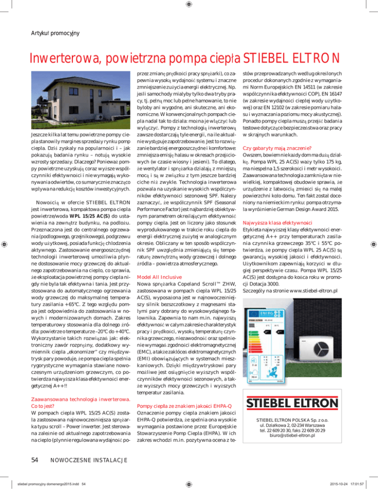 Artykuï promocyjny Inwerterowa, powietrzna pompa ciepïa STIEBEL ELTRON Jeszcze kilka lat temu powietrzne pompy ciepïa stanowiïy margines sprzedaĝy rynku pomp ciepïa. DziĂ zyskaïy na popularnoĂci ib– jak pokazujÈ badania rynku – notujÈ wysokie wzrosty sprzedaĝy. Dlaczego? Poniewaĝ pompy powietrzne uzyskujÈ coraz wyĝsze wspóïczynniki efektywnoĂci ibnie wymagajÈ wykonywania odwiertów, co sumarycznie znaczÈco wpïywa na redukcjÚ kosztów inwestycyjnych. NowoĂciÈ wb ofercie STIEBEL ELTRON jest inwerterowa, kompaktowa pompa ciepïa powietrze/woda WPL 15/25 AC(S) do ustawienia na zewnÈtrz budynku, na podïoĝu. Przeznaczona jest do centralnego ogrzewania (podïogowego, grzejnikowego), podgrzewu wody uĝytkowej, posiada funkcjÚ chïodzenia aktywnego. Zastosowanie energooszczÚdnej technologii inwerterowej umoĝliwia pïynne dostosowanie mocy grzewczej do aktualnego zapotrzebowania na ciepïo, co sprawia, ĝe eksploatacja powietrznej pompy ciepïa nigdy nie byïa tak efektywna ibtania. Jest przystosowana do automatycznego ogrzewania wody grzewczej do maksymalnej temperatury zasilania +65°C. Zb tego wzglÚdu pompa jest odpowiednia do zastosowania wbnowych ib modernizowanych domach. Zakres temperaturowy stosowania dla dolnego ěródïa: powietrze obtemperaturze –20°C do +40°C. Wykorzystanie takich rozwiÈzañ jak: elektroniczny zawór rozprÚĝny, dodatkowy wymiennik ciepïa „ekonomizer” czy miÚdzywtrysk pary powoduje, ĝe pompa ciepïa speïnia rygorystyczne wymagania stawiane nowoczesnym urzÈdzeniom grzewczym, co potwierdza najwyĝsza klasa efektywnoĂci energetycznej A++!! Zaawansowana technologia inwerterowa. Co to jest? Wb pompach ciepïa WPL 15/25 AC(S) zostaïa zastosowana najnowoczeĂniejsza sprÚĝarka typu scroll – Power inwerter. Jest sterowana zaleĝnie od aktualnego zapotrzebowania na ciepïo (pïynnie regulowana wydajnoĂÊ po- 54 przez zmianÚ prÚdkoĂci pracy sprÚĝarki), co zapewnia wysokÈ wydajnoĂÊ systemu ibznaczne zmniejszenie zuĝycia energii elektrycznej. Np. jeĂli samochody miaïyby tylko dwa tryby pracy, tj. peïnÈ moc lub peïne hamowanie, to nie byïoby ani wygodne, ani skuteczne, ani ekonomiczne. Wbkonwencjonalnych pompach ciepïa nadal tak to dziaïa: moĝna je wïÈczyÊ lub wyïÈczyÊ. Pompy zbtechnologiÈ inwerterowÈ zawsze dostarczajÈ tyle energii, na ile aktualnie wystÚpuje zapotrzebowanie. Jest to rozwiÈzanie bardziej energooszczÚdne ibkomfortowe: zmniejsza emisjÚ haïasu wbokresach przejĂciowych (wbczasie wiosny ibjesieni). To dlatego, ĝe wentylator ibsprÚĝarka dziaïajÈ zbmniejszÈ mocÈ ibsÈ wbzwiÈzku zbtym jeszcze bardziej ciche niĝ zwykle. Technologia inwerterowa pozwala na uzyskanie wysokich wspóïczynników efektywnoĂci sezonowej SPF. Naleĝy zaznaczyÊ, ĝe wspóïczynnik SPF (Seasonal Performance Factor) jest najbardziej obiektywnym parametrem okreĂlajÈcym efektywnoĂÊ pompy ciepïa. Jest on liczony jako stosunek wyprodukowanego wbtrakcie roku ciepïa do energii elektrycznej zuĝytej wbanalogicznym okresie. Obliczany wbten sposób wspóïczynnik SPF uwzglÚdnia zmieniajÈcÈ siÚ temperaturÚ zewnÚtrznÈ wody grzewczej ibdolnego ěródïa – powietrza atmosferycznego. Model All Inclusive Nowa sprÚĝarka Copeland Scroll™ ZHW, zastosowana wb pompach ciepïa WPL 15/25 AC(S), wyposaĝona jest wb najnowoczeĂniejszy silnik bezszczotkowy zb magnesami staïymi pary dobrany do wysokowydajnego falownika. Zapewnia to nam m.in. najwyĝszÈ efektywnoĂÊ wbcaïym zakresie charakterystyk pracy ibprÚdkoĂci, wysokÈ temperaturÚ czynnika grzewczego, niezawodnoĂÊ oraz speïnienie wymagañ zgodnoĂci elektromagnetycznej (EMC), abtakĝe zakïóceñ elektromagnetycznych (EMI) obowiÈzujÈcych wbsystemach mieszkaniowych. DziÚki miÚdzywtryskowi pary moĝliwe jest osiÈgniÚcie wyĝszych wspóïczynników efektywnoĂci sezonowych, abtakĝe wyĝszych mocy grzewczych ib wyĝszych temperatur zasilania. Pompy ciepïa ze znakiem jakoĂci EHPA-Q Oznaczenie pompy ciepïa znakiem jakoĂci EHPA-Q potwierdza, ĝe speïnia ona wysokie wymagania postawione przez Europejskie Stowarzyszenie Pomp Ciepïa (EHPA). Wbich zakres wchodzi m.in. pozytywna ocena zbte- stów przeprowadzanych wedïug okreĂlonych procedur dokonanych zgodnie zbwymaganiami Norm Europejskich EN 14511 (wbzakresie wspóïczynnika efektywnoĂci COP), EN 16147 (wbzakresie wydajnoĂci ciepïej wody uĝytkowej) oraz EN 12102 (wbzakresie pomiaru haïasu ibwyznaczania poziomu mocy akustycznej). Ponadto pompy ciepïa muszÈ przejĂÊ badania testowe dotyczÈce bezpieczeñstwa oraz pracy wbskrajnych warunkach. Czy gabaryty majÈ znaczenie? Owszem, bowiem nie kaĝdy dom ma duĝÈ dziaïkÚ. Pompa WPL 25 AC(S) waĝy tylko 175 kg, ma niespeïna 1,5 szerokoĂci ibmetr wysokoĂci. Zaawansowana technologia zamkniÚta wbniewielkiej, kompaktowej obudowie sprawia, ĝe urzÈdzenie zb ïatwoĂciÈ zmieĂci siÚ na maïej powierzchni koïo domu. Ten fakt zostaï doceniony na niemieckim rynku: pompa otrzymaïa wyróĝnienie German Design Award 2015. Najwyĝsza klasa efektywnoĂci Etykieta najwyĝszej klasy efektywnoĂci energetycznej A++ przy temperaturach zasilania czynnika grzewczego 35°C ib 55°C potwierdza, ĝe pompy ciepïa WPL 25 AC(S) sÈ gwarancjÈ wysokiej jakoĂci ib efektywnoĂci. Uĝytkownikom zapewniajÈ korzyĂci wb dïugiej perspektywie czasu. Pompa WPL 15/25 AC(S) jest dostÚpna do koñca roku w promocji Dotacja 3000. Szczegóïy na stronie www.stiebel-eltron.pl STIEBEL ELTRON POLSKA Sp. zbo.o. ul. Dziaïkowa 2, 02-234 Warszawa tel. 22b609 20 30, faks 22b609 20 29 [email protected] NOWOCZESNE INSTALACJE stiebel promocyjny domenergo2015.indd 54 2015-10-24 17:01:57