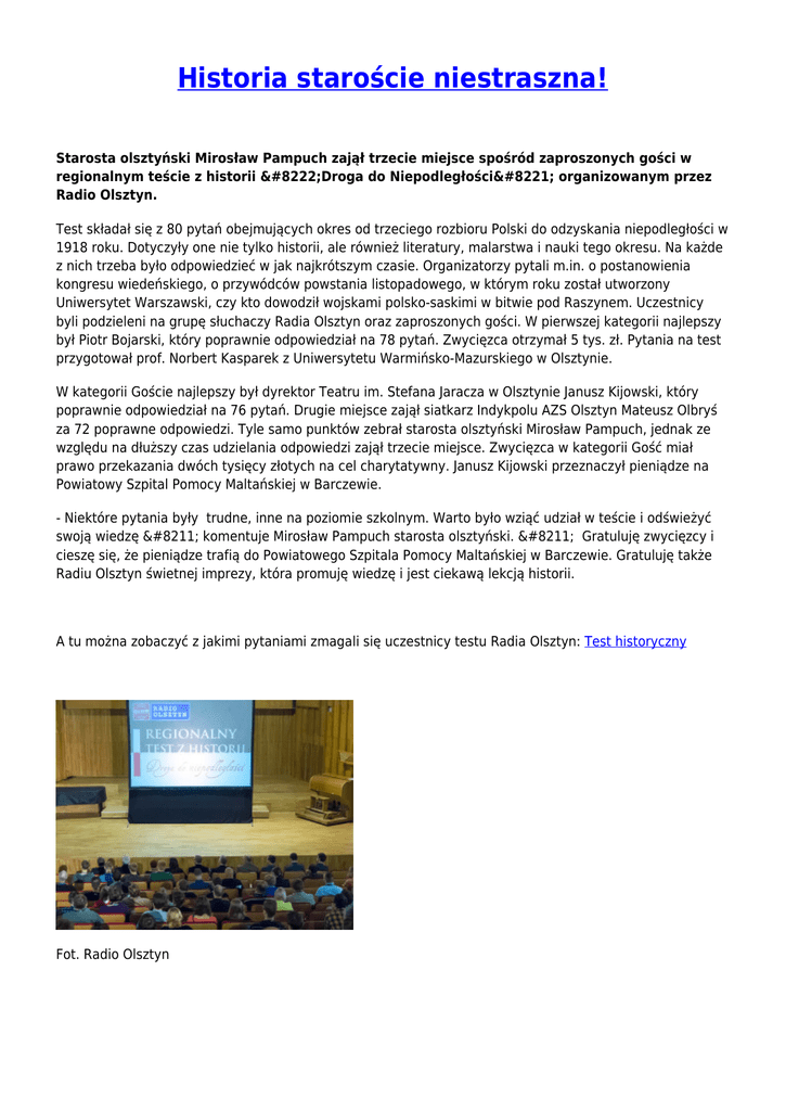Historia staroście niestraszna! Starosta olsztyński Mirosław Pampuch zajął trzecie miejsce spośród zaproszonych gości w regionalnym teście z historii „Droga do Niepodległości” organizowanym przez Radio Olsztyn. Test składał się z 80 pytań obejmujących okres od trzeciego rozbioru Polski do odzyskania niepodległości w 1918 roku. Dotyczyły one nie tylko historii, ale również literatury, malarstwa i nauki tego okresu. Na każde z nich trzeba było odpowiedzieć w jak najkrótszym czasie. Organizatorzy pytali m.in. o postanowienia kongresu wiedeńskiego, o przywódców powstania listopadowego, w którym roku został utworzony Uniwersytet Warszawski, czy kto dowodził wojskami polsko-saskimi w bitwie pod Raszynem. Uczestnicy byli podzieleni na grupę słuchaczy Radia Olsztyn oraz zaproszonych gości. W pierwszej kategorii najlepszy był Piotr Bojarski, który poprawnie odpowiedział na 78 pytań. Zwycięzca otrzymał 5 tys. zł. Pytania na test przygotował prof. Norbert Kasparek z Uniwersytetu Warmińsko-Mazurskiego w Olsztynie. W kategorii Goście najlepszy był dyrektor Teatru im. Stefana Jaracza w Olsztynie Janusz Kijowski, który poprawnie odpowiedział na 76 pytań. Drugie miejsce zajął siatkarz Indykpolu AZS Olsztyn Mateusz Olbryś za 72 poprawne odpowiedzi. Tyle samo punktów zebrał starosta olsztyński Mirosław Pampuch, jednak ze względu na dłuższy czas udzielania odpowiedzi zajął trzecie miejsce. Zwycięzca w kategorii Gość miał prawo przekazania dwóch tysięcy złotych na cel charytatywny. Janusz Kijowski przeznaczył pieniądze na Powiatowy Szpital Pomocy Maltańskiej w Barczewie. - Niektóre pytania były trudne, inne na poziomie szkolnym. Warto było wziąć udział w teście i odświeżyć swoją wiedzę – komentuje Mirosław Pampuch starosta olsztyński. – Gratuluję zwycięzcy i cieszę się, że pieniądze trafią do Powiatowego Szpitala Pomocy Maltańskiej w Barczewie. Gratuluję także Radiu Olsztyn świetnej imprezy, która promuję wiedzę i jest ciekawą lekcją historii. A tu można zobaczyć z jakimi pytaniami zmagali się uczestnicy testu Radia Olsztyn: Test historyczny Fot. Radio Olsztyn Drukuj