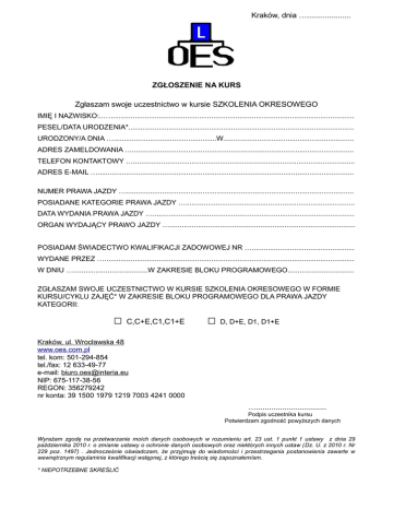 Kraków, dnia ….................... ZGŁOSZENIE NA KURS Zgłaszam swoje uczestnictwo w kursie SZKOLENIA OKRESOWEGO IMIĘ I NAZWISKO:..…......................................................................................................................... PESEL/DATA URODZENIA*................................................................................................................ URODZONY/A DNIA …...................................................W................................................................. ADRES ZAMELDOWANIA ….............................................................................................................. TELEFON KONTAKTOWY ….............................................................................................................. ADRES E-MAIL …............................................................................................................................... NUMER PRAWA JAZDY …................................................................................................................. POSIADANE KATEGORIE PRAWA JAZDY ….................................................................................... DATA WYDANIA PRAWA JAZDY ….................................................................................................... ORGAN WYDAJĄCY PRAWO JAZDY …............................................................................................ POSIADAM ŚWIADECTWO KWALIFIKACJI ZADOWOWEJ NR …................................................... WYDANE PRZEZ …............................................................................................................................ W DNIU ….....................................W ZAKRESIE BLOKU PROGRAMOWEGO................................. ZGŁASZAM SWOJE UCZESTNICTWO W KURSIE SZKOLENIA OKRESOWEGO W FORMIE KURSU/CYKLU ZAJĘĆ* W ZAKRESIE BLOKU PROGRAMOWEGO DLA PRAWA JAZDY KATEGORII: □ C,C+E,C1,C1+E □ D, D+E, D1, D1+E Kraków, ul. Wrocławska 48 www.oes.com.pl tel. kom: 501-294-854 tel./fax: 12 633-49-77 e-mail: [email protected] NIP: 675-117-38-56 REGON: 356279242 nr konta: 39 1500 1979 1219 7003 4241 0000 …................................ Podpis uczestnika kursu Potwierdzam zgodność powyższych danych Wyrażam zgodę na przetwarzanie moich danych osobowych w rozumieniu art. 23 ust. 1 punkt 1 ustawy z dnia 29 października 2010 r. o zmianie ustawy o ochronie danych osobowych oraz niektórych innych ustaw (Dz. U. z 2010 r. Nr 229 poz. 1497) . Jednocześnie oświadczam, że przyjmuję do wiadomości i przestrzegania postanowienia zawarte w wewnętrznym regulaminie kwalifikacji wstępnej, z którego treścią się zapoznałem/am. * NIEPOTRZEBNE SKREŚLIĆ
