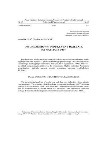 Nr 65 Prace Naukowe Instytutu Maszyn, Napędów i Pomiarów Elektrycznych Politechniki Wrocławskiej Nr 65 Studia i Materiały Nr 31 2011 indukcyjny dzielnik napięcia, dwurdzeniowe dzielniki napięcia, układy do sprawdzania dzielników. Daniel DUSZA*, Zdzisław NAWROCKI* DWURDZENIOWY INDUKCYJNY DZIELNIK NA NAPIĘCIE 300V Przedstawiono analizę metrologiczną jednordzeniowego i dwurdzeniowego indukcyjnego dzielnika napięcia. Opisano konstrukcję opracowanego i wykonanego dwurdzeniowego indukcyjnego dzielnika na napięcie 300 V o przekładni 1000:1. Omówiono układ kompensacyjno-różnicowy do wyznaczania błędów dzielnika. Wykonany dwurdzeniowy dzielnik napięcia spełnia wymagania stawiane przekładnikom kl. 0,005. DUAL-CORE 300V INDUCTIVE VOLTAGE DIVIDER The metrological analysis of single-core and dual-core inductive voltage divider was presented. The structure of designed and constructed dual-core 300 V inductive voltage divider with ratio 1000:1 was described. The compensating differential circuit for the determination of divider errors was discussed. The constructed dual-core voltage divider fulfills the requirements for instrument transformers class 0.005. __________ * Politechnika Wrocławska, Instytut Maszyn, Napędów I Pomiarów Elektrycznych, ul. Smoluchowskiego 19, 50-372 Wrocław, [email protected], [email protected]