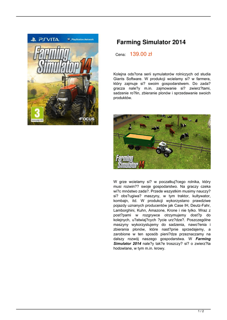Farming Simulator 2014 Cena: 139.00 zł Kolejna ods?ona serii symulatorów rolniczych od studia Giants Software. W produkcji wcielamy si? w farmera, który zajmuje si? swoim gospodarstwem. Do zada? gracza nale?y m.in. zajmowanie si? zwierz?tami, sadzenie ro?lin, zbieranie plonów i sprzedawanie swoich produktów. W grze wcielamy si? w poczatkuj?cego rolnika, który musi rozwin?? swoje gospodarstwo. Na graczy czeka wi?c mnóstwo zada?. Przede wszystkim musimy nauczy? si? obs?ugiwa? maszyny, w tym traktor, kultywator, kombajn, itd. W produkcji wykorzystano prawdziwe pojazdy uznanych producentów jak Case IH, Deutz-Fahr, Lamborghini, Kuhn, Amazone, Krone i nie tylko. Wraz z post?pami w rozgrywce otrzymujemy dost?p do kolejnych, u?atwiaj?cych ?ycie urz?dze?. Poszczególne maszyny wykorzystujemy do sadzenia, nawo?enia i zbierania plonów, które nast?pnie sprzedajemy, a zarobione w ten sposób pieni?dze przeznaczamy na dalszy rozwój naszego gospodarstwa. W Farming Simulator 2014 nale?y tak?e troszczy? si? o zwierz?ta hodowlane, w tym m.in. krowy. 1/2 Rozgrywka wbrew pozorom nie jest skierowana tylko do najwi?kszych mi?o?ników rolnictwa. Twórcy zatroszczyli si? bowiem o szereg u?atwie?, dzi?ki czemu rado?? z prowadzenia w?asnego gospodarstwa mog? czerpa? tak?e osoby niezaznajomione z tematem. Program na pocz?tku wyja?nia wszystkie zasady rz?dz?ce gr?, a w pó?niejszym czasie umo?liwia np. zatrudnienie pomocnika, który za odpowiedni? op?at? wyr?czy nas w pracy. Zobacz wideo: Szczegóły wersja językowa polska 2/2 Powered by TCPDF (www.tcpdf.org)