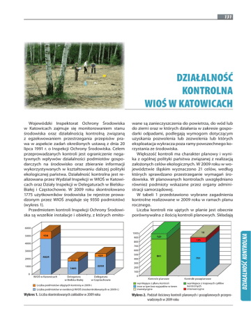 131 DZIAŁALNOŚĆ KONTROLNA WIOŚ W KATOWICACH wane są zanieczyszczenia do powietrza, do wód lub do ziemi oraz w których działania w zakresie gospodarki odpadami, podlegają wymogom dotyczącym uzyskania pozwolenia lub zezwolenia lub których eksploatacja wykracza poza ramy powszechnego korzystania ze środowiska. Większość kontroli ma charakter planowy i wynika z ogólnej polityki państwa związanej z realizacją założonych celów ekologicznych. W 2009 roku w województwie śląskim wyznaczono 21 celów, według których sprawdzano przestrzeganie wymagań środowiska. W planowanych kontrolach uwzględniano również podmioty wskazane przez organy administracji samorządowej. W tabeli 1 przedstawiono wybrane zagadnienia kontrolne realizowane w 2009 roku w ramach planu rocznego. Liczba kontroli nie ujętych w planie jest obecnie porównywalna z ilością kontroli planowych. Składają Wykres 1.Liczba skontrolowanych zakładów w 2009 roku Wykres 2. Podział ilościowy kontroli planowych i pozaplanowych przeprowadzonych w 2009 roku DZIAŁALNOŚĆ KONTROLNA Wojewódzki Inspektorat Ochrony Środowiska w Katowicach zajmuje się monitorowaniem stanu środowiska oraz działalnością kontrolną związaną z egzekwowaniem przestrzegania przepisów prawa w aspekcie zadań określonych ustawą z dnia 20 lipca 1991 r. o Inspekcji Ochrony Środowiska. Celem przeprowadzanych kontroli jest ograniczenie negatywnych wpływów działalności podmiotów gospodarczych na środowisko oraz zbieranie informacji wykorzystywanych w kształtowaniu dalszej polityki ekologicznej państwa. Działalność kontrolna jest realizowana przez Wydział Inspekcji w WIOŚ w Katowicach oraz Działy Inspekcji w Delegaturach w BielskuBiałej i Częstochowie. W 2009 roku skontrolowano 1775 użytkowników środowiska (w rejestrze prowadzonym przez WIOŚ znajduje się 9350 podmiotów) (wykres 1). Przedmiotem kontroli Inspekcji Ochrony Środowiska są wszelkie instalacje i obiekty, z których emito- 132 Tabela 1. Wybrane zadania kontrolne zrealizowane w 2009 roku w ramach planu rocznego (bez kontroli pozaplanowych) Liczba zakładów w których stwierdzono naruszenie procent skontrolowanych zakładów, w których stwierdzono naruszenie Cel kontrolny Liczba kontroli 1. Ocena prawidłowości naliczania oraz wnoszenia opłat za korzystanie ze środowiska 591 585 273 46,7 2. Wypełnianie wymagań ochrony środowiska w zakresie ochrony powietrza 478 476 178 37,4 3. Wypełnianie wymagań ochrony środowiska w zakresie ochrony wód przed zanieczyszczeniem 516 510 250 49,0 4. Wypełnianie wymagań ochrony środowiska w zakresie ochrony przed hałasem 166 166 42 25,3 5. Wypełnianie wymagań ochrony środowiska w zakresie gospodarki odpadami w zakładach przemysłowych (bez WEEE, stacji demontażu i składowisk odpadów komunalnych) 578 573 391 68,2 6. Wypełnianie wymagań ochrony środowiska w zakresie poboru wód podziemnych 19 19 4 21,1 7. Wypełnianie wymagań ochrony środowiska w zakresie ochrony przez promieniowaniem elektromagnetycznym 10 10 1 10,0 się na nią kontrole interwencyjne, na wniosek przedsiębiorstw oraz kontrole nie wymagające wyjazdów w teren, przeprowadzane w oparciu o przedłożoną dokumentację np. samokontrolnych wyników badań wpływu na środowisko, pomiarów emisji, dokumentacji przekazanych przez podmiot wnioskujący o wydanie zaświadczenia lub opinii, weryfikacji raportów PRTR (do Krajowego Rejestru Uwalniania i Transferu Zanieczyszczeń) (wykres 2). W roku 2009 nastąpiła poprawa realizacji wymogów ochrony środowiska w branży komunalnych oczyszczalni ścieków. W porównaniu z rokiem 2008 wzrosła nieznacznie ilość oddawanych do użytku inwestycji związanych z modernizacją istniejących komunalnych oczyszczalni ścieków, powodując jednocześnie poprawę stanu jakości wód powierzchniowych w obrębie aglomeracji miejskich. Planowane inwestycje związane z modernizacją istniejącej gospodarki ściekami komunalnymi na terenach gmin, już na etapie projektów przewidywały rozwiązania problemów gospodarki ściekami komunalnymi nie tylko w zasięgu lokalnym (ograniczającym się do jednej miejscowości lub gminy) lecz w zakresie rozszerzającym się do granic powołanych do istnienia aglomeracji lub obszarów zlewni rzek. Jednocześnie w sektorze gospodarki ściekami przemysłowymi nastąpiło niewielkie pogorszenie stanu realizacji wymogów ochrony środowiska w zakresie jakości ścieków odprowadzanych do wód lub do ziemi. W znaczącej mierze przyczyną takiego stanu rzeczy jest prowadzenie w sposób niewłaściwy eksploatacji urządzeń infrastruktury przemysłowych skontrolowanych oczyszczalni ścieków. Brak odpowiednio wykwalifikowanej kadry zatrudnionej do obsługi wspomnianych urządzeń oraz brak wiedzy w zakresie wymagań, jakie powinny spełniać ścieki wprowadzane do środowiska, warunkuje nieprawidłową pracę urządzeń zabezpieczających środowisko przed zanieczyszczeniem ściekami przemysłowymi. Ogółem na 1892 przeprowadzone kontrole, stwierdzono nieprawidłowości w ponad 900 przypadkach. Wskaźnik naruszeń nie uległ jednak istotnym zmianom w stosunku do roku 2008. Obecnie dla lepszego zobrazowania nieprzestrzegania wymagań ochrony środowiska wprowadzono podział według kategorii naruszeń, tj.: • kategoria 1 – brak realizacji lub naruszenie obowiązków, niezwiązanych z bezpośrednim oddziaływaniem na środowisko, wynikających z mocy prawa i decyzji administracyjnych (np. brak ewidencji, brak przekazywania wyników pomiarów, brak wykonywania pomiarów), • kategoria 2 – naruszenie warunków pozwoleń, zezwoleń lub zgłoszeń określających warunki korzystania ze środowiska, • kategoria 3 – brak uregulowań formalno-prawnych korzystania ze środowiska, nieprzestrzeganie przepisów dotyczących zapobiegania, usuwania lub ograniczania skutków poważnych awarii przemysłowych, • kategoria 4 – zanieczyszczenie środowiska spowodowane