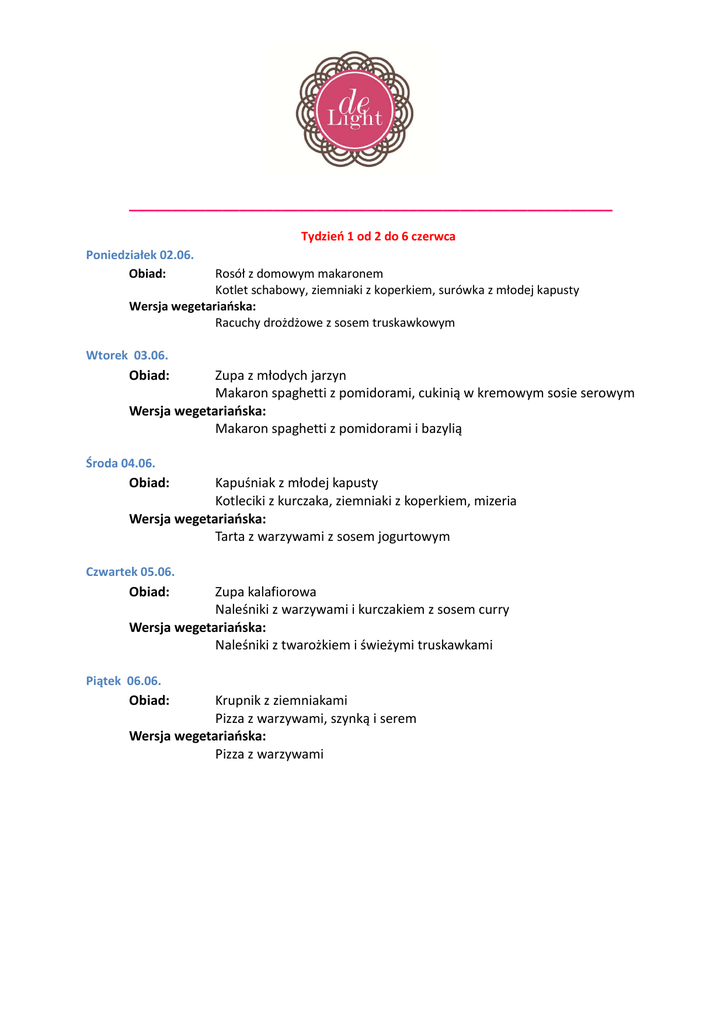 _________________________________________________________ Tydzień 1 od 2 do 6 czerwca Poniedziałek 02.06. Obiad: Rosół z domowym makaronem Kotlet schabowy, ziemniaki z koperkiem, surówka z młodej kapusty Wersja wegetariańska: Racuchy drożdżowe z sosem truskawkowym Wtorek 03.06. Zupa z młodych jarzyn Makaron spaghetti z pomidorami, cukinią w kremowym sosie serowym Wersja wegetariańska: Makaron spaghetti z pomidorami i bazylią Obiad: Środa 04.06. Kapuśniak z młodej kapusty Kotleciki z kurczaka, ziemniaki z koperkiem, mizeria Wersja wegetariańska: Tarta z warzywami z sosem jogurtowym Obiad: Czwartek 05.06. Zupa kalafiorowa Naleśniki z warzywami i kurczakiem z sosem curry Wersja wegetariańska: Naleśniki z twarożkiem i świeżymi truskawkami Obiad: Piątek 06.06. Krupnik z ziemniakami Pizza z warzywami, szynką i serem Wersja wegetariańska: Pizza z warzywami Obiad: _________________________________________________________ Tydzień 2 od 9 do 13 czerwca Poniedziałek 09.06. Zupa pomidorowa z makaronem Bitki z szynki z warzywami, kasza jęczmienna, warzywa gotowane na parze Wersja wegetariańska: Gulasz warzywny, kasza jęczmienna, warzywa gotowane na parze Obiad: Wtorek 10.06. Zupa ogórkowa na drobiu Pulpeciki w sosie pomidorowym, ziemniaki z koperkiem, fasolka szparagowa Wersja wegetariańska: Zapiekanka warzywna z sosem pomidorowym Obiad: Środa 11.06 Zupa rosół z domowym makaronem Pierogi z twarożkiem Wersja wegetariańska: Pierogi z truskawkami Obiad: Czwartek 12.06. Obiad: Krem z brokuł z grzankami Kurczak pieczony, młode ziemniaczki z koperkiem, surówka z młodej kapusty Wersja wegetariańska: Tarta z warzywami z zielonym sosem jogurtowym Piątek 13.06. Zupa pomidorowa z kluseczkami Spaghetti bolognese z serem Danie wegetariańskie: Makaron z twarożkiem i truskawkami Obiad: _________________________________________________________ Tydzień 3 od 16 do 20 czerwca Poniedziałek 16.06. Zupa koperkowa z kaszą manną Filet z kurczaka w cieście, młode ziemniaki z koperkiem, warzywa gotowane Wersja wegetariańska: Warzywa w cieście, młode ziemniaki z koperkiem Obiad: Wtorek 17.06. Krem z warzyw Pieczeń wieprzowa w sosie pieczeniowym, kasza gryczana, surówka z ogórków kiszonych Wersja wegetariańska: Ryż z truskawkami i śmietaną Obiad: Środa 18.06. Zupa jarzynowa z ziemniakami Pieczeń z karkówki w sosie śliwkowym, kopytka, sałatka z buraczków Danie wegetariańskie: Racuchy z sosem malinowym Obiad: _________________________________________________________ Tydzień 4 od 23 do 27 czerwca Poniedziałek 23.06 Obiad: Kapuśniak z młodej kapusty Pulpeciki w sosie koperkowym, ziemniaki puree, sałata w śmietanie Wersja wegetariańska: Kotleciki z cukinii, ziemniaki puree, sałata w śmietanie Wtorek 24.06. Obiad: Jarzynowa z młodych warzyw Gołąbki w sosie pomidorowym, ziemniaki z koperkiem, warzywa na ciepło Danie wegetariańskie: Gołąbki warzywne w sosie pomidorowym, ziemniaki z koperkiem, warzywa na ciepło Środa 25.06. Obiad: Rosół z domowym makaronem Spaghetti z kurczakiem, warzywami w delikatnym sosie serowym Wersja wegetariańska: Spaghetti z warzywami w delikatnym sosie pomidorowym Czwartek 26.06. Obiad: Zupa owocowa z makaronem Pierogi ruskie z cebulką Danie wegetariańskie: Pierogi z owocami z sosem waniliowym NAPOJE Do wszystkich śniadań dzieci mają do wyboru: mleko, kakao, herbatkę owocową. Do wszystkich obiadów do wyboru herbatka owocowa lub kompot. ZAMÓWIENIA prosimy składać drogą mailową na adres: [email protected]
