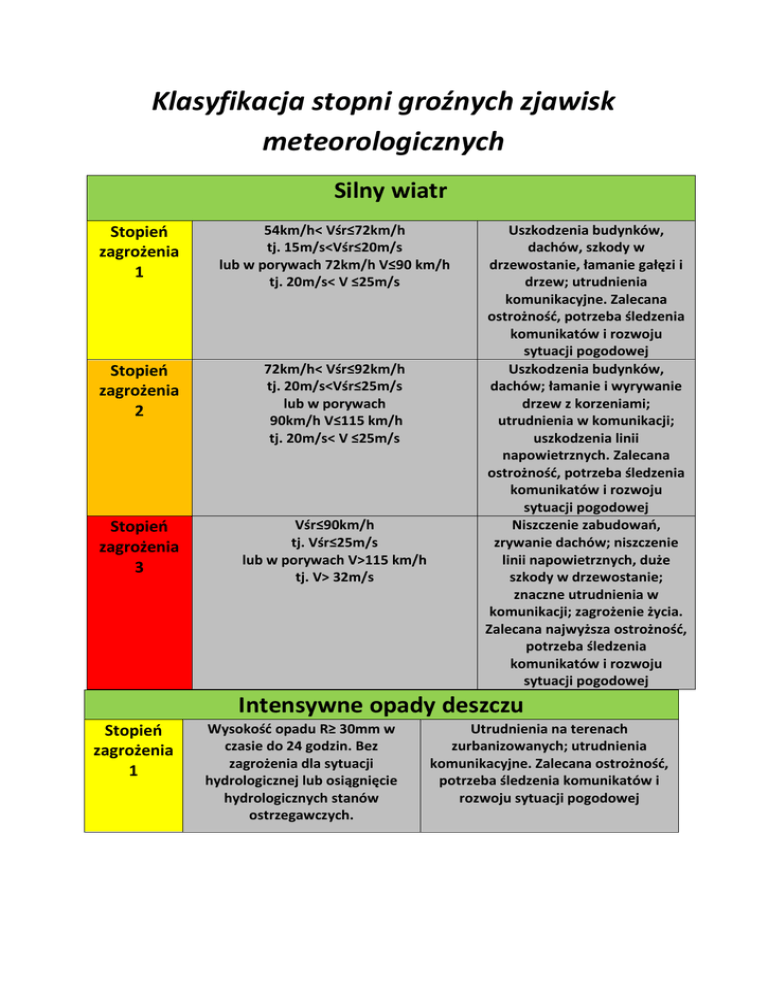 Klasyfikacja stopni groźnych zjawisk meteorologicznych Silny wiatr Stopień zagrożenia 1 54km/h< Vśr≤72km/h tj. 15m/s<Vśr≤20m/s lub w porywach 72km/h V≤90 km/h tj. 20m/s< V ≤25m/s Stopień zagrożenia 2 72km/h< Vśr≤92km/h tj. 20m/s<Vśr≤25m/s lub w porywach 90km/h V≤115 km/h tj. 20m/s< V ≤25m/s Stopień zagrożenia 3 Vśr≤90km/h tj. Vśr≤25m/s lub w porywach V>115 km/h tj. V> 32m/s Uszkodzenia budynków, dachów, szkody w drzewostanie, łamanie gałęzi i drzew; utrudnienia komunikacyjne. Zalecana ostrożność, potrzeba śledzenia komunikatów i rozwoju sytuacji pogodowej Uszkodzenia budynków, dachów; łamanie i wyrywanie drzew z korzeniami; utrudnienia w komunikacji; uszkodzenia linii napowietrznych. Zalecana ostrożność, potrzeba śledzenia komunikatów i rozwoju sytuacji pogodowej Niszczenie zabudowań, zrywanie dachów; niszczenie linii napowietrznych, duże szkody w drzewostanie; znaczne utrudnienia w komunikacji; zagrożenie życia. Zalecana najwyższa ostrożność, potrzeba śledzenia komunikatów i rozwoju sytuacji pogodowej Intensywne opady deszczu Stopień zagrożenia 1 Wysokość opadu R≥ 30mm w czasie do 24 godzin. Bez zagrożenia dla sytuacji hydrologicznej lub osiągnięcie hydrologicznych stanów ostrzegawczych. Utrudnienia na terenach zurbanizowanych; utrudnienia komunikacyjne. Zalecana ostrożność, potrzeba śledzenia komunikatów i rozwoju sytuacji pogodowej Stopień zagrożenia 2 1.Wystąpienie opadu 50mm ≤ R < 90mm w czasie do 24 godzin lub 2. Wysokość opadu R≥ 30mm w czasie do 24 godzin. Osiągnięcie hydrologicznych stanów alarmowych. Podtopienia, uszkodzenia dróg i budynków, trudności komunikacyjne. Zalecana ostrożność, potrzeba śledzenia komunikatów i rozwoju sytuacji pogodowej Stopień zagrożenia 3 Wystąpienie opadów R≥90mm w czasie do 24 godzin. Powodzenie, podtopienia, zniszczenia zabudowań, dróg, mostów, duże trudności komunikacyjne; zagrożenie życia. Zalecana najwyższa ostrożność, potrzeba śledzenia komunikatów i rozwoju sytuacji pogodowej Upały Stopień zagrożenia 1 Tmax≥ 30°C i czas trwania zjawiska 2 lub 3 dni na przeważającym obszarze Stopień zagrożenia 2 Tmax≥ 30°C i czas trwania zjawiska 4 lub 5 dni na przeważającym obszarze Stopień zagrożenia 3 Tmax≥ 30°C i czas trwania zjawiska. 5 dni na przeważającym obszarze Ryzyko udaru słonecznego; uszkodzenia asfaltowych nawierzchni dróg; wzrost zagrożenia pożarowego. Zalecana ostrożność, potrzeba śledzenia komunikatów i rozwoju sytuacji pogodowej Duże ryzyko udaru słonecznego; zagrożenie życia; uszkodzenia asfaltowych nawierzchni dróg, duże zagrożenie pożarowe. Zalecana ostrożność, potrzeba śledzenia komunikatów i rozwoju sytuacji pogodowej Bardzo duże ryzyko udaru słonecznego; zagrożenie życia; uszkodzenia asfaltowych nawierzchni dróg, duże zagrożenie pożarowe. Zalecana najwyższa ostrożność, potrzeba śledzenia komunikatów i rozwoju sytuacji pogodowej Burze/Burze z gradem stopień a) Burze z opadami deszczu 20mm <R≤ Zakłócenia w pracy urządzeń zagrożenia 1 30mm, możliwe opady deszczu do 40mm w okresie trwania zjawisk burzowych b) lub/i porywy wiatru 72km/h V≤90 km/h tj. 20m/s< V ≤25m/s Stopień zagrożenia 2 Stopień zagrożenia 3 Nie stosuje się elektrycznych, zagrożenia pożarowe, zagrożenie życia od uderzenia piorunów. Zalecana ostrożność, potrzeba śledzenia komunikatów i rozwoju sytuacji pogodowej Nie stosuje się Nie stosuje się Nie stosuje się Burze z gradem/Silne burze z gradem Stopień zagrożenia 1 Stopień zagrożenia 2 Stopień zagrożenia 3 nie stosuje się nie stosuje się a) Burze z opadami deszczu 30mm <R≤ 50mm, możliwe opady deszczu do 60mm w okresie trwania zjawisk burzowych b) lub/i porywy wiatru 90km/h V≤115 km/h tj. 25m/s< V ≤32m/s a) Burze z opadami deszczu R> 50mm w okresie trwania zjawisk burzowych b) lub/i porywy wiatru V>115 km/h tj.V>32m/s Szkody w drzewostanie; utrudnienia w komunikacji; uszkodzenia budynków; straty w uprawach rolnych; zakłócenie pracy urządzeń elektrycznych; zagrożenie życia powodowane uderzeniami piorunów. Zalecana ostrożność, potrzeba śledzenia komunikatów i rozwoju sytuacji pogodowej Duże zniszczenia drzewostanu, drzewa połamane lub powyrywane z korzeniami; duże trudności komunikacyjne, uszkodzenia budynków, zrywanie dachów, zniszczenia upraw rolnych, zagrożenie życia powodowane wiatrem, uderzeniami piorunów; zagrożenie pożarowe, uszkodzenia urządzeń elektrycznych i obiektów energetycznych. Zalecana najwyższa ostrożność, potrzeba częstego śledzenia komunikatów i rozwoju sytuacji pogodowej Opady marznące Stopień zagrożenia 1 Stopień zagrożenia 2 Słabe opady marznącej mżawki lub deszczu 1.Umiarkowane opady marznącej mżawki lub deszczu lub 2. Słabe opady marznącej mżawki lub Gołoledź; śliskość dróg, jezdni i chodników; utrudnienia komunikacyjne Gołoledź; trudności komunikacyjne; oblodzenie dróg, utrudnienia w ruchu pieszym; uszkodzenia deszczu trwające w jednym miejscu powyżej 12h Stopień 1. Silne opady marznącego deszczu lub zagrożenia mżawki 3 2. Słabe opady marznącej mżawki lub deszczu trwające w jednym miejscu powyżej 12h drzewostanu i linii napowietrznych. Gołoledź; szybkie oblodzenie dróg; duże trudności komunikacyjne i w ruchu pieszym; uszkodzenia drzewostanu i linii napowietrznych Zawieje i zamiecie śnieżne Stopień zagrożenia 1 Stopień zagrożenia 2 Stopień zagrożenia 3 Nie stosuje się Zamiecie i zawieje śnieżne- na przeważającym obszarze, gdy zaistnieją łącznie następujące warunki: a. niestabilna pokrywa śnieżna b. wiatr o prędkości 29 km/h Vśr ≤40km/h tj. 8m/s <Vśr≤ 11m/s lub/i w porywach 54km/h V≤ 72km/h tj.15m/s<V≤ 20m/s c. opady śniegu przy zawiejach śnieżnych Zamiecie i zawieje śnieżne- na przeważającym obszarze, gdy zaistnieją łącznie następujące warunki: a. niestabilna pokrywa z suche