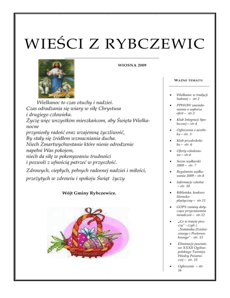 WIEŚCI Z RYBCZEWIC WIOSNA 2009 W AśNE TEMATY : Wielkanoc to czas otuchy i nadziei. Czas odradzania się wiary w siłę Chrystusa i drugiego człowieka. śyczę więc wszystkim mieszkańcom, aby Święta Wielkanocne przyniosły radość oraz wzajemną Ŝyczliwość, By stały się źródłem wzmacniania ducha. Niech Zmartwychwstanie które niesie odrodzenie napełni Was pokojem, niech da siłę w pokonywaniu trudności i pozwoli z ufnością patrzeć w przyszłość. Zdrowych, ciepłych, pełnych radosnej nadziei i miłości, przeŜytych w zdrowiu i spokoju Świąt Ŝyczy Wójt Gminy Rybczewice. • Wielkanoc w tradycji ludowej— str.2 • PPWOW zawiadomienie o wyborze ofert— str.3 • Klub Integracji Społecznej—str.4 • Ogłoszenia o aerobiku—str. 5 • Klub przedszkolaka— str. 6 • Oferty szkoleniowe—str.6 • Sezon wędkarski 2009— str. 7 • Regulamin wędkowania 2009—str.8 • Informacje szkolne —str. 10 • Biblioteka, konkurs literackoplastyczny— str.11 • GOPS zmiany dotyczące przyznawania świadczeń— str.12 • „Co w trawie piszczy” - czyli z „Notatnika Dzielnicowego i Posterunkowego” - str. 13 • Eliminacje powiatowe XXXII Ogólnopolskiego Turnieju Wiedzy PoŜarniczej— str. 15 • Ogłoszenie —str. 16 S TR . 2 WIEŚCI Z RYBCZEWIC Wielkanoc w tradycji ludowej Wśród dorocznych zwyczajów ludowych poczesne miejsce zajmują obrzędy związane z okresem wiosny. Na jej początek, tego roku, przypada - Wielkanoc. Obrzędy te wiąŜą się z nadzieją na pomyślność zbiorów, dobytku, ludzi oraz gospodarstwa. Spora część odwiecznych obrzędów zachowała się w kulturze do naszych czasów, jednak zatracają one swój pierwotny sens i charakter. Okres zwyczajów wielkanocnych rozpoczyna się począwszy od Niedzieli Palmowej, podczas której święci się jeszcze powszechnie wykonywane a zwłaszcza na wsiach strojne palmy - wykonane ze świeŜych gałązek wierzbowych, leszczynowych, trzciny wodnej, barwinku, borówek, widłaku lub bukszpanu. W tradycji ludowej święcone palmy pieczołowicie przechowywano w mieszkaniu za obrazem, gdyŜ według wierzeń miały one magiczną moc leczniczą oraz ochronną przed piorunami. Na wsiach palmą klepano bydło podczas pierwszego wypędzania na pastwisko, Ŝeby dobrze się chowało. Dzieci natomiast połykały kotki z wierzby ze święconej palmy, Ŝeby w przyszłości gardło nie bolało. Po Niedzieli Palmowej natomiast bieliło się mieszkanie, stroiło kwiatkami z bibuły, robiło porządek w obejściu i na podwórku. Wielki Tydzień poprzedzający Wielkanoc był i dotychczas pozostał porą rozlicznych, róŜnorakich przygotowań do wielkiego święta. Obfitował, więc zarówno w obrzędy kościelne, jak i zwyczaje domowe. Do Wielkiego Czwartku musiał być upieczony przede wszystkim chleb na święta. W Wielki Piątek milkły w kościołach dzwony i dzwonki, zastępowały je drewniane kołatki. Miały one róŜne kształty: w formie deseczki z ruchomym młoteczkiem, w formie kilku deszczułek umieszczonych na sznurku, czy w kształcie kołka zębatego, po którym obracała się spręŜynująca, cienka deseczka. Ponadto w Wielki Piątek malowano pisanki, szykowano potrawy i jadło do święcenia (czyli do tradycyjnego koszyczka). Do malowania pisanek uŜywano niegdyś barwników roślinnych. Kolor czerwony otrzymywano przez gotowanie cebuli, zielony z młodych pędów Ŝyta, brązowy z szyszek olszyny. Wzory pisano woskiem na czystych jajkach, a potem wkładano je do farby. Panny robiły pisanki i dawały je swoim kawalerom, teraz mało kto potrafi pisać jajka woskiem. Jajko - jako symbol wciąŜ odradzającego się Ŝycia, było zawsze obiektem kultu i magicznym środkiem w obrzędach ludu. Innym, waŜnym momentem w obrzędowości wielkanocnej jest w Wielką Sobotę święcenie wody, ognia oraz przede wszystkim jadła, na które to dawniej składały się niemal wszystkie potrawy spoŜywane w dzień Wielkanocy. Ówcześnie „święcone”, to tylko symboliczny zestaw potraw mieszczących się w ozdobnym, małym koszyczku. W Niedzielę Wielkanocną wszyscy domownicy uczestniczyli w uroczystej Rezurekcji. Po niej kaŜdy chłop starał się wracać jak najszybciej do domu, co oznaczało, Ŝe będzie przodował we wsi, jako najlepszy gospodarz. Po powrocie do domu brał wodę święconą, święcił całe obejście, zwierzęta (oprócz świń gdyŜ nie było ich przy Ŝłóbku Pana Jezusa), dom i wszystkich domowników, natomiast w Poniedziałek Wielkanocny z rana święcił pola a o świcie w łóŜkach jeszcze śpiące dzieci. W Niedzielę Wielkanocną, po powrocie z Rezurekcji, wszyscy dzielili się jajkiem święconym i innymi potrawami. Skorupki ze święconych jaj gospodyni wynosiła kurom po to, by się dobrze niosły i nie rozchodziły do sąsiadów. W Niedzielę Wielkanocną nie odwiedzało się zarówno rodziny ani znajomych. Dopiero począwszy od „śmigusa dyngusa”, „lejusa” czy teŜ „lanego poniedziałkiem” czyli Poniedziałku Wielkanocnego moŜna było się gościć i to przez cały tydzień. W tym dniu tym od dawna praktykowane było powszechne, wzajemne oblewanie się wodą, chociaŜ chłopcy częściej oblewali dziewczęta niŜ odwrotnie. Dawniej, gdy Wielkanoc była zazwyczaj ciepła, zdarzało się, Ŝe schwytane dziewczyny oblewano pełnymi wiadrami wody. Często do oblewania słuŜyły specjalnie skonstruowane sikawki, wykonane z drewna, osiągające niekiedy znaczne rozmiary: długość do jednego metra, średnica do dziesięciu centymetrów. Dawniej, gdy dziewczyna chciała wykupić się od „lejusa”, musiała podarować pisankę. Jednak większość dziewczyn chciała być mocno oblana wodą, bo która panna nie była oblana, oznaczało, Ŝe nie ma powodzenia lub nie jest lubiana. Dziewczyny uciekając często - zamykały się w obawie przed oblaniem wodą, co dodawało nieco dramaturgii, jednak skrycie marzyły o oblaniu przez chłopców, to wróŜyło im sz