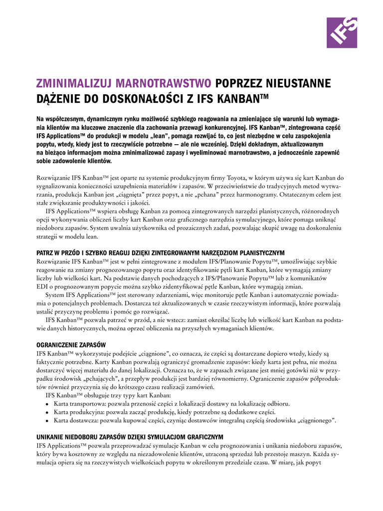 ZMINIMALIZUJ MARNOTRAWSTWO POPRZEZ NIEUSTANNE DĄŻENIE DO DOSKONAŁOŚCI Z IFS KANBANTM Na współczesnym, dynamicznym rynku możliwość szybkiego reagowania na zmieniające się warunki lub wymagania klientów ma kluczowe znaczenie dla zachowania przewagi konkurencyjnej. IFS Kanban™, zintegrowana część IFS Applications™ do produkcji w modelu „lean”, pomaga rozwijać to, co jest niezbędne w celu zaspokojenia popytu, wtedy, kiedy jest to rzeczywiście potrzebne — ale nie wcześniej. Dzięki dokładnym, aktualizowanym na bieżąco informacjom można zminimalizować zapasy i wyeliminować marnotrawstwo, a jednocześnie zapewnić sobie zadowolenie klientów. Rozwiązanie IFS Kanban™ jest oparte na systemie produkcyjnym firmy Toyota, w którym używa się kart Kanban do sygnalizowania konieczności uzupełnienia materiałów i zapasów. W przeciwieństwie do tradycyjnych metod wytwarzania, produkcja Kanban jest „ciągnięta” przez popyt, a nie „pchana” przez harmonogramy. Ostatecznym celem jest stałe zwiększanie produktywności i jakości. IFS Applications™ wspiera obsługę Kanban za pomocą zintegrowanych narzędzi planistycznych, różnorodnych opcji wykonywania obliczeń liczby kart Kanban oraz graficznego narzędzia symulacyjnego, które pomaga uniknąć niedoboru zapasów. System uwalnia użytkownika od prozaicznych zadań, pozwalając skupić uwagę na doskonaleniu strategii w modelu lean. PATRZ W PRZÓD I SZYBKO REAGUJ DZIĘKI ZINTEGROWANYM NARZĘDZIOM PLANISTYCZNYM Rozwiązanie IFS Kanban™ jest w pełni zintegrowane z modułem IFS/Planowanie Popytu™, umożliwiając szybkie reagowanie na zmiany prognozowanego popytu oraz identyfikowanie pętli kart Kanban, które wymagają zmiany liczby lub wielkości kart. Na podstawie danych pochodzących z IFS/Planowanie Popytu™ lub z komunikatów EDI o prognozowanym popycie można szybko zidentyfikować pętle Kanban, które wymagają zmian. System IFS Applications™ jest sterowany zdarzeniami, więc monitoruje pętle Kanban i automatycznie powiadamia o potencjalnych problemach. Dostarcza też aktualizowanych w czasie rzeczywistym informacji, które pozwalają ustalić przyczynę problemu i pomóc go rozwiązać. IFS Kanban™ pozwala patrzeć w przód, a nie wstecz: zamiast określać liczbę lub wielkość kart Kanban na podstawie danych historycznych, można oprzeć obliczenia na przyszłych wymaganiach klientów. OGRANICZENIE ZAPASÓW IFS Kanban™ wykorzystuje podejście „ciągnione”, co oznacza, że części są dostarczane dopiero wtedy, kiedy są faktycznie potrzebne. Karty Kanban pozwalają ograniczyć gromadzenie zapasów: kiedy karta jest pełna, nie można dostarczyć więcej materiału do danej lokalizacji. Oznacza to, że w zapasach związane jest mniej gotówki niż w przypadku środowisk „pchających”, a przepływ produkcji jest bardziej równomierny. Ograniczenie zapasów półproduktów również przyczynia się do krótszego czasu realizacji zamówień. IFS Kanban™ obsługuje trzy typy kart Kanban: l Karta transportowa: pozwala przenosić części z lokalizacji dostawy na lokalizację odbioru. l Karta produkcyjna: pozwala zacząć produkcję, kiedy potrzebne są dodatkowe części. l Karta dostawcza: pozwala kupować części, czyniąc dostawców integralną częścią środowiska „ciągnionego”. UNIKANIE NIEDOBORU ZAPASÓW DZIĘKI SYMULACJOM GRAFICZNYM IFS Applications™ pozwala przeprowadzać symulacje Kanban w celu prognozowania i unikania niedoboru zapasów, który bywa kosztowny ze względu na niezadowolenie klientów, utraconą sprzedaż lub przestoje maszyn. Każda symulacja opiera się na rzeczywistych wielkościach popytu w określonym przedziale czasu. W miarę, jak popyt redukuje zapasy, system automatycznie wyzwala ich uzupełnienie według podanych parametrów obwodu Kanban. Jeśli symulacja rozpozna niedobór zapasów, system automatycznie zwiększa wielkość zapasu i powtarza testy, aż symulacja zakończy się pomyślnie. Po przeprowadzeniu symulacji można wygenerować główny raport planowania Kanban, który podsumowuje zalecane zmiany. Raport ten pomaga zdecydować, jak wyregulować ilości w danej pętli Kanban przed zaakceptowaniem zmian i wdrożeniem ich w produkcji. Ułatwia też identyfikowanie potencjalnych przeszkód w przepływie części przez zakład produkcyjny. PROJEKTOWANIE ŚRODOWISKA KANBAN ZGODNIE Z POTRZEBAMI FIRMY IFS Applications™ pozwala stworzyć środowisko Kanban dostosowane do specyficznych potrzeb biznesowych. Można wybrać jeden z trzech typów uzupełniania: wizualne, elektroniczne lub automatyczne. Przy uzupełnianiu wizualnym proces jest kontrolowany ręcznie. Przy uzupełnianiu elektronicznym tworzy się zlecenie w systemie za pomocą klawiatury albo przez skanowanie kart czytnikiem kodów kreskowych. Przy podejściu automatycznym system wyzwala uzupełnienie, kiedy zapasy skurczą się do określonego poziomu. Pozwala to natychmiast reagować na zmiany popytu, co ma duże znaczenie dla firm, które używają setek lub tysięcy części. W razie potrzeby można użyć uzupełniania automatycznego w połączeniu z kartami ręcznymi, aby przed rozpoczęciem produkcji dostępne były oba sygnały. Pomaga to odkryć błędy w specyfikacjach materiałowych albo nietypowe odpady, zapewniając dokładność kosztów i specyfikacji materiałowych. PRZEKSZTAŁCANIE PROCESÓW BIZNESOWYCH Kanban to coś więcej niż technika optymalizowania produkcji i kontrolowania zapasów: zachęca do zmian procesów biznesowych — w tym do przyjęcia takich technik, jak produkcja komórkowa i kręgi jakości — które gwarantują Fot. korporacja IFS stałą poprawę wydajności. Jeśli trzeba będzie przeprojektować procesy w firmie — albo zbadać bieżące w celu zlokalizowania marnotrawstwa — będzie można łatwo przeprowadzić analizę strumienia wartości za pomocą rozwiązania IFS Modele Procesów™ do graficznego modelowania proces