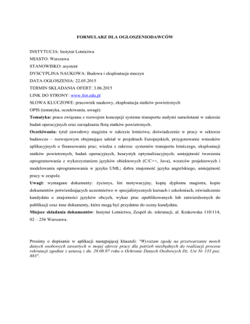 FORMULARZ DLA OGŁOSZENIODAWCÓW INSTYTUCJA: Instytut Lotnictwa MIASTO: Warszawa STANOWISKO: asystent DYSCYPLINA NAUKOWA: Budowa i eksploatacja maszyn DATA OGŁOSZENIA: 22.05.2015 TERMIN SKŁADANIA OFERT: 3.06.2015 LINK DO STRONY: www.ilot.edu.pl SŁOWA KLUCZOWE: pracownik naukowy, eksploatacja statków powietrznych OPIS (tematyka, oczekiwania, uwagi): Tematyka: praca związana z rozwojem koncepcji systemu transportu małymi samolotami w zakresie badań operacyjnych oraz zarządzania flotą statków powietrznych. Oczekiwania: tytuł zawodowy magistra w zakresie lotnictwa; doświadczenie w pracy w sektorze badawczo – rozwojowym obejmujące udział w projektach Europejskich, przygotowanie wniosków aplikacyjnych o finansowanie prac; wiedza z zakresu: systemów transportu lotniczego, eksploatacji statków powietrznych, badań operacyjnych, heurystyk optymalizacyjnych; umiejętność tworzenia oprogramowania z wykorzystaniem języków obiektowych (C/C++, Java), wzorców projektowych i modelowania oprogramowania w języku UML; dobra znajomość języka angielskiego, umiejętność pracy w zespole. Uwagi: wymagane dokumenty: życiorys, list motywacyjny, kopię dyplomu magistra, kopie dokumentów potwierdzających uczestnictwo w specjalistycznych kursach i szkoleniach, oświadczenie kandydata o znajomości języków obcych, wykaz prac opublikowanych lub zatwierdzonych do publikacji oraz inne dokumenty, które mogą być przydatne do oceny kandydata. Miejsce składania dokumentów: Instytut Lotnictwa, Zespół ds. rekrutacji, al. Krakowska 110/114, 02 – 256 Warszawa. Prosimy o dopisanie w aplikacji następującej klauzuli: "Wyrażam zgodę na przetwarzanie moich danych osobowych zawartych w mojej ofercie pracy dla potrzeb niezbędnych do realizacji procesu rekrutacji zgodnie z ustawą z dn. 29.08.97 roku o Ochronie Danych Osobowych Dz. Ust Nr 133 poz. 883".