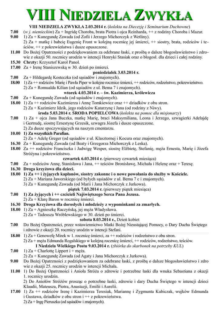 VIII NIEDZIELA ZWYKŁA 7.00 9.00 11.00 15.30 17.00 7.00 18.00 7.00 18.00 7.00 10.00 16.30 18.00 7.00 16.30 18.00 7.00 16.30 18.00 7.00 18.00 7.00 9.00 11.00 17.00 VIII NIEDZIELA ZWYKŁA 2.03.2014 r. (kolekta na Diecezję i Seminarium Duchowne) (w j. niemieckim) Za + Ingridę Choroba, brata Piotra i ojca Reinharda, ++ z rodziny Choroba i Mazur. 1) Za + Kunegundę Zawada (od Zofii i Jerzego Michorczyk z Wetliny). 2) Za + matkę i babcię Eugenię Front w kolejną rocznicę jej śmierci, ++ siostry, brata, rodziców i teściów, ++ z pokrewieństwa i dusze opuszczone. Do Bożej Opatrzności z podziękowaniem za odebrane łaski, z prośbą o dalsze błogosławieństwo i zdrowie z okazji 50. rocznicy urodzin w intencji Henryki Stasiak oraz o błogosł. dla dzieci i całej rodziny. Chrzty: Krzysztof Karol Panol. Za + Irenę Staniszewską w 30. dzień po śmierci. poniedziałek 3.03.2014 r. Za + Hildegardę Kosteczka (od sąsiadów i znajomych). 1) Za ++ rodziców Marię i Pawła Piper w kolejne rocznice śmierci, ++ rodziców, rodzeństwo, pokrewieństwo. 2) Za + Romualda Kilian (od sąsiadów z ul. Bema 7 i znajomych). wtorek 4.03.2014 r. – św. Kazimierza, królewicza Za + Kunegundę Zawada (od sąsiadów i znajomych). 1) Za ++ rodziców Kazimierza i Annę Tomkiewicz oraz ++ dziadków z obu stron. 2) Za + Kazimierz Idzik, jego rodziców Katarzynę i Jana (od rodziny z Niwy). środa 5.03.2014 r. ŚRODA POPIELCOWA (kolekta na pomoc dla misjonarzy) 1) Za + ojca Jana Buczka, matkę Marię, braci Maksymiliana, Leona i Jerzego, szwagierki Adelajdę i Gertrudę, siostrę Ernestynę Grzesik, szwagra Józefa i dusze opuszczone. 2) Za dusze spoczywających na naszym cmentarzu. 1) Za wszystkich Parafian. 2) Za + Adelę Greger (od sąsiadów z ul. Klasztornej i Kocura oraz znajomych). Za + Kunegundę Zawada (od Beaty i Grzegorza Michorczyk z Leska). Za ++ rodziców Franciszka i Jadwigę Wesper, siostrę Elżbietę, Stefanię, męża Ernesta, Marię i Józefa Stróżyna i pokrewieństwo. czwartek 6.03.2014 r. (pierwszy czwartek miesiąca) Za + rodziców Annę, Stanisława i Jana, ++ teściów Bronisławę, Michała i Helenę oraz + Teresę. Droga krzyżowa dla dzieci. 1) Za ++ i żyjących kapłanów, siostry zakonne i o nowe powołania do służby w Kościele. 2) Za + Mariana Jaworskiego (od byłych sąsiadów z ul. Bema 7 c i znajomych). 3) Za + Kunegundę Zawada (od Marii i Jana Michorczyk z Jurkowa). piątek 7.03.2014 r. (pierwszy piątek miesiąca) 1) Za żyjących i ++ czcicieli Najświętszego Serca Pana Jezusa. 2) Za + Klarę Baron w rocznicę śmierci. Droga Krzyżowa dla dorosłych i młodzieży z wypominkami za zmarłych. 1) Za + Agnieszkę Raczyńską, jej męża Władysława. 2) Za + Tadeusza Wróblewskiego w 30. dzień po śmierci. sobota 8.03.2014 r., Dzień kobiet Do Bożej Opatrzności, przez wstawiennictwo Matki Bożej Nieustającej Pomocy, o Dary Ducha Świętego i zdrowie z okazji 20. rocznicy urodzin w intencji Stefani. 1) Za + Genowefę Mirek w 1. rocznicę śmierci, za ++ rodziców i rodzeństwo z obu stron. 2) Za + męża Edmunda Rogalskiego w kolejną rocznicę śmierci, ++ rodziców, rodzeństwo, teściów. I Niedziela Wielkiego Postu 9.03.2014 r. (zbiórka do skarbonek na potrzeby KUL) 1) Za + Charlottę Lippert i + męża. 2) Za + Kunegundę Zawada (od Agaty i Jana Michorczyk z Jurkowa). Do Bożej Opatrzności z podziękowaniem za odebrane łaski, z prośbą o dalsze błogosławieństwo i zdro wie z okazji 25. rocznicy urodzin w intencji Michała. 1) Do Bożej Opatrzności i Anioła Stróża o zdrowie i potrzebne łaski dla wnuka Sebastiana z okazji 1. rocznicy urodzin. 2) Do Aniołów Stróżów prosząc o potrzebne łaski, zdrowie i dary Ducha Świętego w intencji dzieci Klaudii, Mateusza, Piotra, Anastazji, Emilii i Aurelii. 1) Za ++ rodziców Irenę i Kazimierza Teresiak, Mariannę i Zygmunta Kubiczak, wujków Edmunda i Gustawa, dziadków z obu stron i ++ z pokrewieństwa. 2) Za + Ingę Pieruszka (od sąsiadów i znajomych).