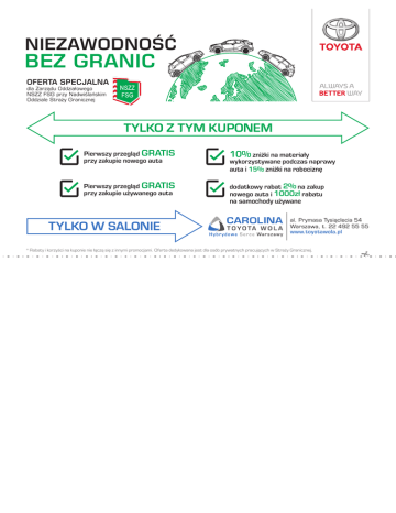 NIEZAWODNOŚĆ BEZ GRANIC OFERTA SPECJALNA dla Zarządu Oddziałowego NSZZ FSG przy Nadwiślańskim Oddziale Straży Granicznej TYLKO Z TYM KUPONEM Pierwszy przegląd GRATIS przy zakupie nowego auta 10% zniżki na materiały wykorzystywane podczas naprawy auta i 15% zniżki na robociznę Pierwszy przegląd GRATIS przy zakupie używanego auta dodatkowy rabat 2% na zakup nowego auta i 1000zł rabatu na samochody używane TYLKO W SALONIE al. Prymasa Tysiąclecia 54 Warszawa, t. 22 492 55 55 www.toyotawola.pl * Rabaty i korzyści na kuponie nie łączą się z innymi promocjami. Oferta dedykowana jest dla osób prywatnych pracujących w Straży Granicznej.