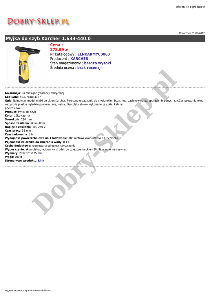 Informacje o produkcie Utworzono 09-03-2017 Myjka do szyb Karcher 1.633-440.0 Cena : 278,99 zł p. pl Nr katalogowy : ELNKARMYC0060 Producent : KARCHER Stan magazynowy : bardzo wysoki Średnia ocena : brak recenzji D ob ry - Sk le Gwarancja: 24 miesiące gwarancji fabrycznej Kod EAN:: 4039784834187 Opis: Najnowszy model myjki do okien Karcher. Poręczne urządzenie do mycia okien bez smug, zacieków na parapetach i brudnych rąk.Zastosowania:okna, wszystkie płaskie i gładkie powierzchnie, lustra, flizy,blaty stołów wykonane ze szkła, kabiny prysznicowe, Produkt: Myjka do szyb Kolor: żółto-czarna Szerokość: 280 mm Sposób zasilania: akumulator Napięcie zasilania: 100-240 V Czas pracy: 35 min Czas ładowania: 3 h Wydajność powierzchniowa na 1 ładowanie: 105 metrów kwadratowych ( 35 okien) Pojemność zbiornika do zbierania wody: 0,1 l Cechy dodatkowe: regulowana odległość czyszczenia Wyposażenie: akumulator, ładowarka, środek do czyszczenia okien(20ml), wymienna ssawka Wymiary: 280x325x125 mm Waga: 700 g Strona www produktu: Link Wygenerowano w programie www.oscGold.com