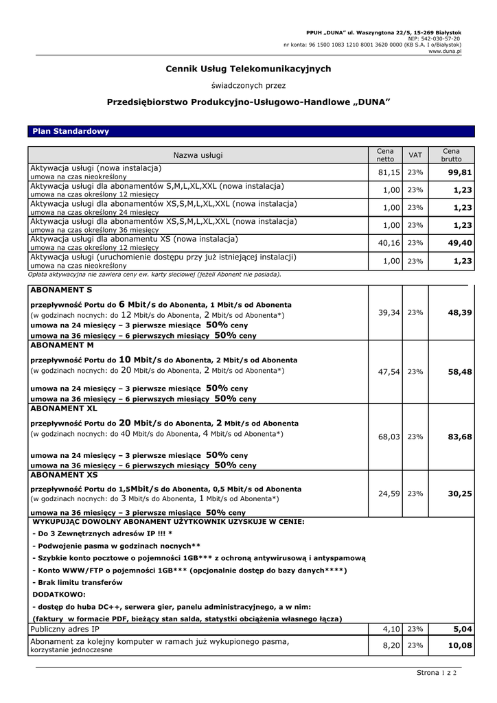 PPUH „DUNA” ul. Waszyngtona 22/5, 15-269 Białystok NIP: 542-030-57-20 nr konta: 96 1500 1083 1210 8001 3620 0000 (KB S.A. I o/Białystok) www.duna.pl Cennik Usług Telekomunikacyjnych świadczonych przez Przedsiębiorstwo Produkcyjno-Usługowo-Handlowe „DUNA” Plan Standardowy Nazwa usługi Aktywacja usługi (nowa instalacja) umowa na czas nieokreślony Aktywacja usługi dla abonamentów S,M,L,XL,XXL (nowa instalacja) umowa na czas określony 12 miesięcy Aktywacja usługi dla abonamentów XS,S,M,L,XL,XXL (nowa instalacja) umowa na czas określony 24 miesięcy Aktywacja usługi dla abonamentów XS,S,M,L,XL,XXL (nowa instalacja) umowa na czas określony 36 miesięcy Aktywacja usługi dla abonamentu XS (nowa instalacja) umowa na czas określony 12 miesięcy Aktywacja usługi (uruchomienie dostępu przy już istniejącej instalacji) umowa na czas nieokreślony Cena netto VAT Cena brutto 81,15 23% 99,81 1,00 23% 1,23 1,00 23% 1,23 1,00 23% 1,23 40,16 23% 49,40 1,00 23% 1,23 39,34 23% 48,39 47,54 23% 58,48 68,03 23% 83,68 24,59 23% 30,25 4,10 23% 5,04 8,20 23% 10,08 Opłata aktywacyjna nie zawiera ceny ew. karty sieciowej (jeżeli Abonent nie posiada). ABONAMENT S 6 Mbit/s do Abonenta, 1 Mbit/s od Abonenta 12 Mbit/s do Abonenta, 2 Mbit/s od Abonenta*) umowa na 24 miesięcy – 3 pierwsze miesiące 50% ceny umowa na 36 miesięcy – 6 pierwszych miesiący 50% ceny przepływność Portu do (w godzinach nocnych: do ABONAMENT M przepływność Portu do (w godzinach nocnych: do 10 Mbit/s do Abonenta, 2 Mbit/s od Abonenta 20 Mbit/s do Abonenta, 2 Mbit/s od Abonenta*) umowa na 24 miesięcy – 3 pierwsze miesiące 50% ceny 50% ceny umowa na 36 miesięcy – 6 pierwszych miesiący ABONAMENT XL przepływność Portu do 20 Mbit/s do Abonenta, 2 Mbit/s od Abonenta 4 Mbit/s od Abonenta*) (w godzinach nocnych: do 40 Mbit/s do Abonenta, umowa na 24 miesięcy – 3 pierwsze miesiące 50% ceny 50% ceny umowa na 36 miesięcy – 6 pierwszych miesiący ABONAMENT XS przepływność Portu do 1,5Mbit/s do Abonenta, 0,5 Mbit/s od Abonenta (w godzinach nocnych: do 3 Mbit/s do Abonenta, 1 Mbit/s od Abonenta*) umowa na 36 miesięcy – 3 pierwsze miesiące 50% ceny WYKUPUJĄC DOWOLNY ABONAMENT UŻYTKOWNIK UZYSKUJE W CENIE: - Do 3 Zewnętrznych adresów IP !!! * - Podwojenie pasma w godzinach nocnych** - Szybkie konto pocztowe o pojemności 1GB*** z ochroną antywirusową i antyspamową - Konto WWW/FTP o pojemności 1GB*** (opcjonalnie dostęp do bazy danych****) - Brak limitu transferów DODATKOWO: - dostęp do huba DC++, serwera gier, panelu administracyjnego, a w nim: (faktury w formacie PDF, bieżący stan salda, statystki obciążenia własnego łącza) Publiczny adres IP Abonament za kolejny komputer w ramach już wykupionego pasma, korzystanie jednoczesne Strona 1 z 2 PPUH „DUNA” ul. Waszyngtona 22/5, 15-269 Białystok NIP: 542-030-57-20 nr konta: 96 1500 1083 1210 8001 3620 0000 (KB S.A. I o/Białystok) www.duna.pl bezpłatne, powyżej 3 komputerów – negocjowane Abonament za kolejny komputer w ramach już wykupionego pasma, korzystanie naprzemienne Zmiana rodzaju usługi na usługę o niższej opłacie abonamentowej 36,89 45,37 23% * Korzystanie naprzemienne. Adres Zewnętrzny nie jest adresem Publicznym. ** W godzinach nocnych od 1:00 do 7:00 obowiązuje dodatkowe PODWOJENIE przepustowości! Operator zastrzega sobie prawo ograniczenia terytorialnego podwojenia przepustowości. Aktualne informacje o lokalizacjach nie objętych podwojeniem na stronie www.duna.pl. *** Konto WWW i EMAIL mają wspólną pojemność 1GB. **** Na wniosek abonenta, wyłącznie w celach niekomercyjnych. Pozostałe Usługi Telekomunikacyjne Nazwa usługi Zawieszenie Usług Telekomunikacyjnych na wniosek Abonenta minimalnie na 3, maksymalnie 9 pełnych cykli rozliczeniowych – opłata jednorazowa (okres zawieszenia nie może łączyć się z okresem wypowiedzenia) Cena netto VAT 40,98 23% Cena brutto 50,41 Wznowienie Usług Telekomunikacyjnych na wniosek Abonenta – po zawieszeniu bezpłatnie Cesja Umowy o świadczenie Usług Telekomunikacyjnych bezpłatnie Usługi serwisowe / instalacyjne Nazwa usługi Konfiguracja komputera Abonenta do pracy w sieci na życzenie Abonenta Wizyta specjalisty/instalatora sieci w celu usunięcia awarii z winy Abonenta oraz serwis płatny, stawka za każdą rozpoczętą godzinę pracy Instalacja i konfiguracja sieci bezprzewodowej w lokalu abonenta w przypadku, gdy urządzenie do dostępu bezprzewodowego dostarcza abonent Instalacja i konfiguracja sieci bezprzewodowej w lokalu abonenta Cena netto VAT 32,79 23% 40,33 32,79 23% 40,33 32,79 23% 40,33 23% 40,33 + 32,79 w przypadku, gdy urządzenie do dostępu bezprzewodowego dostarcza operator Cena brutto koszt urządzenia Materiały instalacyjne Nazwa materiału jm. Cena netto VAT Karta sieciowa PCI 100Mbps do komputera stacjonarnego szt. 24,6 23% Przedłużacz UTP kat. 5 mb. Urządzenie do dostępu bezprzewodowego Router/AP WiFi BG szt. Switch Ethernet 10/100 5-portowy szt. 1,23 od 90,17* 69,68 23% 23% 23% Cena brutto 36,9 3,02 od 110,00* 85,7 Objaśnienia: * w zależności od klasy i modelu urządzenia Strona 2 z 2