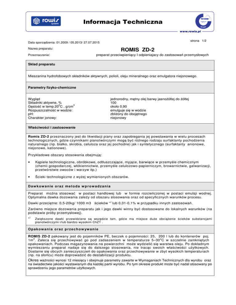 09:55:112015-07-28222 Informacja Techniczna strona 1/2 Data sporządzenia: 01.2009 / 05.2013/ 27.07.2015 Nazwa preparatu: Przeznaczenie: ROMIS ZD-2 preparat przeciwpieniący I odpieniajacy do zastosowań przemysłowych Skład preparatu Mieszanina hydrofobowych składników aktywnych, polioli, oleju mineralnego oraz emulgatora niejonowego. Parametry fizyko-chemiczne Wygląd Składniki aktywne, % 0 3 Gęstość w temp.20 C , g/cm Rozpuszczalność w wodzie: pH: Charakter jonowy: jednorodny, mętny olej barwy jasnożółtej do żółtej 100 około 0,90 emulguje się w wodzie zbliżony do obojętnego niejonowy Właściwości i zastosowanie Romis ZD-2 przeznaczony jest do likwidacji piany oraz zapobiegania jej powstawania w wielu procesach technologicznych, gdzie czynnikami pianotwórczymi mogą być różnego rodzaju surfaktanty pochodzenia naturalnego (np. białko, skrobia, celuloza oraz jej pochodne) jak i syntetycznego (surfaktanty anionowe, niejonowe, kationowe). Przykładowe obszary stosowania obejmują: • Kąpiele technologiczne, obróbkowe, odtłuszczające, myjące, barwiące w przemyśle chemicznym (chemii gospodarczej, włókiennictwie, przemyśle celulozowo-papierniczym, browarnictwie, galwanizacji, przetwórstwie owoców i warzyw itp.) • Ścieki technologiczne z wyżej wymienionych obszarów. D a w k ow a n i e o r a z m e t o d a w p r o w a d z a n i a Preparat można stosować w postaci handlowej lub w formie rozcieńczonej w postaci emulsji wodnej. Optymalna dawka dozowania zależy od obszaru stosowania oraz od specyficznych warunków procesu. ) Dawki przeciętne: 0,5-20kg/ 1000 m3 ścieków * lub 0,01-0,1% w przypadku innych zastosowań. Zarówno miejsce dozowania preparatu jak i jego dawki winny być dostosowane do lokalnych warunków (na podstawie próby przemysłowej). * ) Zwiększone dawki przewidziane są wszędzie tam, gdzie ma miejsce duże obciążenie ścieków substancjami pianotwórczymi i/lub bardzo wysokim ChZT . O p a k o w a n i a o r a z p r z e c h o w yw a n i e ROMIS ZD-2 pakowany jest do pojemników PE, beczek o pojemności: 25, 200 l lub do kontenerów poj. 3 o 1m . Zaleca się przechowywać go pod zadaszeniem w temperaturze 5–30 C w szczelnie zamkniętych opakowaniach. Podczas magazynowania na powierzchni może wydzielić się warstwa oleju. Po dokładnym wymieszaniu preparat nadaje się do dalszego stosowania, nie tracąc swoich właściwości użytkowych. Dostanie się obcych zanieczyszczeń do opakowania oraz przechowywanie w zbyt wysokich temperaturach (np. na słońcu) może doprowadzić do destabilizacji produktu. Okres ważności wynosi 12 miesięcy i obejmuje parametry zawarte w Wymaganiach Technicznych dla wyrobu oraz na świadectwie jakości wystawianym dla każdej partii wyrobu. Po tym okresie produkt może być nadal stosowany po sprawdzeniu jego parametrów użytkowych. 09:55:112015-07-28222 Informacja Techniczna strona 2/2 Data sporządzenia: 01.2009 / 05.2013/ 27.07.2015 Nazwa preparatu: Przeznaczenie: ROMIS ZD-2 preparat przeciwpieniący I odpieniajacy do zastosowań przemysłowych Zaszeregowanie, toksyczność, środki ochrony Wytyczne w tym zakresie znajdują się w naszych Kartach Charakterystyki Preparatu Informacje zawarte w dokumencie podano w dobrej wierze, w oparciu o naszą aktualną wiedzę i doświadczenie. Podane informacje na temat produktu określają jego parametry użytkowe oraz fizyko-chemiczne jedynie w przybliżeniu i nie mogą stanowić podstawy do reklamacji. Szczegółowe dane dotyczące parametrów oraz ich dopuszczalnych zakresów znajdują się w Wymaganiach Technicznych dla wyrobu . Zastrzega się prawo wprowadzenia zmian do niniejszej informacji technicznej będących skutkiem postępu technologicznego oraz ulepszania produktu przez producenta.