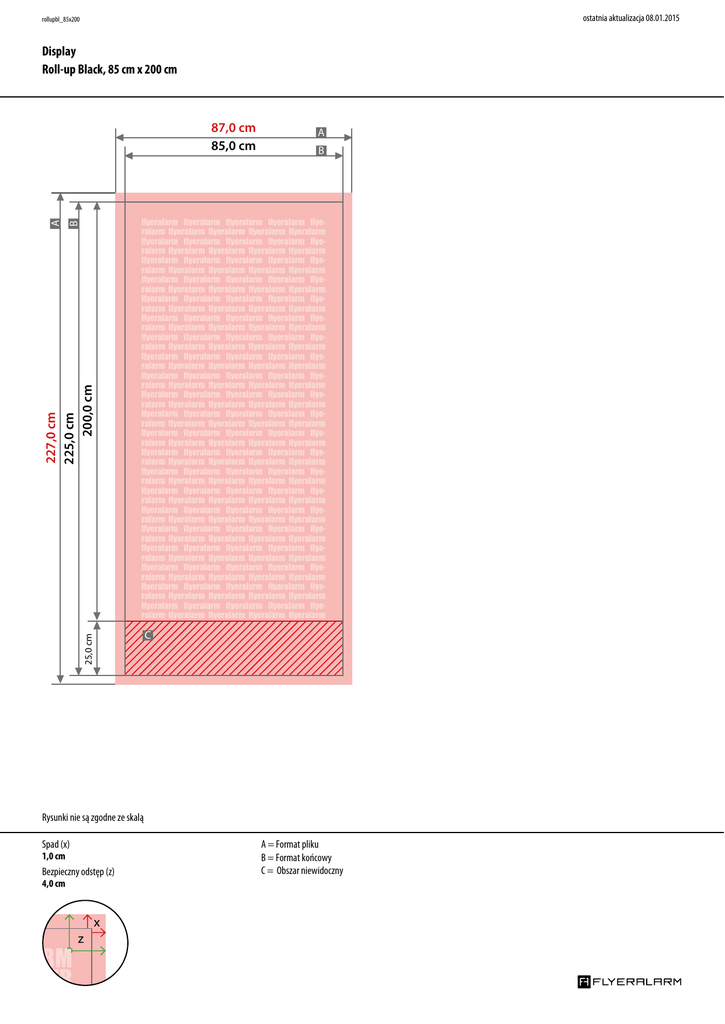 ostatnia aktualizacja 08.01.2015 rollupbl_85x200 Display Roll-up Black, 85 cm x 200 cm B A B flyeralarm flyeralarm flyeralarm flyeralarm flyeralarm flyeralarm flyeralarm flyeralarm flyeralarm flyeralarm flyeralarm flyeralarm flyeralarm flyeralarm flyeralarm flyeralarm flyeralarm flyeralarm flyeralarm flyeralarm flyeralarm flyeralarm flyeralarm flyeralarm flyeralarm flyeralarm flyeralarm flyeralarm flyeralarm flyeralarm flyeralarm flyeralarm flyeralarm flyeralarm flyeralarm flyeralarm flyeralarm flyeralarm flyeralarm flyeralarm flyeralarm flyeralarm flyeralarm flyeralarm flyeralarm flyeralarm flyeralarm flyeralarm flyeralarm flyeralarm flyeralarm flyeralarm flyeralarm flyeralarm flyeralarm flyeralarm flyeralarm flyeralarm flyeralarm flyeralarm flyeralarm flyeralarm flyeralarm flyeralarm flyeralarm flyeralarm flyeralarm flyeralarm flyeralarm flyeralarm flyeralarm flyeralarm flyeralarm flyeralarm flyeralarm flyeralarm flyeralarm flyeralarm flyeralarm flyeralarm flyeralarm flyeralarm flyeralarm flyeralarm flyeralarm flyeralarm flyeralarm flyeralarm flyeralarm flyeralarm flyeralarm flyeralarm flyeralarm flyeralarm flyeralarm flyeralarm flyeralarm flyeralarm flyeralarm flyeralarm flyeralarm flyeralarm flyeralarm flyeralarm flyeralarm flyeralarm flyeralarm flyeralarm flyeralarm flyeralarm flyeralarm flyeralarm flyeralarm flyeralarm flyeralarm flyeralarm flyeralarm flyeralarm flyeralarm flyeralarm flyeralarm flyeralarm flyeralarm flyeralarm flyeralarm flyeralarm flyeralarm flyeralarm flyeralarm flyeralarm flyeralarm flyeralarm flyeralarm flyeralarm flyeralarm flyeralarm flyeralarm flyeralarm flyeralarm flyeralarm flyeralarm flyeralarm flyeralarm flyeralarm flyeralarm flyeralarm flyeralarm flyeralarm flyeralarm flyeralarm flyeralarm flyeralarm flyeralarm flyeralarm flyeralarm flyeralarm flyeralarm flyeralarm flyeralarm flyeralarm flyeralarm flyeralarm flyeralarm flyeralarm flyeralarm flyeralarm flyeralarm flyeralarm flyeralarm flyeralarm flyeralarm flyeralarm flyeralarm flyeralarm flyeralarm flyeralarm flyeralarm flyeralarm flyeralarm flyeralarm flyeralarm flyeralarm flyeralarm flyeralarm flyeralarm flyeralarm flyeralarm flyeralarm flyeralarm 25,0 cm 227,0 cm 225,0 cm 200,0 cm A 87,0 cm 85,0 cm C Rysunki nie są zgodne ze skalą Spad (x) 1,0 cm Bezpieczny odstęp (z) 4,0 cm x RM YER Powered by TCPDF (www.tcpdf.org) z A = Format pliku B = Format końcowy C = Obszar niewidoczny ostatnia aktualizacja 08.01.2015 Instrukcja montażu Display, Roll-Up Black Zawartość opakowania 1 x System display 1 x Torba transportowa Dodatkowo przy systemie z drukiem: 1 x Druk banerowy Montaż 1. Złożyć trzyczęściowy drążek. 2. Drążek wstawić w otwór w obudowie. 4. Gotowe! 3.Druk banerowy wyciągnąć z obudowy i umieścić plastikową końcówkę drążka po środku profilu, w jego górnej szczelinie. Wskazówka: Aby ułatwić zawieszenie profilu, prosimy stanąć za systemem i przechylić go lekko do tyłu przy wyciąganiu druku banerowego. ostatnia aktualizacja 08.01.2015 Montaż druku banerowego 1. Otworzyć listwę zaciskową i umieścić tam górną krawędź druku banerowego. 2. Zamocować druk banerowy w listwie zaciskowej. Kaseta Uwaga! Powered by TCPDF (www.tcpdf.org) 3. Zdjąć folię ochronną. Dolną krawędź druku banerowego (wydrukowanym motywem do góry) ułożyć wzdłuż czerownej linii i nakleić. 4. Ewentualnie zabezpieczyć dodatkowo taśmą klejącą na tylnej stronie. 5. Przytrzymać kasetę i usunąć zawleczkę zabezpieczającą po prawej stronie. Mechanizm jest teraz aktywny. 6. Druk banerowy ostrożnie zwinąć. Gotowe!