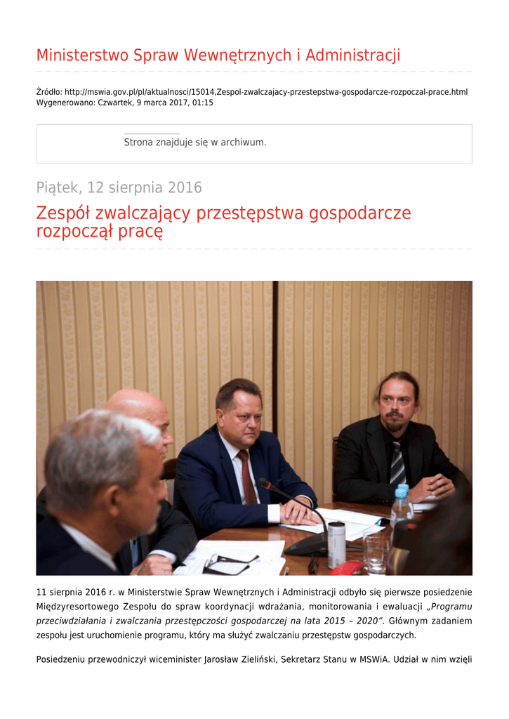 Ministerstwo Spraw Wewnętrznych i Administracji Źródło: http://mswia.gov.pl/pl/aktualnosci/15014,Zespol-zwalczajacy-przestepstwa-gospodarcze-rozpoczal-prace.html Wygenerowano: Czwartek, 9 marca 2017, 01:15 Strona znajduje się w archiwum. Piątek, 12 sierpnia 2016 Zespół zwalczający przestępstwa gospodarcze rozpoczął pracę 11 sierpnia 2016 r. w Ministerstwie Spraw Wewnętrznych i Administracji odbyło się pierwsze posiedzenie Międzyresortowego Zespołu do spraw koordynacji wdrażania, monitorowania i ewaluacji „Programu przeciwdziałania i zwalczania przestępczości gospodarczej na lata 2015 – 2020”. Głównym zadaniem zespołu jest uruchomienie programu, który ma służyć zwalczaniu przestępstw gospodarczych. Posiedzeniu przewodniczył wiceminister Jarosław Zieliński, Sekretarz Stanu w MSWiA. Udział w nim wzięli również przedstawiciele Ministerstwa Finansów, Ministerstwa Rozwoju, Ministerstwa Sprawiedliwości, Ministerstwa Cyfryzacji, a także innych jednostek i urzędów. Podczas spotkania, członkowie zespołu uzgodnili tryb pracy i omówili podstawowe zasady, według których Program będzie wdrażany. Podstawowy cel „Programu przeciwdziałania i zwalczania przestępczości gospodarczej…” to ograniczenie przestępczości gospodarczej, która cały czas powoduje poważne straty, nie tylko dla budżetu państwa, ale też w sektorze prywatnym. Działania takie jak np. wyłudzanie dopłat, zanizanie dochodów czy działalność szarej strefy są bardzo niebezpieczne dla całej gospodarki. Zwalczanie przestępczości gospodarczej jest jednym z priorytetów Rządu, gdyż szkodzi ona nie tylko bezpieczeństwu publicznemu, ale też bezpieczeństwu ekonomicznemu państwa. Podczas posiedzenia Zespołu poruszony został też temat przestępstw podatkowych. Aby zapewnić dobrą i efektywną współpracę na tym polu, powołano Zespół zadaniowego ds. przestępczości podatkowej. Dzięki temu różne podmioty realizujące Program będą mogły lepiej koordynować swoje działania. Zespół zadaniowy zajmie się trzema podstawowymi zadaniami: ● będzie poszukiwał luk w prawie, które sprzyjają przestępczości podatkowej i rozwojowi szarej strefy; ● będzie wskazywał obszary, które są najbardziej narażone na przestępstwa podatkowe i koordynował działania, które mają służyć jej zwalczaniu; ● będzie oceniał skuteczność struktur, które powinny przeciwdziałać przestępczości podatkowej i ją zwalczać. Będzie też w miarę potrzeby proponował zmiany w tych strukturach. „Program przeciwdziałania i zwalczania przestępczości gospodarczej…” to szeroko zakrojone działanie. Przestępczość gospodarcza ma wiele aspektów tylko skuteczne przeciwdziałanie im wszystkim zagwarantuje, ąe zmniejszy się negatywny wpływ tego zjawiska na ekonomie naszego kraju. Dlatego tak ważne jest aby Program został prawidłowo wdrożony i działał bez zarzutu. To właśnie jest zadaniem Zespołu, który rozpoczął pracę 11 sierpnia. posiedzenie zespołu posiedzenie zespołu posiedzenie zespołu posiedzenie zespołu posiedzenie zespołu posiedzenie zespołu