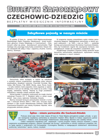 BIULETYN SAMORZĄDOWY C ZEC CZ ECHOW HOW IC-DZ IC- DZII E DZ D ZII C B E Z P Ł AT N Y M I E S I Ę C Z N I K I N F O R M A C YJ N Y ISSN 1248-6939 ROK WYDANIA XVIII NR 5/162 lipiec/sierpień 2008 Zabytkowe pojazdy w naszym mieście W sobotę 12 lipca br. ramach XXXI Międzynarodowego Beskidzkiego Rajdu Pojazdów Zabytkowych przed budynkiem głównym Urzędu Miejskiego w Czechowicach - Dziedzicach odbył się pokaz starodawnych samochodów. Rajd każdego roku przyciąga dużą liczbę uczestników. Nasze miasto odwiedziło 66 załóg z kraju i zagranicy (Austria, Czechy, Niemcy, Szwecja). W programie imprezy przewidziano wybór mistrza samochodowej elegancji. Najelegantsze samochody w dwóch grupach wiekowych – do 1945 r. oraz po 1945 r. – wybierała komisja pod przewodnictwem Burmistrza Czechowic-Dziedzic, który był fundatorem nagród dla zwycięzców konkursu oraz pamiątkowych medali dla wszystkich uczestników rajdu. Wyjątkowego charakteru imprezie nadały epokowe stroje kierowców samochodów zabytkowych, stylizowane według mody rządzącej w owych czasach. Samochody, które wystąpiły w rajdzie są zabytkami o wysokim stopniu oryginalności, pamiętają czasy naszych pradziadków, dziadków, rodziców. Chevrolet Corvette, Mercedes, Alfa Romeo, Fiat, BMW, Skoda, Jawa, Rover, Austin – to tylko niektóre marki pojazdów, które zagościły w rajdzie. Niektóre z nich już nie istnieją, inne nadal są na rynku i mają bogatą, wieloletnią historię. Historię tę mogli prześledzić mieszkańcy naszego miasta podczas rajdu. Wśród perełek z dziedziny motoryzacji nie mogło również zabraknąć Porsche 911 T. Modelem takim w wersji coupe jeździł nasz znany rajdowiec Sobiesław Zasada. Barwny korowód leciwych samochodów otwierał z numerem 1 motocykl Simson AWO z 1957 roku, mrucząc swym silnikiem w takt muzyki Młodzieżowej Orkiestry Dętej MDK Czechowice-Dziedzice pod batutą Krystiana Hajnasa, która przygrywała podczas pokazu. Żylina – miasto partnerskie dla Czechowic-Dziedzic Podczas obrad sesji, która miała miejsce 29 lipca br. Rada Miejska jednogłośnie podjęła uchwałę w sprawie nawiązania współpracy partnerskiej ze słowackim miastem Žilina. Będzie to kolejny zagraniczny partner Czechowic – Dziedzic obok niemieckiego Hiddenhausen, białoruskiego Słonimia oraz czeskiej Orlovej. Celem nawiązania współpracy jest wspieranie i rozwój przyjaźni między naszymi miastami, a także wspieranie europejskiego programu „Aktywni obywatele dla Europy”, partnerstwa w ramach wspólnych projektów, które będą zgodne z programami Unii Europejskiej i Euroregionu Beskidy w następujących dziedzinach: administracji publicznej, szkolnictwa i sportu, kultury, turystyki. BIULETYN SAMORZĄDOWY C Z E C H O W I C - D Z I E D Z I C 1 Burmistrz powołał swojego zastępcę Zarządzeniem nr 69/08 Burmistrza CzechowicDziedzic z dnia 1 lipca 2008 r. MACIEJ KOŁOCZEK został powołany na stanowisko zastępcy burmistrza Czechowic-Dziedzic. Maciej Kołoczek pełni funkcję drugiego zastępcy i sprawuje bezpośredni nadzór nad komórkami organizacyjnymi Urzędu Miejskiego, tj. nad Wydziałem Spraw Obywatelskich, Wydziałem Świadczeń Społecznych oraz Biurem ds. Profilaktyki i Przeciwdziałania Uzależnieniom. Jednocześnie nadzoruje jednostki organizacyjne gminy: Miejski Dom Kultury, Miejską Bibliotekę Publiczną, Miejski Ośrodek Sportu i Rekreacji, Ośrodek Pomocy Społecznej wraz z Systemem Pomocy Społecznej, Zespół Obsługi Placówek Oświatowych wraz z placówkami oświatowymi, Administrację Zasobów Komunalnych i Przedsiębiorstwo Komunikacji Miejskiej. * * * Maciej Kołoczek urodził się w 1979 r. Do roku 1998 mieszkał w Czechowicach-Dziedzicach, obecnie jest mieszkańcem Ligoty. Ukończył II Liceum Ogólnokształcące przy Zespole Szkół Technicznych i Licealnych im. S. Staszica w Czechowicach-Dziedzicach. Jest absolwentem Wydziału Nauk Społecznych Uniwersytetu Śląskiego w Katowicach, gdzie studiował politologię o specjalności dziennikarstwo. Od I roku studiów współpracował z lokalnymi i regionalnymi mediami, m.in. Kroniką Beskidzką, Dziennikiem Zachodnim i oddziałem katowickim TVP. W 2003 roku podjął pracę w Stowarzyszeniu „Region Beskidy” jako specjalista ds. współpracy transgranicznej. W tym samym czasie rozpoczął studia doktoranckie na Wydziale Nauk Społecznych Uniwersytetu Śląskiego, a następnie otworzył przewód doktorski. W roku 2007 został dyrektorem biura Stowarzyszenia „Region Beskidy”. Maciej Kołoczek jest kawalerem, jednakże w miesiącu sierpniu zmieni stan cywilny. Jego hobby to turystyka piesza i rowerowa, narciarstwo, ale jak sam zaznacza, jego prawdziwą pasją są nowoczesne technologie informatyczne. * * * Maciej Kołoczek przez pięć lat pracował w Stowarzyszeniu „Region Beskidy”, które tworzy Polską część polsko-słowacko-czeskiego Euroregionu Beskidy z siedzibą w BielskuBiałej. Euroregion po polskiej stronie skupia wszystkie gminy powiatu żywieckiego, bielskiego, suskiego, miasto Bielsko-Biała, powiat bielski, suski, pszczyński i gminę Kęty w powiecie oświęcimskim. W biurze Stowarzyszenia Maciej Kołoczek zajmował się funduszami unijnymi przeznaczonymi na współpracę transgraniczną. Pieniądze z przedakcesyjnego funduszu PHARE CBC były przeznaczane na tzw. projekty miękkie, wspierające m.in. zrównoważony rozwój turystyki, kulturę, 2 sport, ochronę środowiska, szkolnictwo, wymianę młodzieży. Kolejnym etapem, będącym kontynuacją programu PHARE były fundusze unijne realizowane w ramach programu Inicjatywy Wspólnotowej INTEREG IIIA Polska-Słowacja oraz Czechy-Polska. Obecnie polska część Euroregionu Beskidy zarządza kwotą około 8 mln euro przeznaczoną na mikroprojekty w ramach programów operacyjnych współpracy transgranicznej Czechy–Polska oraz Polska–Słowacja. Beneficjenci starający się o dofinansowanie złożonych do Euroregionu 
