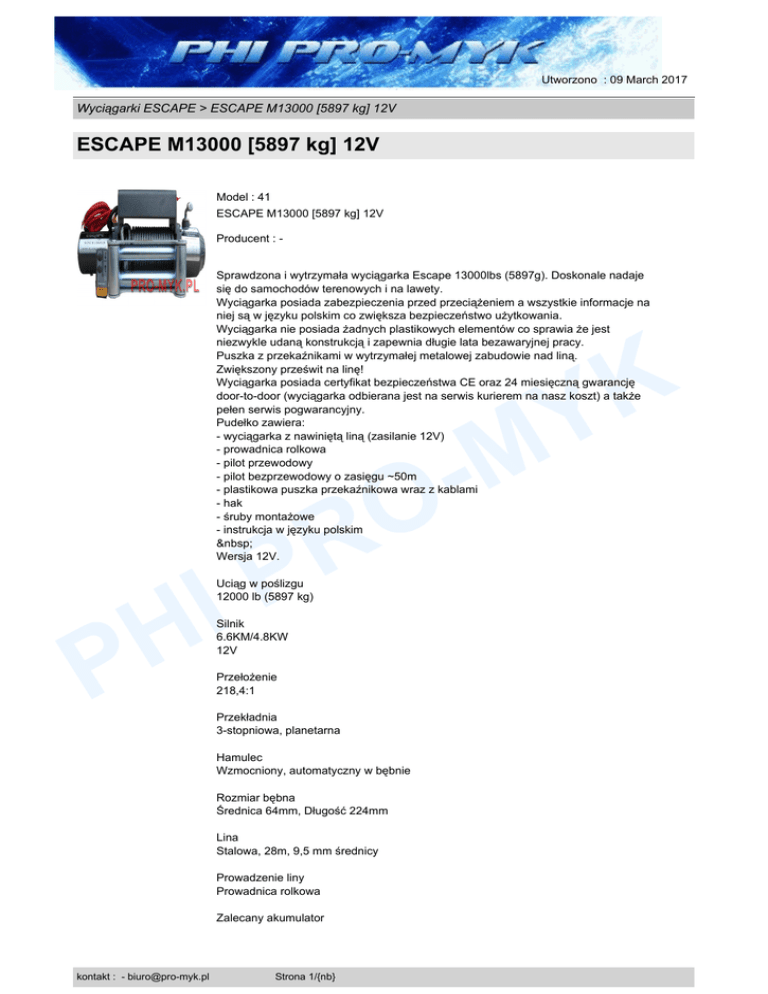 Utworzono : 09 March 2017 Wyciągarki ESCAPE > ESCAPE M13000 [5897 kg] 12V ESCAPE M13000 [5897 kg] 12V Model : 41 ESCAPE M13000 [5897 kg] 12V Producent : Sprawdzona i wytrzymała wyciągarka Escape 13000lbs (5897g). Doskonale nadaje się do samochodów terenowych i na lawety. Wyciągarka posiada zabezpieczenia przed przeciążeniem a wszystkie informacje na niej są w języku polskim co zwiększa bezpieczeństwo użytkowania. Wyciągarka nie posiada żadnych plastikowych elementów co sprawia że jest niezwykle udaną konstrukcją i zapewnia długie lata bezawaryjnej pracy. Puszka z przekaźnikami w wytrzymałej metalowej zabudowie nad liną. Zwiększony prześwit na linę! Wyciągarka posiada certyfikat bezpieczeństwa CE oraz 24 miesięczną gwarancję door-to-door (wyciągarka odbierana jest na serwis kurierem na nasz koszt) a także pełen serwis pogwarancyjny. Pudełko zawiera: - wyciągarka z nawiniętą liną (zasilanie 12V) - prowadnica rolkowa - pilot przewodowy - pilot bezprzewodowy o zasięgu ~50m - plastikowa puszka przekaźnikowa wraz z kablami - hak - śruby montażowe - instrukcja w języku polskim Wersja 12V. K Y M I H O R P Uciąg w poślizgu 12000 lb (5897 kg) P Silnik 6.6KM/4.8KW 12V Przełożenie 218,4:1 Przekładnia 3-stopniowa, planetarna Hamulec Wzmocniony, automatyczny w bębnie Rozmiar bębna Średnica 64mm, Długość 224mm Lina Stalowa, 28m, 9,5 mm średnicy Prowadzenie liny Prowadnica rolkowa Zalecany akumulator kontakt : - [email protected] Strona 1/{nb} Utworzono : 09 March 2017 Wyciągarki ESCAPE > ESCAPE M13000 [5897 kg] 12V ESCAPE M13000 [5897 kg] 12V Wskazane 650 CCA prądu rozruchowego Otwory mocujące 254x114,3 mm Wymiary 540mmx160mmx218mm Waga 38 kg K Y M Sterowanie przewodowe i bezprzewodowe Gwarancja 24 miesiące door-to-door Cena : 1.599,00 zł Brutto ( 1.300,00 zł Netto) O R P Dostępność: Produkt dostępny w naszym sklepie od 01 May 2011 P I H kontakt : - [email protected] Strona 2/{nb}