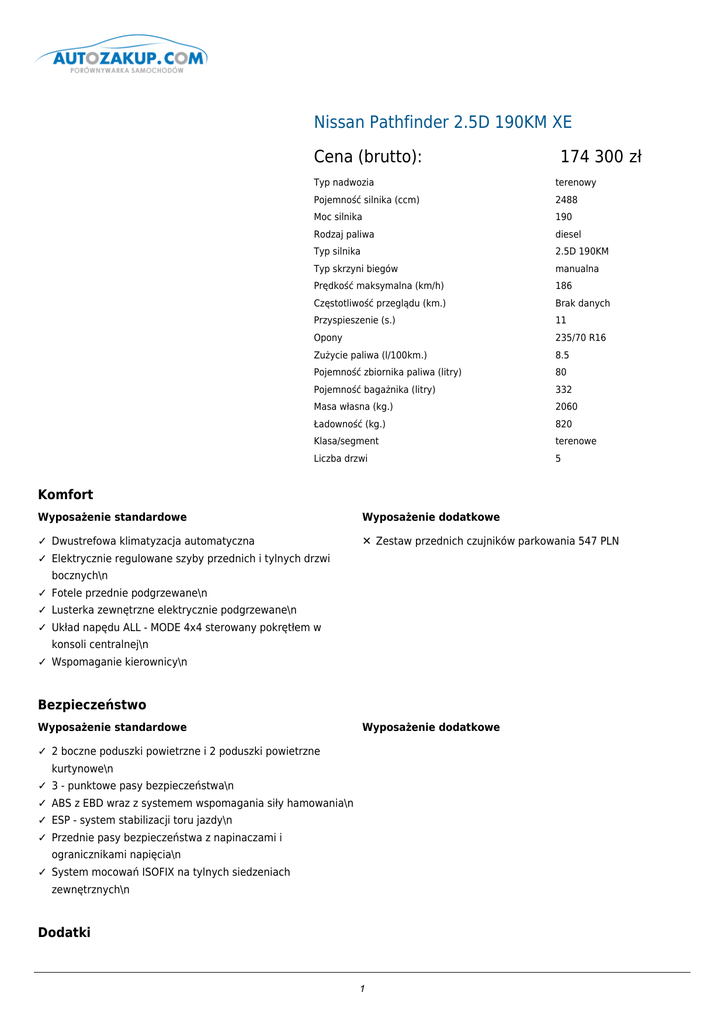 Nissan Pathfinder 2.5D 190KM XE Cena (brutto): 174 300 zł Typ nadwozia terenowy Pojemność silnika (ccm) 2488 Moc silnika 190 Rodzaj paliwa diesel Typ silnika 2.5D 190KM Typ skrzyni biegów manualna Prędkość maksymalna (km/h) 186 Częstotliwość przeglądu (km.) Brak danych Przyspieszenie (s.) 11 Opony 235/70 R16 Zużycie paliwa (l/100km.) 8.5 Pojemność zbiornika paliwa (litry) 80 Pojemność bagażnika (litry) 332 Masa własna (kg.) 2060 Ładowność (kg.) 820 Klasa/segment terenowe Liczba drzwi 5 Komfort Wyposażenie standardowe Wyposażenie dodatkowe ✓ Dwustrefowa klimatyzacja automatyczna ✕ Zestaw przednich czujników parkowania 547 PLN ✓ Elektrycznie regulowane szyby przednich i tylnych drzwi bocznych\n ✓ Fotele przednie podgrzewane\n ✓ Lusterka zewnętrzne elektrycznie podgrzewane\n ✓ Układ napędu ALL - MODE 4x4 sterowany pokrętłem w konsoli centralnej\n ✓ Wspomaganie kierownicy\n Bezpieczeństwo Wyposażenie standardowe Wyposażenie dodatkowe ✓ 2 boczne poduszki powietrzne i 2 poduszki powietrzne kurtynowe\n ✓ 3 - punktowe pasy bezpieczeństwa\n ✓ ABS z EBD wraz z systemem wspomagania siły hamowania\n ✓ ESP - system stabilizacji toru jazdy\n ✓ Przednie pasy bezpieczeństwa z napinaczami i ogranicznikami napięcia\n ✓ System mocowań ISOFIX na tylnych siedzeniach zewnętrznych\n Dodatki 1 Wyposażenie standardowe Wyposażenie dodatkowe ✓ 16" felgi ze stopów metali lekkich, opony 235/ 70 R 16 ✕ Dywaniki gumowe 5 szt. 273 PLN ✓ 4 głośniki ✕ Lakier metalizowany/perłowy 4000 PLN ✓ Aktywne zagłówki foteli przednich ✕ Poprzeczki do relingów 964 PLN ✓ Bluetooth ✕ Wykładzina miękka -na 2 rzędy siedzeń 286 PLN ✓ Drugi rząd siedzeń składany na płasko 40/20/40 z regulacją ✕ Zaczep holowniczy stały 1419 PLN kąta pochylenia oparcia ✓ Immobiliser ✕ Zestaw czujników cofania 698 PLN ✓ Kierunkowskazy w lusterkach/ lampy oświetlające podłoże w lusterkach\n ✓ Koło kierownicy, gałka dźwigni zmiany biegów pokryte skórą\n ✓ Okno klapy bagażnika otwierane niezależnie\n ✓ Podłokietnik przedni ze schowkiem\n ✓ Przednia osłona wlotu powietrza chromowana\n ✓ System audio: radio, odtwarzacz CD (1 płytowy)\n ✓ Wejście akcesoryjne\n Doprecyzowanie oferty ✕ XE+ - 8400 PLN 17" felgi ze stopów metali lekkich, opony 255/ 65 R 17 2 poduszki powietrzne kurtynowe Aktywny Mechanizm Różnicowy LSD ESP Kontakt: Nazwa użytkownika: admin Nazwa firmy: qqq Adres: qqq 12, 41-706 qqq1, NIP: 954 REGON: 1 Telefon: 123, 1 Fax: 1 Email: 1 www: 2