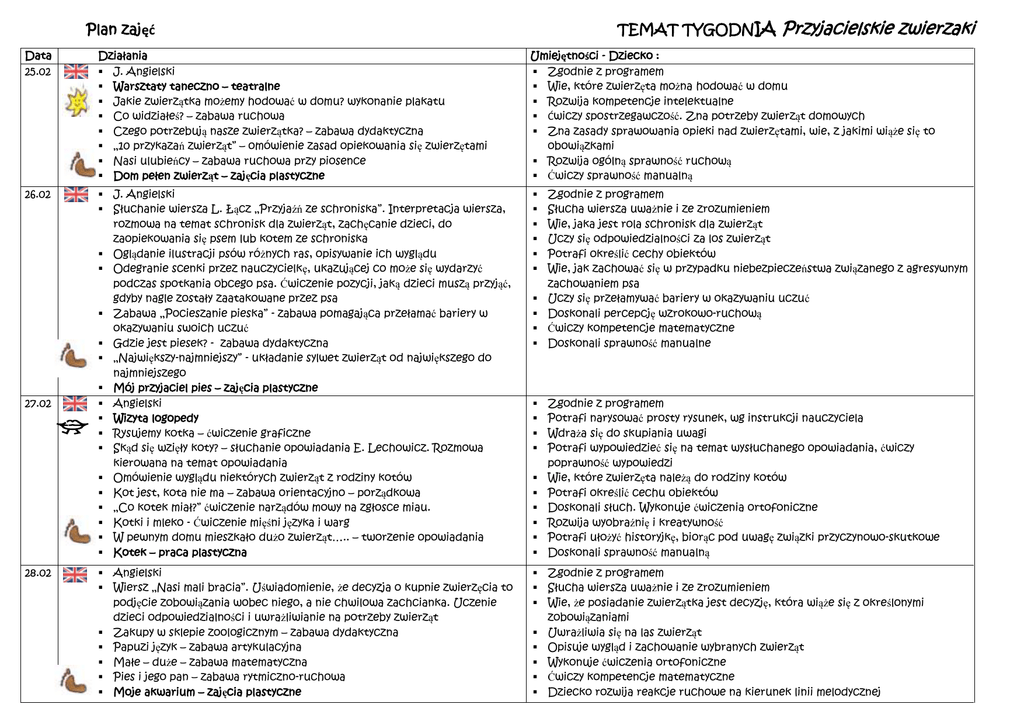 TEMAT TYGODNIA Plan zajęć Przyjacielskie zwierzaki Data 25.02 Działania J. Angielski Warsztaty taneczno – teatralne Jakie zwierzątka możemy hodować w domu? wykonanie plakatu Co widziałeś? – zabawa ruchowa Czego potrzebują nasze zwierzątka? – zabawa dydaktyczna „10 przykazań zwierząt” – omówienie zasad opiekowania się zwierzętami Nasi ulubieńcy – zabawa ruchowa przy piosence Dom pełen zwierząt – zajęcia plastyczne Umiejętności - Dziecko : Zgodnie z programem Wie, które zwierzęta można hodować w domu Rozwija kompetencje intelektualne Ćwiczy spostrzegawczość. Zna potrzeby zwierząt domowych Zna zasady sprawowania opieki nad zwierzętami, wie, z jakimi wiąże się to obowiązkami Rozwija ogólną sprawność ruchową Ćwiczy sprawność manualną 26.02 J. Angielski Słuchanie wiersza L. Łącz „Przyjaźń ze schroniska”. Interpretacja wiersza, rozmowa na temat schronisk dla zwierząt, zachęcanie dzieci, do zaopiekowania się psem lub kotem ze schroniska Oglądanie ilustracji psów różnych ras, opisywanie ich wyglądu Odegranie scenki przez nauczycielkę, ukazującej co może się wydarzyć podczas spotkania obcego psa. Ćwiczenie pozycji, jaką dzieci muszą przyjąć, gdyby nagle zostały zaatakowane przez psa Zabawa „Pocieszanie pieska” - zabawa pomagająca przełamać bariery w okazywaniu swoich uczuć Gdzie jest piesek? - zabawa dydaktyczna „Największy-najmniejszy” - układanie sylwet zwierząt od największego do najmniejszego Mój przyjaciel pies – zajęcia plastyczne Angielski Wizyta logopedy Rysujemy kotka – ćwiczenie graficzne Skąd się wzięły koty? – słuchanie opowiadania E. Lechowicz. Rozmowa kierowana na temat opowiadania Omówienie wyglądu niektórych zwierząt z rodziny kotów Kot jest, kota nie ma – zabawa orientacyjno – porządkowa „Co kotek miał?” ćwiczenie narządów mowy na zgłosce miau. Kotki i mleko - Ćwiczenie mięśni języka i warg W pewnym domu mieszkało dużo zwierząt….. – tworzenie opowiadania Kotek – praca plastyczna Angielski Wiersz „Nasi mali bracia”. Uświadomienie, że decyzja o kupnie zwierzęcia to podjęcie zobowiązania wobec niego, a nie chwilowa zachcianka. Uczenie dzieci odpowiedzialności i uwrażliwianie na potrzeby zwierząt Zakupy w sklepie zoologicznym – zabawa dydaktyczna Papuzi język – zabawa artykulacyjna Małe – duże – zabawa matematyczna Pies i jego pan – zabawa rytmiczno-ruchowa Moje akwarium – zajęcia plastyczne Zgodnie z programem Słucha wiersza uważnie i ze zrozumieniem Wie, że posiadanie zwierzątka jest decyzję, która wiąże się z określonymi zobowiązaniami Uwrażliwia się na las zwierząt Opisuje wygląd i zachowanie wybranych zwierząt Wykonuje ćwiczenia ortofoniczne Ćwiczy kompetencje matematyczne Dziecko rozwija reakcje ruchowe na kierunek linii melodycznej 27.02 28.02 Zgodnie z programem Słucha wiersza uważnie i ze zrozumieniem Wie, jaka jest rola schronisk dla zwierząt Uczy się odpowiedzialności za los zwierząt Potrafi określić cechy obiektów Wie, jak zachować się w przypadku niebezpieczeństwa związanego z agresywnym zachowaniem psa Uczy się przełamywać bariery w okazywaniu uczuć Doskonali percepcję wzrokowo-ruchową Ćwiczy kompetencje matematyczne Doskonali sprawność manualne Zgodnie z programem Potrafi narysować prosty rysunek, wg instrukcji nauczyciela Wdraża się do skupiania uwagi Potrafi wypowiedzieć się na temat wysłuchanego opowiadania, ćwiczy poprawność wypowiedzi Wie, które zwierzęta należą do rodziny kotów Potrafi określić cechu obiektów Doskonali słuch. Wykonuje ćwiczenia ortofoniczne Rozwija wyobraźnię i kreatywność Potrafi ułożyć historyjkę, biorąc pod uwagę związki przyczynowo-skutkowe Doskonali sprawność manualną 29.02 Angielski Basen Zwierzęta domowe – zabawa z kostką do gry. Poznanie powiedzonek o psach na podstawie wiersza M. Brykczyńskiego Zwierzaki cudaki - zabawa rozwijająca spostrzegawczość Dopowiadanki – zabawa językowa Ćwiczenia dramowe „Jesteśmy pieskami” Szukamy swojej rodziny – zabawa ruchowa Nasi milusińscy- karta pracy Kotek i ptaszki – zabawa ruchowa Zgodnie z programem Ćwiczy słuch fonematyczny Naśladuje sposoby poruszania się zwierząt Dziecko zna popularne powiedzonka o psach, poszerza zasób słownictwa Ćwiczy spostrzegawczość Doskonali umiejętność posługiwania się przymiotnikami Potrafi odegrać krótką scenkę dramowa Rozwija ogólną sprawność ruchową Rozwija sprawność manualną Aktywizuje myślenie