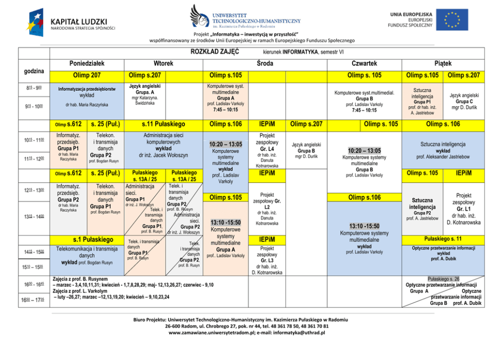 Projekt „Informatyka – inwestycją w przyszłość” współfinansowany ze środków Unii Europejskiej w ramach Europejskiego Funduszu Społecznego ROZKŁAD ZAJĘĆ godzina 815 - 900 915 - 1000 1015 - 1100 1115 - 1200 1215 - 1300 Poniedziałek 1510 – 1555 1600 - 1645 1650 – 1735 Czwartek Piątek Olimp s.207 Olimp s.105 Olimp s. 105 Olimp s.105 Informatyzacja przedsiębiorstw Język angielski Grupa. A Komputerowe syst. multimedialne Grupa A Komputerowe syst.multimedial. Grupa B Sztuczna inteligencja 7:45 – 10:15 7:45 – 10:15 wykład dr hab. Maria Raczyńska mgr Katarzyna. Świdzińska prof. Ladislav Varkoly Olimp s.612 s. 25 (Puł.) s.11 Pułaskiego Informatyz. przedsięb. Grupa P1 Telekon. i transmisja danych Grupa P2 Administracja sieci komputerowych wykład dr inż. Jacek Wołoszyn dr hab. Maria Raczyńska prof. Bogdan Rusyn Olimp s.612 s. 25 (Puł.) Informatyz. przedsięb. Grupa P2 Telekon. i transmisja danych Grupa P1 prof. Bogdan Rusyn s.1 Pułaskiego 1415 - 1500 Środa Olimp 207 dr hab. Maria Raczyńska 1315 - 1400 Wtorek kierunek INFORMATYKA, semestr VI Telekomunikacja i transmisja danych wykład prof. Bogdan Rusyn Pułaskiego s. 13A / 25 Administracja sieci. Grupa P1 dr inż. J. Wołoszyn Pułaskiego s. 13A / 25 Telek. i transmisja danych Grupa P2, Telek. i prof. B. Rusyn transmisja Administracja danych sieci. Grupa P1, prof. B. Rusyn Telek. i transmisja danych Grupa P1, prof. B. Rusyn Grupa P2 dr inż. J. Wołoszyn Telek. i transmisja danych Grupa P2, prof. B. Rusyn prof. Ladislav Varkoly Olimp s.106 IEPiM Olimp s.207 10:20 – 13:05 Projekt zespołowy Gr. L4 Język angielski Grupa B Komputerowe systemy multimedialne wykład prof.. Ladislav Varkoly Olimp s.105 13:10 -15:50 Komputerowe systemy multimedialne Grupa A prof.. Ladislav Varkoly Zajęcia z prof. B. Rusynem – marzec - 3,4,10,11,31; kwiecień - 1,7,8,28,29; maj- 12,13,26,27; czerwiec - 9,10 Zajęcia z prof. L. Varkolym – luty –26,27; marzec –12,13,19,20; kwiecień – 9,10,23,24 dr hab. inż. Danuta Kotnarowska IEPiM mgr D. Durlik Olimp s. 105 10:20 – 13:05 Komputerowe systemy multimedialne Grupa B prof. Ladislav Varkoly Projekt zespołowy Gr. L2 Olimp s.106 dr hab. inż. Danuta Kotnarowska IEPiM Projekt zespołowy Gr. L3 dr hab. inż. D. Kotnarowska 13:10 -15:50 Grupa P1 prof. dr hab. inż. A. Jastriebow Olimp s.207 Język angielski Grupa C mgr D. Durlik Olimp s. 106 Sztuczna inteligencja wykład prof. Aleksander Jastriebow Olimp s. 105 Sztuczna inteligencja Grupa P2 prof. A. Jastriebow IEPiM Projekt zespołowy Gr. L1 dr hab. inż. D. Kotnarowska Komputerowe systemy multimedialne Pułaskiego s. 11 prof. Ladislav Varkoly Optyczne przetwarzanie informacji wykład prof. A. Dubik Biuro Projektu: Uniwersytet Technologiczno-Humanistyczny im. Kazimierza Pułaskiego w Radomiu 26-600 Radom, ul. Chrobrego 27, pok. nr 44, tel. 48 361 78 50, 48 361 70 81 www.zamawiane.uniwersytetradom.pl; e-mail: [email protected] wykład Pułaskiego s. 26 Optyczne przetwarzanie informacji Grupa A Optyczne przetwarzanie informacji Grupa B prof. A. Dubik