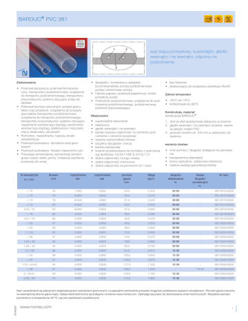 BARDUC® PVC 381 FOOD FREE OF PHTHALAT 1 3 wąż ssący-przesyłowy; superciężki, gładki wewnątrz i na zewnątrz, odporny na podciśnienie 2 Zastosowania • Przemysł spożywczy, przemysł farmaceutyczny: transportery podciśnieniowe, urządzenia do transportu podciśnieniowego, transportery pneumatyczne, systemy dozujące, prasy do tabletek • Przemysł tworzyw sztucznych, przesył granulatów oraz proszków: urządzenia do przesyłu granulatów, transportery podciśnieniowe, urządzenia do transportu podciśnieniowego, transportery pneumatyczne, systemu dozujące, napełnianie worków typu big-bag, opróżnianie worków typu big-bag, szatkownice i niszczarki, młyny, ekstrudery, wtryskarki • Rolnictwo: nawadnianie, nawozy, środki owadobójcze • Przemysł budowlany: obniżenie wód gruntowych • Przemysł budowlany: frezarki nawierzchni ulic • Przyczepy kempingowe, samochody kempingowe, łodzie, statki, jachty: instalacje sanitarne, przewody do wody Ø wewnętrzna • Sprężarki / kompresory, sprężarki bocznokanałowe, pompy podciśnieniowe, pompy ciśnieniowe, pompy • Fabryki papieru, przemysł papierniczy: ścieki, powietrze zużyte • Podnośniki podciśnieniowe, urządzenia do podnoszenia podciśnieniowego: podciśnieniowy przewód doprowadzający • • • • • • • Zakres temperatur • -20°C do 70°C • krótkotrwale do 80°C Konstrukcja, materiał konstrukcja BARDUC® Właściwości • • • • • bez ftalanów • dostosowany do przepisów dyrektywy RoHS superciężkie wykonanie elastyczny gładki wewnątrz i na zewnątrz bardzo wysoka odporność na ciśnienie, podciśnienie i ciśnienie szczytowe wysoka wytrzymałość osiowa szczelny dla gazów i cieczy bardzo wytrzymały ścianki przystosowane do kontaktu z żywnością wg dyrektywy 10/2011WE & 2015/174 dobra odporność na ługi i kwasy dobra odporność chemiczna dobra odporność na promienie UV i ozon 1. drut ze stali sprężynowej zatopiony w ściance 2. gładki wewnątrz i na zewnątrz; ścianka: wysokiej jakości miękki PVC 3. grubość ścianki ok. 3-8 mm w zależności od średnicy warianty dostaw • inne wymiary i długości dostępne na zamówienie • transparentny (standard) • kolory specjalne: całościowo barwiony • nadruk według specyfikacji klienta Ø-zewn. mm nadciśnienie bar podciśnienie bar promień gięcia mm Waga kg/m długości składowania m Dalsze długości produkcyjne m Nr zam. in / mm - / 10 16 7,000 0,850 25,0 0,150 30 60 - 381-0010-0000 - / 12 18 6,000 0,850 30,0 0,210 30 60 - 381-0012-0000 - / 13 19 6,000 0,850 31,5 0,225 30 60 - 381-0013-0000 - / 14 20 6,000 0,850 33,0 0,250 30 60 - 381-0014-0000 5/8 / 16 22 6,000 0,850 37,0 0,265 30 60 - 381-0016-0000 - / 18 25 5,000 0,850 39,0 0,290 30 60 - 381-0018-0000 3/4 / 19 26 5,000 0,850 40,5 0,310 30 60 - 381-0019-0000 - / 20 27 5,000 0,850 45,0 0,320 30 60 - 381-0020-0000 - / 22 29 5,000 0,850 49,0 0,350 30 60 - 381-0022-0000 1 / 25 32 5,000 0,850 72,5 0,490 30 60 - 381-0025-0000 - / 30 37 4,000 0,850 75,0 0,575 30 60 - 381-0030-0000 1,25 / 32 40 4,000 0,850 79,0 0,695 30 60 - 381-0032-0000 1,36 / 35 43 4,000 0,850 82,5 0,750 30 60 - 381-0035-0000 1,5 / 38 46 4,000 0,850 91,0 0,810 15 30 - 381-0038-0000 - / 40 49 4,000 0,850 100,0 0,945 15 30 - 381-0040-0000 - / 42 51 4,000 0,800 104,0 0,970 15 30 - 381-0042-0000 1,75 / 44-45 54 4,000 0,800 117,5 1,105 15 30 - 381-0045-0000 - / 48 57 4,000 0,800 126,0 1,250 - 15 30 381-0048-0000 2 / 50-51 59 4,000 0,800 135,0 1,140 15 30 - 381-0050-0000 2,36 / 60 70 3,600 0,800 170,0 1,680 15 30 - 381-0060-0000 20160220 Nad i podciśnienie są zalecanymi eksploatacyjnymi wartościami granicznymi, na specjalne zamówienie produkty mogą być poddawane wyższym obciążeniom. Promień gięcia mierzony na wewnętrznej stronie gięcia węża. Dalsze dane techniczne są dostępne na stronie www.norres.com. Zastrzega się prawo do dokonywania zmian technicznych. Wszystkie wartości pomierzono w temperaturze 20 °C i są one wartościami przybliżonymi. www.norres.com 1 BARDUC® PVC 381 Ø wewnętrzna FOOD Ø-zewn. mm nadciśnienie bar podciśnienie bar promień gięcia mm Waga kg/m długości składowania m Dalsze długości produkcyjne m Nr zam. in / mm 2,5 / 63-65 76 3,600 0,800 227,5 1,795 15 30 - 381-0065-0000 - / 70 81 3,600 0,700 245,0 2,095 15 30 - 381-0070-0000 3 / 75-76 88 3,600 0,700 262,0 2,250 15 30 - 381-0076-0000 - / 80 93 3,600 0,700 275,0 2,540 10 20 - 381-0080-0000 3,5 / 89-90 103 3,600 0,700 315,0 2,840 10 20 - 381-0090-0000 4 / 100-102 115 3,600 0,700 413,0 3,350 10 20 - 381-0102-0000 Dodatki CLAMP 211 20160220 Nad i podciśnienie są zalecanymi eksploatacyjnymi wartościami granicznymi, na specjalne zamówienie produkty mogą być poddawane wyższym obciążeniom. Promień gięcia mierzony na wewnętrznej stronie gięcia węża. Dalsze dane techniczne są dostępne na stronie www.norres.com. Zastrzega się prawo do dokonywania zmian technicznych. Wszystkie wartości pomierzono w temperaturze 20 °C i są one wartościami przybliżonymi. www.norres.com 2