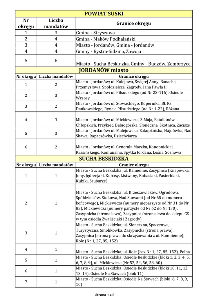 POWIAT SUSKI Nr okręgu 1 2 3 4 Liczba mandatów 3 4 4 4 5 6 Granice okręgu Gmina - Stryszawa Gmina - Maków Podhalański Miasto - Jordanów, Gmina - Jordanów Gminy - Bystra-Sidzina, Zawoja Miasto - Sucha Beskidzka, Gminy - Budzów, Zembrzyce JORDANÓW miasto Nr okręgu Liczba mandatów 1 2 2 3 3 2 4 3 5 3 6 2 Granice okręgu Miasto - Jordanów; ul. Kolejowa, Świętej Anny, Banacha, Przemysłowa, Spółdzielcza, Zagrody, Jana Pawła II Miasto - Jordanów; ul. Piłsudskiego (od Nr 23-116), Osiedle Wrzosy Miasto - Jordanów; ul. Słowackiego, Kopernika, Bł. Ks. Dańkowskiego, Rynek, Piłsudskiego (od Nr 1-22), Różana Miasto - Jordanów; ul. Mickiewicza, 3 Maja, Batalionów Chłopskich, Przykiec, Babiogórska, Słoneczna, Skotnica, Zacisze Miasto - Jordanów; ul. Malejowska, Zakopiańska, Hajdówka, Nad Skawą, Rapaczówka, Dziechciarza Miasto - Jordanów; ul. Generała Maczka, Konopnickiej, Krasińskiego, Komunalna, Spytka Jordana, Leśna, Sosnowa SUCHA BESKIDZKA Nr okręgu Liczba mandatów 1 1 2 1 3 1 4 1 5 1 6 1 7 1 Granice okręgu Miasto - Sucha Beskidzka; ul. Kamienne, Zasypnica (Knapówka, Jony, Jędrzejaki, Kubasy, Listwany, Kubasiaki, Pasierbiaki, Kubiki, Śrubarze) Miasto - Sucha Beskidzka; ul. Krzeszowiaków, Ogrodowa, Spółdzielców, Stokowa, Nad Stawami (od Nr 65 do numeru końcowego), Mickiewicza (numery nieparzyste od Nr 31 do Nr 83), Mickiewicza (numery parzyste od Nr 62 do Nr 130), Zasypnicka (strona lewa), Zasypnica (strona lewa do sklepu GS w tym osiedla Zwaliściaki i Zagrody) Miasto - Sucha Beskidzka; ul. Słoneczna, Spacerowa, Turystyczna, Smolikówka, Zasypnicka (strona prawa), Zasypnica (strona prawa do skrzyżowania z ul. Kamnienne), Role (Nr 1, 27, 85, 152) Miasto - Sucha Beskidzka; ul. Role (bez Nr 1, 27, 85, 152), Polna Miasto - Sucha Beskidzka; Osiedle Beskidzkie (bloki 1, 2, 3, 4, 5, 6, 7, 8, 9), ul. Mickiewicza (Nr 52, 54, 56, 58, 60) Miasto - Sucha Beskidzka; Osiedle Beskidzkie (bloki 10, 11, 12, 13, 14), Osiedle Na Stawach (blok 11) Miasto - Sucha Beskidzka; Osiedle Na Stawach (bloki 6, 7, 8, 9, 10) Strona 1 z 5 8 1 9 1 10 1 11 1 12 1 13 1 14 1 15 1 Miasto - Sucha Beskidzka; Osiedle Na Stawach (bloki 1, 2, 3, 4, 5) Miasto - Sucha Beskidzka; ul. Mickiewicza (numery nieparzyste od Nr 1 do Nr 29 i od Nr 85 do Nr 169), Mickiewicza (numery parzyste od Nr 2 do Nr 50), Szczepkowskiego, Płk. T. Semika, Beniowskiego, Batalionów Chłopskich (część dolna z Nr 2, 233, 239, 241, 250, 255, 260, 262, 265, 267, 271), hr Tarnowskiego, Zamkowa, Wadowicka, Nieszczyńskiej, Rynek, Kościelna, Zakościele, Konopnickiej, Miasto - Sucha Beskidzka; ul. Makowska, Piłsudskiego, Os. Garce, Os. Śpiwle, Os. Pikieta Miasto - Sucha Beskidzka; ul. Dr. Karaś, Krótka, Goetla, Nad Stawami (od Nr 1 do Nr 64), 29 Stycznia, Armii Krajowej "B", Źródlana, Cmentarna Miasto - Sucha Beskidzka; ul. Armii Krajowej, Armii Krajowej "A", Podksięże (bez Osiedla Nowy Świat) Miasto - Sucha Beskidzka; ul. Podksięże (wraz z Osiedlem Nowy Świat), 3 Maja, Szpitalna, Górska, Sumerówka, Nad Skawą, Pod Modrzewiami Miasto - Sucha Beskidzka; ul. Batalionów Chłopskich (część górna bez Nr 2, 233, 239, 241, 250, 255, 260, 262, 265, 267, 271), Przemysłowa, Starzeńskiego, Błądzonka (część dolna z Nr 7, 176, 178, 182, 183, 210, 226, 246, 256, 277), Błądzonka (Osiedla: Włochy, Leguty, Urbańcówka, Listwany, Barzyczaki, Matuski, Pacygówka) Miasto - Sucha Beskidzka; ul. Błądzonka (Osiedla: Kurki, Rzeźniczaki, Koczurówka, Lenarty, Burówka, Pykówka, Knapiki, Dulscy, Książki, Błachuty, Kwaśni, Wajdówka, Lipie) BUDZÓW Nr okręgu Liczba mandatów 1 4 2 5 3 2 4 1 5 2 6 1 Granice okręgu Sołectwo - Bieńkówka Sołectwo - Budzów Sołectwo - Jachówka Sołectwo - Baczyn Sołectwo - Palcza Sołectwo - Zachełmna BYSTRA - SIDZINA Granice okręgu Nr okręgu Liczba mandatów 1 4 Sołectwo - Bystra (część sołectwa; Jaskółkowa Górna, Kulakowa, Radoniowa, Ziętkowa Dolna, Traczowa, Matyjaskowa, Brykowa, Zagrody, Wirtelowa Dolna, Knapikowa, Ziajowa Dolna, Jaskółkowa Dolna, Wronowa, Majerzowa, Zagrody Marfiakowe, Pyrtkowa Górna, Skupniowa Dolna, Pyrtkowa Dolna, Hyćkowa, Ciapałowa, Burkowa, Bachnatowa) Strona 2 z 5 2 3 4 Sołectwo - Bystra (część sołectwa; Hotałowa, Kowalczykowa, Bachorzowa, Gałowa, Szewcowa, Wyjadaczowa, Bednarzowa, Gizowa, Ziętkowa Górna, Traczykowa, Talapkowa Dolna, Heretykowa, Zagrody Smętkowe, Miśkowa, Talapkowa Górna, Wirtelowa Górna, Krzywickowa, Sutorowa, Ziajowa Górna) 3 Sołectwo - Sidzina (część sołectwa; Wielka Polana, ZagrodyKamycko, Polana Staszkowa, Podleśna, Malinowa, Migasy, Jarominy, Kolanowa, Sołtystwo-Łęgi, Krzywickowa, Przybysiowa, Kostkowa, Kulkowa, Mrożkowa, Janeczkowa, Sochowa, Kluskowa, Kotówka, Goryl Dolny, Goryl Górny, Lipowa, Pasternakowa, Motorniowa, Chorążowa) 4 Sołectwo - Sidzina (część sołectwa; Krupowa, Makówka, Wirtelowa, Tempkowa, Stokłóskowa, Mikowa, Frączkowa, Kojsowa, Stramkowa, Chorążakowa, Kurzyńcowa, Kordel Dolny, Kubackowa, Tochowa, Drabowa, Lipkowa, Papajowa, Majowa, Łosiowa, Laskowa, Pastwowa, Czarnowa, Trzopowa, Pociągowa, Szpakowa, Kordel Górny, Mała Sidzinka) 4 JORDANÓW gmina Nr okręgu Liczba mandatów 1 4 2 3 3 4 4 3 5 1 Granice okręgu Sołectwo - Łętownia Sołectwo - Naprawa Sołectwo - Osielec Sołectwo - Toporzysko Sołectwo - Wysoka MAKÓW PODHALAŃSKI Granice okręgu Nr okręgu Liczba mandatów 1 1 Miasto - Maków Podhalański; ul. Leśna, Polna, Szkolna, Wolności (numery parzyste od Nr 134 do Nr 244 i numery nieparzyste od Nr 115 do Nr 223), Osiedla: Pawlicówka, Sarnowa, Działy, Jasnochowa, Mędralowa, Polana, Pykowa, Pyrowa, Rabowa, Stanaszkowa, Spacerowa, oraz Burdylówka, Cyganówka, Judaszówka, Zarąbki (z sołectwa Grzechynia) Strona 3 z 5 2 4 3 2 4 2 5 6 7 2 2 2 Miasto - Maków Podhalański; ul. Gen. Bema, Gen. Dąbrowskiego, Grzechyńska, Krasickiego, Krzywa, Kwiatowa, Lelewela, Łąkowa, Piasta, Gen. Pułaskiego, Sportowa, Wolności (numery parzys