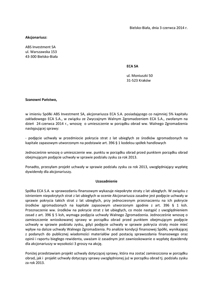 Bielsko-Biała, dnia 3 czerwca 2014 r. Akcjonariusz: ABS Investment SA ul. Warszawska 153 43-300 Bielsko-Biała ECA SA ul. Moniuszki 50 31-523 Kraków Szanowni Państwo, w imieniu Spółki ABS Investment SA, akcjonariusza ECA S.A. posiadającego co najmniej 5% kapitału zakładowego ECA S.A., w związku ze Zwyczajnym Walnym Zgromadzeniem ECA S.A., zwołanym na dzień 24 czerwca 2014 r., wnoszę o umieszczenie w porządku obrad ww. Walnego Zgromadzenia następującej sprawy: - podjęcie uchwały w przedmiocie pokrycia strat z lat ubiegłych ze środków zgromadzonych na kapitale zapasowym utworzonym na podstawie art. 396 § 1 kodeksu spółek handlowych Jednocześnie wnoszę o umieszczenie ww. punktu w porządku obrad przed punktem porządku obrad obejmującym podjęcie uchwały w sprawie podziału zysku za rok 2013. Ponadto, przesyłam projekt uchwały w sprawie podziału zysku za rok 2013, uwzględniający wypłatę dywidendy dla akcjonariuszy. Uzasadnienie Spółka ECA S.A. w sprawozdaniu finansowym wykazuje niepokryte straty z lat ubiegłych. W związku z istnieniem niepokrytych strat z lat ubiegłych w ocenie Akcjonariusza zasadne jest podjęcie uchwały w sprawie pokrycia takich strat z lat ubiegłych, przy jednoczesnym przeznaczeniu na ich pokrycie środków zgromadzonych na kapitale zapasowym utworzonym zgodnie z art. 396 § 1 ksh. Przeznaczenie ww. środków na pokrycie strat z lat ubiegłych, co może nastąpić z uwzględnieniem zasad z art. 396 § 5 ksh, wymaga podjęcia uchwały Walnego Zgromadzenia. Jednocześnie wnoszę o zamieszczenie wnioskowanej sprawy w porządku obrad przed punktem obejmującym podjęcie uchwały w sprawie podziału zysku, gdyż podjęcie uchwały w sprawie pokrycia straty może mieć wpływ na dalsze uchwały Walnego Zgromadzenia. Po analizie kondycji finansowej Spółki, wynikającej z podanych do publicznej wiadomości materiałów pod postacią sprawozdania finansowego oraz opinii i raportu biegłego rewidenta, uważam iż zasadnym jest zawnioskowanie o wypłatę dywidendy dla akcjonariuszy w wysokości 3 groszy na akcję. Poniżej przedstawiam projekt uchwały dotyczącej sprawy, która ma zostać zamieszczona w porządku obrad, jak i projekt uchwały dotyczący sprawy uwzględnionej już w porządku obrad tj. podziału zysku za rok 2013. UCHWAŁA NR _/2014 ZWYCZAJNEGO WALNEGO ZGROMADZENIA AKCJONARIUSZY ECA S.A. z siedzibą w Krakowie z dnia 24 czerwca 2014 r. w sprawie pokrycia strat z lat ubiegłych §1 Zwyczajne Walne Zgromadzenie ECA S.A. postanawia pokryć stratę z lat ubiegłych w wysokości 950.143,40 zł wykazaną w sprawozdaniu finansowym, przeznaczając na pokrycie powyższej straty z lat ubiegłych środki zgromadzone na kapitale zapasowym ECA S.A. utworzonym na podstawie art. 396 § 1 kodeksu spółek handlowych. §2 Uchwała wchodzi w życie z chwilą jej podjęcia. UCHWAŁA NR _/2014 ZWYCZAJNEGO WALNEGO ZGROMADZENIA AKCJONARIUSZY ECA S.A. z siedzibą w Krakowie z dnia 24 czerwca 2014 r. w sprawie przeznaczenia zysku Spółki za 2013 r. §1 1. Na podstawie art. 395 § 2 pkt 2 Kodeksu Spółek Handlowych, Zwyczajne Walne Zgromadzenie Akcjonariuszy ECA S.A. uchwala, iż zysk netto Spółki osiągnięty za rok obrotowy 2013 w wysokości 222.638,62 zł (słownie: dwieście dwadzieścia dwa tysiące sześćset trzydzieści osiem złotych 62/100), zostanie przeznaczony: a) w kwocie 155.625,78 zł, tj. 3 grosze na akcję, na wypłatę dywidendy dla akcjonariuszy; b) w kwocie 67.012,84 zł na kapitał zapasowy Spółki. 2. Z podziału zysku netto za rok obrotowy 2013 zostają wyłączone 693.474 akcje własne posiadane przez Spółkę. Niewypłacona kwota dywidendy przypadająca na akcje własne posiadane przez Spółkę zasila kapitał zapasowy. 3. Dzień dywidendy ustala się na dzień 7 lipca 2014 roku. 4. Termin wypłaty dywidendy ustala się na dzień 18 lipca 2014 roku. §2 Uchwała wchodzi w życie z chwilą jej podjęcia. Akcjonariusz ABS Investment SA