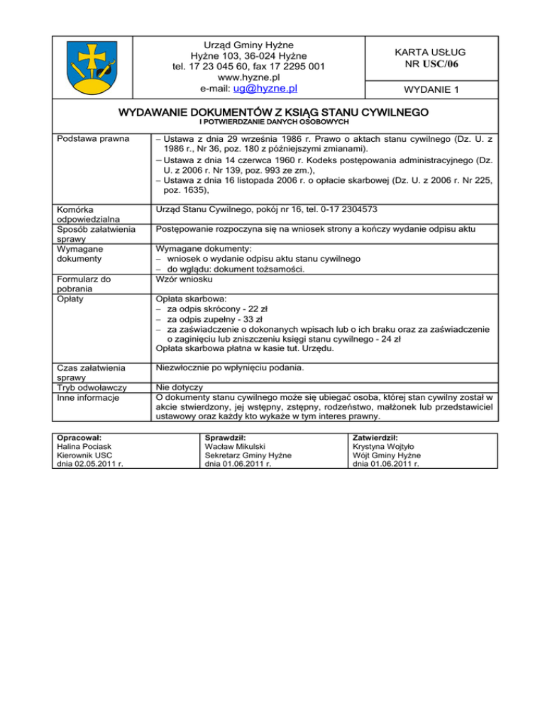 Urząd Gminy Hyżne Hyżne 103, 36-024 Hyżne tel. 17 23 045 60, fax 17 2295 001 www.hyzne.pl e-mail: [email protected] KARTA USŁUG NR USC/06 WYDANIE 1 WYDAWANIE DOKUMENTÓW Z KSIĄG STANU CYWILNEGO I POTWIERDZANIE DANYCH OSOBOWYCH Podstawa prawna − Ustawa z dnia 29 września 1986 r. Prawo o aktach stanu cywilnego (Dz. U. z 1986 r., Nr 36, poz. 180 z późniejszymi zmianami). − Ustawa z dnia 14 czerwca 1960 r. Kodeks postępowania administracyjnego (Dz. U. z 2006 r. Nr 139, poz. 993 ze zm.), − Ustawa z dnia 16 listopada 2006 r. o opłacie skarbowej (Dz. U. z 2006 r. Nr 225, poz. 1635), Komórka odpowiedzialna Sposób załatwienia sprawy Wymagane dokumenty Urząd Stanu Cywilnego, pokój nr 16, tel. 0-17 2304573 Formularz do pobrania Opłaty Czas załatwienia sprawy Tryb odwoławczy Inne informacje Opracował: Halina Pociask Kierownik USC dnia 02.05.2011 r. Postępowanie rozpoczyna się na wniosek strony a kończy wydanie odpisu aktu Wymagane dokumenty: − wniosek o wydanie odpisu aktu stanu cywilnego − do wglądu: dokument tożsamości. Wzór wniosku Opłata skarbowa: − za odpis skrócony - 22 zł − za odpis zupełny - 33 zł − za zaświadczenie o dokonanych wpisach lub o ich braku oraz za zaświadczenie o zaginięciu lub zniszczeniu księgi stanu cywilnego - 24 zł Opłata skarbowa płatna w kasie tut. Urzędu. Niezwłocznie po wpłynięciu podania. Nie dotyczy O dokumenty stanu cywilnego może się ubiegać osoba, której stan cywilny został w akcie stwierdzony, jej wstępny, zstępny, rodzeństwo, małżonek lub przedstawiciel ustawowy oraz każdy kto wykaże w tym interes prawny. Sprawdził: Wacław Mikulski Sekretarz Gminy Hyżne dnia 01.06.2011 r. Zatwierdził: Krystyna Wojtyło Wójt Gminy Hyżne dnia 01.06.2011 r.