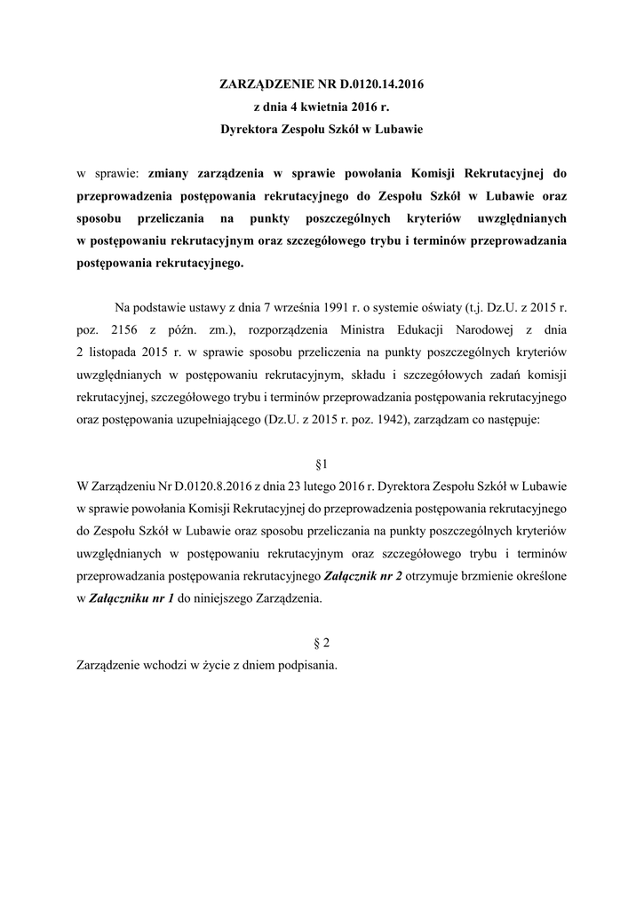 ZARZĄDZENIE NR D.0120.14.2016 z dnia 4 kwietnia 2016 r. Dyrektora Zespołu Szkół w Lubawie w sprawie: zmiany zarządzenia w sprawie powołania Komisji Rekrutacyjnej do przeprowadzenia postępowania rekrutacyjnego do Zespołu Szkół w Lubawie oraz sposobu przeliczania na punkty poszczególnych kryteriów uwzględnianych w postępowaniu rekrutacyjnym oraz szczegółowego trybu i terminów przeprowadzania postępowania rekrutacyjnego. Na podstawie ustawy z dnia 7 września 1991 r. o systemie oświaty (t.j. Dz.U. z 2015 r. poz. 2156 z późn. zm.), rozporządzenia Ministra Edukacji Narodowej z dnia 2 listopada 2015 r. w sprawie sposobu przeliczenia na punkty poszczególnych kryteriów uwzględnianych w postępowaniu rekrutacyjnym, składu i szczegółowych zadań komisji rekrutacyjnej, szczegółowego trybu i terminów przeprowadzania postępowania rekrutacyjnego oraz postępowania uzupełniającego (Dz.U. z 2015 r. poz. 1942), zarządzam co następuje: §1 W Zarządzeniu Nr D.0120.8.2016 z dnia 23 lutego 2016 r. Dyrektora Zespołu Szkół w Lubawie w sprawie powołania Komisji Rekrutacyjnej do przeprowadzenia postępowania rekrutacyjnego do Zespołu Szkół w Lubawie oraz sposobu przeliczania na punkty poszczególnych kryteriów uwzględnianych w postępowaniu rekrutacyjnym oraz szczegółowego trybu i terminów przeprowadzania postępowania rekrutacyjnego Załącznik nr 2 otrzymuje brzmienie określone w Załączniku nr 1 do niniejszego Zarządzenia. §2 Zarządzenie wchodzi w życie z dniem podpisania. Załącznik Nr 1 do Zarządzenia Nr D.0120.14.2016 z dnia 4 kwietnia 2016 r. Dyrektora Zespołu Szkół w Lubawie ZASADY REKRUTACJI W ZESPOLE SZKÓŁ W LUBAWIE NA ROK SZKOLNY 2016/2017 I. Podstawa prawna 1. Ustawa z dnia 7 września 1991 r. o systemie oświaty (t.j. Dz.U. z 2015 r. poz. 2156 z późn. zm.), 2. Rozporządzenie Ministra Edukacji Narodowej z dnia 2 listopada 2015 r. w sprawie sposobu przeliczenia na punkty poszczególnych kryteriów uwzględnianych w postepowaniu rekrutacyjnym, składu i szczegółowych zadań komisji rekrutacyjnej, szczegółowego trybu i terminów przeprowadzania postępowania rekrutacyjnego oraz postępowania uzupełniającego (Dz.U. z 2015 r. poz. 1942), 3. Zarządzenie Nr 18 Warmińsko-Mazurskiego Kuratora Oświaty z dnia 24 marca 2016 r. zmieniające zarządzenie w sprawie ustalenia harmonogramów czynności w postępowaniu rekrutacyjnym oraz postępowaniu uzupełniającym na rok szkolny 2016/2017 do publicznych gimnazjów, szkół ponadgimnazjalnych i szkół dla dorosłych oraz określenia miejsc uznanych za wysokie w zawodach wiedzy, artystycznych i sportowych przez WarmińskoMazurskiego Kuratora Oświaty lub inne podmioty działające na terenie szkoły. II. Terminy składania dokumentów przez kandydatów do klas pierwszych i terminy rekrutacji a) do trzyletniego liceum ogólnokształcącego, czteroletniego technikum, zasadniczej szkoły zawodowej: - złożenie wniosku o przyjęcie do wybranej przez kandydata szkoły– od 5 maja do 22 czerwca 2016 r., - uzupełnienie przez kandydata wniosku o przyjęcie do wybranej szkoły o świadectwo ukończenia gimnazjum (oryginał lub kserokopia świadectwa) oraz zaświadczenie o wynikach egzaminu gimnazjalnego– od 24 czerwca 2016 r. do 28 czerwca 2016 r., - podanie do publicznej wiadomości przez komisję rekrutacyjną listy kandydatów zakwalifikowanych i kandydatów niezakwalifikowanych– 15 lipca 2016 r., godz. 14.00, - wydanie skierowania na badania lekarskie kandydatom z listy kandydatów zakwalifikowanych do Zespołu Szkół w Lubawie –od 15 lipca 2016 r. do 19 lipca 2016 r. - potwierdzenie woli podjęcia nauki przez kandydata umieszczonego na liście kandydatów przyjętych do szkoły w postaci przedłożenia oryginału świadectwa ukończenia gimnazjum i zaświadczenia o wynikach egzaminu gimnazjalnego)– do 21 lipca 2016 r., - podanie do publicznej wiadomości przez komisję rekrutacyjną listy kandydatów przyjętych i kandydatów nieprzyjętych- 22 lipiec 2016 r., godz. 14.00 b) do trzyletniego liceum ogólnokształcącego dla dorosłych na podbudowie ZSZ: - złożenie wniosku o przyjęcie do wybranej przez kandydata szkoły dla dorosłych– od 13 do 28 czerwca 2016 r. - podanie do publicznej wiadomości przez komisję rekrutacyjną listy kandydatów przyjętych i kandydatów nieprzyjętych-20 lipca 2016 r. III. Rekrutacja 1. Rekrutacja do szkół ponadgimnazjalnych odbywa się na podstawie: a) sumy punktów uzyskanych z egzaminu przeprowadzonego w ostatnim roku nauki w gimnazjum przez Okręgową Komisję Egzaminacyjną. b) sumy punktów pochodzących z przeliczenia ocen uzyskanych na świadectwie ukończenia gimnazjum z języka polskiego oraz trzech przedmiotów wybranych w zależności od zawodu lub profilu kształcenia spośród przedmiotów, ujętych w ramowym planie nauczania c) innych, dodatkowych kryteriów. 2. Zasady obliczania punktów: MAX ILOŚĆ PUNKTÓW DO UZYSKANIA- 200 max ilość punktów za wyniki egzaminu gimnazjalnego- 100 za wyniki egzaminu gimnazjalnego z: - języka polskiego - historii i wiedzy o społeczeństwie x% razy 0,2 - matematyki - przedmiotów przyrodniczych - języka obcego nowożytnego w zakresie podstawowym- x% razy 0,2 w roku szkolnym 2016/2017 i 2017/2018 max ilość punktów za świadectwo w tym konkursy- 100 za oceny na świadectwie- max 4 razy 20 pkt= 80 pkt celujący- 20 pkt, bardzo dobry- 16 pkt dobry 12 pkt dostateczny- 8 pkt dopuszczający- 2 pkt wyróżnienie na świadectwie- 5 pkt wolontariat- 2 pkt max ilość punktów możliwych do uzyskania za wszystkie n/w osiągnięcia- 13 pkt I. Uzyskanie w zawodach wiedzy będących konkursem o zasięgu ponadwojewódzkim organizowanym przez kuratorów oświaty na podstawie zawartych porozumień: 1. Tytuł finalisty konkursu przedmiotowego- 10 pkt, 2. Tytuł laureata konkursu tematycznego lub interdyscyplinarnego- 7 pkt, 3. Tytuł finalisty konkursu tematycznego lub interdyscyplinarnego- 5 pkt II. Uzyska