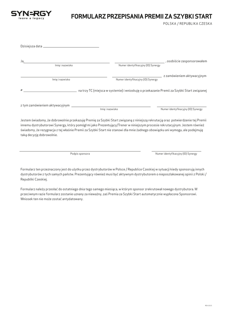FORMULARZ PRZEPISANIA PREMII ZA SZYBKI START POLSKA / REPUBLIKA CZESKA Dzisiejsza data Ja, , osobiście zasponsorowałem Imię i nazwisko Numer identyfikacyjny (ID) Synergy Imię i nazwisko # Numer identyfikacyjny (ID) Synergy z zamówieniem aktywacyjnym na trzy TC (miejsca w systemie) i wnioskuję o przekazanie Premii za Szybki Start związanej z tym zamówieniem aktywacyjnym Imię i nazwisko Numer identyfikacyjny (ID) Synergy Jestem świadomy, że dobrowolnie przekazuję Premię za Szybki Start związaną z niniejszą rekrutacją oraz potwierdzenie tej Premii innemu dystrybutorowi Synergy, który pomógł mi jako Prezentujący/Trener w niniejszym procesie rekrutacyjnym. Jestem również świadomy, że rezygnacja z tej właśnie Premii za Szybki Start nie stanowi dla mnie żadnego obowiązku ani wymogu, ale podejmuję taką decyzję dobrowolnie. Podpis sponsora Numer identyfikacyjny (ID) Synergy Formularz ten przeznaczony jest do użytku przez dystrybutorów w Polsce / Republice Czeskiej w sytuacji kiedy sponsorują innych dystrybutorów z tych samych państw. Prezentujący również musi być aktywnym dystrybutorem o nieposzlakowanej opinii z Polski / Republiki Czeskiej. Formularz należy przesłać do ostatniego dnia tego samego miesiąca, w którym sponsor zrekrutował nowego dystrybutora. W przeciwnym razie formularz zostanie uznany za nieważny, zaś Premia za Szybki Start automatycznie wypłacona Sponsorowi. Wniosek ten nie może zostać antydatowany. REV1015
