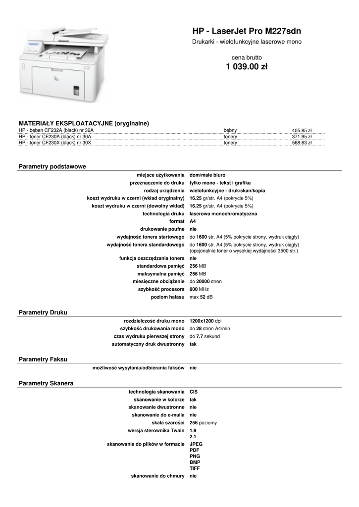 HP - LaserJet Pro M227sdn Drukarki - wielofunkcyjne laserowe mono cena brutto 1 039.00 zł MATERIAŁY EKSPLOATACYJNE (oryginalne) HP - bęben CF232A (black) nr 32A HP - toner CF230A (black) nr 30A HP - toner CF230X (black) nr 30X bębny tonery tonery 405.85 zł 371.95 zł 568.63 zł Parametry podstawowe miejsce użytkowania przeznaczenie do druku rodzaj urządzenia dom/małe biuro tylko mono - tekst i grafika wielofunkcyjne - druk/skan/kopia koszt wydruku w czerni (wkład oryginalny) 16.25 gr/str. A4 (pokrycie 5%) koszt wydruku w czerni (dowolny wkład) 16.25 gr/str. A4 (pokrycie 5%) technologia druku laserowa monochromatyczna format A4 drukowanie poufne nie wydajność tonera startowego do 1600 str. A4 (5% pokrycie strony, wydruk ciągły) wydajność tonera standardowego do 1600 str. A4 (5% pokrycie strony, wydruk ciągły) (opcjonalnie toner o wysokiej wydajności 3500 str.) funkcja oszczędzania tonera nie standardowa pamięć 256 MB maksymalna pamięć 256 MB miesięczne obciążenie szybkość procesora poziom hałasu do 20000 stron 800 MHz max 52 dB Parametry Druku rozdzielczość druku mono szybkość drukowania mono czas wydruku pierwszej strony 1200x1200 dpi do 28 stron A4/min do 7.7 sekund automatyczny druk dwustronny tak możliwość wysyłania/odbierania faksów nie technologia skanowania CIS skanowanie w kolorze tak skanowanie dwustronne nie skanowanie do e-maila nie Parametry Faksu Parametry Skanera skala szarości wersja sterownika Twain skanowanie do plików w formacie skanowanie do chmury 256 poziomy 1.9 2.1 JPEG PDF PNG BMP TIFF nie Parametry Kopiowania rozdzielczość kopiowania szybkość kopiowania zakres skalowania maksymalna liczba kopii automatyczne kopiowanie dwustronne (DADF) 600x600 dpi do 28 kopii/min min 25 % max 400 % 99 nie Obsługa Nośników maksymalna gramatura papieru do 163 g/m² ilość podajników w standardzie 2 automatyczny podajnik dokumentów (ADF) pojemność podajnika automatycznego (ADF) tak 35 arkuszy podajnik na pojedyncze arkusze nie opcjonalny podajnik papieru nie pojemność głównego podajnika papieru maksymalna pojemność podajników pojemność odbiornika papieru podajnik kopert (możliwość drukowania) do 250 arkuszy do 295 arkuszy (250+10+35) do 100 arkuszy tak pojemność podajnika (koperty) do 10 sztuk obsługiwane rodzaje nośników papier zwykły papier fotograficzny papier ekologiczny papier szorstki pocztówki etykiety koperty obsługiwane formaty nośników A4 A5 B5 A6 Języki i Emulacje standardowe języki drukarki PCL 5c PCL 6 PS PCLm PDF URF PWG Komunikacja ethernet - druk w sieci LAN tak wireless - druk przez WiFi nie standardowe rozwiązania komunikacyjne drukowanie z chmury drukowanie z urządzeń mobilnych USB 2.0 Hi-Speed Ethernet 10/100Base-TX tak tak (HP ePrint, Apple AirPrint, Google Cloud Print 2.0) Wymiary i Waga wymiary waga produktu (netto) waga w opakowaniu szerokość min. 403 mm głębokość min. 407.4 mm wysokość min. 311.5 mm szerokość max. 403 mm głębokość max. 624.4 mm wysokość max. 455.6 mm ok. 9.4 kg ok. 31.2 kg Warunki Środowiskowe dopuszczalna wilgotność względna podczas eksploatacji min 30 % max 70 % zalecany zakres temperatur podczas eksploatacji min 15 °C max 32.5 °C Zasilanie rodzaj zasilania sieciowe AC (220-240V) zużycie energii średnio 475 W tryb zmniejszonego poboru mocy tak Energy Star tak Wymagania Systemowe Windows Mac OS UNIX Windows: 10, 8.1, 8, 7: 32-bit/64-bit, Windows Vista: 32-bit MAC OS X El Capitan (v10.11), OS X Yosemite (v10.10), OS X Mavericks (v10.9) Linux Zawartość Opakowania hardware LaserJet Pro MFP M227sdn; Toner HP, czarny (1,600 stron); kabel zasilający; Płyty CD z oprogramowaniem i podręcznikiem użytkownika Inne wyświetlacz LCD 2-wierszowy wyświetlacz tekstowy LCD IPP 1.0 nie dysk twardy (HDD) nie drukowanie znaków wodnych nie Gwarancja service Powered by TCPDF (www.tcpdf.org) 12 miesięcy - w serwisie