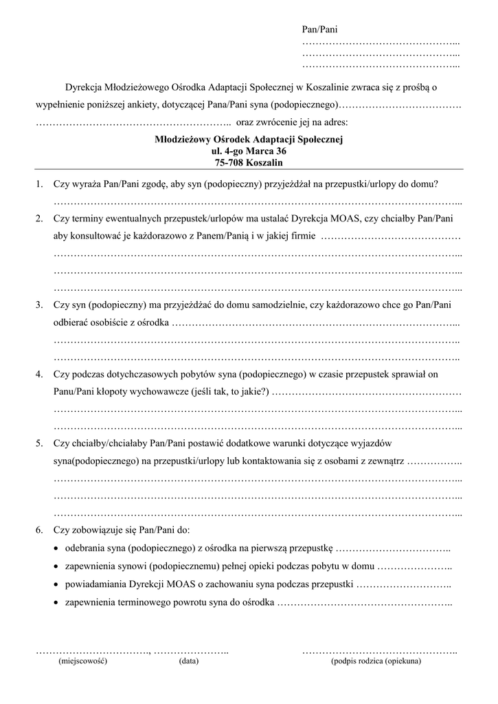 Pan/Pani ………………………………………... ………………………………………... ………………………………………... Dyrekcja Młodzieżowego Ośrodka Adaptacji Społecznej w Koszalinie zwraca się z prośbą o wypełnienie poniższej ankiety, dotyczącej Pana/Pani syna (podopiecznego)………………………………. ………………………………………………….. oraz zwrócenie jej na adres: Młodzieżowy Ośrodek Adaptacji Społecznej ul. 4-go Marca 36 75-708 Koszalin 1. Czy wyraża Pan/Pani zgodę, aby syn (podopieczny) przyjeżdżał na przepustki/urlopy do domu? …………………………………………………………………………………………………………... 2. Czy terminy ewentualnych przepustek/urlopów ma ustalać Dyrekcja MOAS, czy chciałby Pan/Pani aby konsultować je każdorazowo z Panem/Panią i w jakiej firmie …………………………………… …………………………………………………………………………………………………………... …………………………………………………………………………………………………………... …………………………………………………………………………………………………………... 3. Czy syn (podopieczny) ma przyjeżdżać do domu samodzielnie, czy każdorazowo chce go Pan/Pani odbierać osobiście z ośrodka …………………………………………………………………………... ………………………………………………………………………………………………………….. ………………………………………………………………………………………………………….. 4. Czy podczas dotychczasowych pobytów syna (podopiecznego) w czasie przepustek sprawiał on Panu/Pani kłopoty wychowawcze (jeśli tak, to jakie?) ………………………………………………… …………………………………………………………………………………………………………... …………………………………………………………………………………………………………... 5. Czy chciałby/chciałaby Pan/Pani postawić dodatkowe warunki dotyczące wyjazdów syna(podopiecznego) na przepustki/urlopy lub kontaktowania się z osobami z zewnątrz …………….. …………………………………………………………………………………………………………... …………………………………………………………………………………………………………... …………………………………………………………………………………………………………... 6. Czy zobowiązuje się Pan/Pani do: odebrania syna (podopiecznego) z ośrodka na pierwszą przepustkę …………………………….. zapewnienia synowi (podopiecznemu) pełnej opieki podczas pobytu w domu ………………….. powiadamiania Dyrekcji MOAS o zachowaniu syna podczas przepustki ……………………….. zapewnienia terminowego powrotu syna do ośrodka …………………………………………….. ……………………………., ………………….. (miejscowość) (data) ……………………………………….. (podpis rodzica (opiekuna)