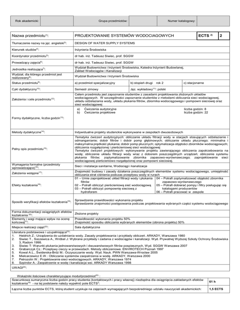 PROJEKTOWANIE SYSTEMÓW WODOCIAGOWYCH ECTS 2) 2