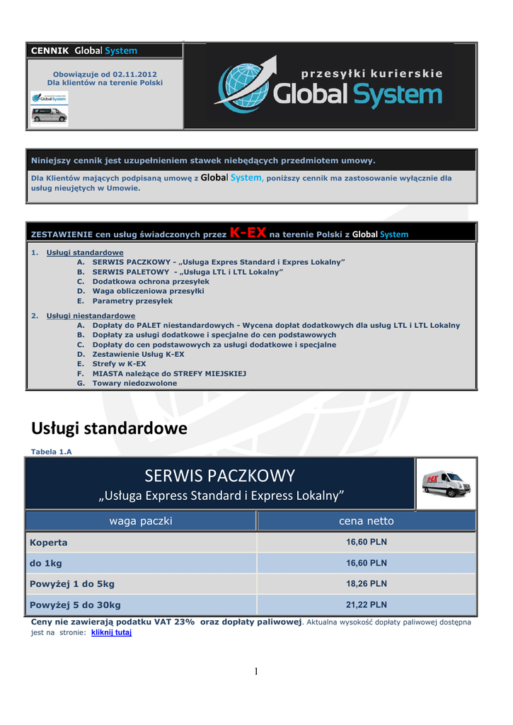 CENNIK Global System Obowiązuje od 02.11.2012 Dla klientów na terenie Polski Niniejszy cennik jest uzupełnieniem stawek niebędących przedmiotem umowy. Dla Klientów mających podpisaną umowę z usług nieujętych w Umowie. Global System, poniższy cennik ma zastosowanie wyłącznie dla ZESTAWIENIE cen usług świadczonych przez K-EX na terenie Polski z Global System 1. Usługi standardowe A. SERWIS PACZKOWY - „Usługa Expres Standard i Expres Lokalny” B. SERWIS PALETOWY - „Usługa LTL i LTL Lokalny” C. Dodatkowa ochrona przesyłek D. Waga obliczeniowa przesyłki E. Parametry przesyłek 2. Usługi niestandardowe A. Dopłaty do PALET niestandardowych - Wycena dopłat dodatkowych dla usług LTL i LTL Lokalny B. Dopłaty za usługi dodatkowe i specjalne do cen podstawowych C. Dopłaty do cen podstawowych za usługi dodatkowe i specjalne D. Zestawienie Usług K-EX E. Strefy w K-EX F. MIASTA należące do STREFY MIEJSKIEJ G. Towary niedozwolone Usługi standardowe Tabela 1.A SERWIS PACZKOWY „Usługa Express Standard i Express Lokalny” waga paczki cena netto Koperta 16,60 PLN do 1kg 16,60 PLN Powyżej 1 do 5kg 18,26 PLN Powyżej 5 do 30kg 21,22 PLN Ceny nie zawierają podatku VAT 23% oraz dopłaty paliwowej. Aktualna wysokość dopłaty paliwowej dostępna jest na stronie: kliknij tutaj 1 Tabela 1.B SERWIS PALETOWY „Usługa LTL i LTL Lokalny” waga palety cena netto do 40 kg 60,00 Powyżej 40 do 60 kg 92,00 Powyżej 60 do 80 kg 158,00 Powyżej 80 do 100 kg 210,00 Powyżej 100 do 300 kg 240,00 Powyżej 300 do 500 kg 280,00 Powyżej 500 do 800 kg 320,00 Powyżej 800 do 1000 kg 460,00 Ceny nie zawierają podatku VAT 23% oraz dopłaty paliwowej. Aktualna wysokość dopłaty paliwowej dostępna jest na stronie: kliknij tutaj Tabela 1.C Dodatkowa ochrona przesyłek deklaracja wartości przesyłki w PLN opłata za dodatkową ochronę w PLN od 0 do 100 PLN* 0,00 powyżej 100 PLN do 10.000 PLN 2,40 powyżej 10.000 PLN do 50.000 PLN 9,99 powyżej 50.000 PLN do 100.000 PLN 0,20% deklarowanej wartości powyżej 100.000 PLN 0,25% deklarowanej wartości po wcześniejszym uzgodnieniu z Global System *Przesyłka do wartości 100 zł jest chroniona w cenie usługi podstawowej pod warunkiem wpisania wartości przesyłki na liście przewozowym. W przypadku zlecenia usługi COD (za pobraniem) przesyłka bez względu na deklarowaną wartość każdorazowo podlega dodatkowej opłacie za ochronę przesyłki. Wysokość opłaty za ochronę przesyłki zostanie naliczona według stawek zawartych w powyższej tabeli. Tabela 1.D Waga obliczeniowa przesyłki Dla określenia wagi przesyłki w odniesieniu do wszystkich usług stosowana jest waga rzeczywista lub przeliczeniowa. Do wyceny usługi stosowana jest waga większa. Jeden metr sześcienny [m³] => (długość [m] x szerokość [m] x wysokość [m]) =100kg 2 Tabela 1.E Parametry przesyłek Paczka Standardowa Paczka Niestandardowa jednolite opakowanie zabezpieczające zawartość waga rzeczywista jednego opakowania do 30kg maksymalne wymiary opakowania: o suma wszystkich wymiarów do 220 cm o długość do 140 cm o szerokość do 80 cm o wysokość do 80 cm waga rzeczywista jednego opakowania do 30kg suma wszystkich wymiarów do 260 cm długość do 180 cm szerokość do 80 cm wysokość do 80 cm Opony opony do samochodów osobowych w rozmiarze do 16 cali należy pakować max po 2 sztuki – wówczas przesyłka traktowana będzie jako opakowanie standardowe pod warunkiem, gdy waga rzeczywista nie przekracza 30 kg, w przypadku spakowania 3-4 sztuk opon w jednej paczce, gdy waga rzeczywista nie przekracza 30kg - zostanie doliczona opłata za przesyłkę niestandardową, gdy waga powyżej 30kg – przesyłka zostanie wyceniona zgodnie z obowiązującą tabelą usługi LTL –serwis paletowy. opony powyżej 16 cali w przypadku nadania opon o rozmiarze przekraczającym 16 cali, każda opona będzie traktowana jako jedna paczka lub jedna paleta (dla opon z przeznaczeniem do samochodów ciężarowych), opony muszą być opakowane folią „strecz” lub taśmą pozwalającą na trwałe umieszczenie listu przewozowego na przesyłce, maksymalna waga rzeczywista jednego opakowania przesyłki dłużycowej do 50kg suma wszystkich wymiarów do 360 cm długość od 180,01 cm do 300 cm szerokość do 40 cm wysokość do 40 cm Przesyłka Dłużycowa Paleta Standardowa Paleta Niestandardowa kształt owalny (z wyłączeniem opon – zasada pakowania opon by były przyjęte do przewozu rubryka niżej) kształty nieregularne, wystające elementy, na której ułożone są skonsolidowane rzeczy tworzące jedną całość przeznaczone do przewozu, niewystające poza obrys palety, towar na palecie musi być umieszczony w sposób uniemożliwiający jego przemieszczenie się w trakcie transportu, waga palety nie może przekroczyć 1000kg wagi brutto jednostka transportowa o wymiarach o wysokość do 200 cm (liczone od podłoża) o długość do 120 cm o szerokość do 80 cm wysokość do 200 cm długość do 120 cm szerokość do 160 cm 3 Opakowanie nadawca jest zobowiązany przekazać przesyłkę do K-EX w stanie umożliwiającym jej prawidłowy przewóz i wydanie bez ubytków oraz uszkodzeń zasady pakowania dostępne na stronie Global System: http://globalsystem.info/informacje Usługi niestandardowe Tabela 2.A Wycena dopłat dodatkowych dla usług LTLi LTL Lokalny Dopłaty do PALET niestandardowych (wysokość do 200cm, długość do 120cm) szerokość do cena 100 cm 74,99 PLN 120 cm 134,99 PLN 160 cm 254,99 PLN Ceny nie zawierają podatku VAT 23% oraz dopłaty paliwowej. Aktualna wysokość dopłaty paliwowej dostępna jest na stronie: kliknij tutaj Tabela 2.C Dopłaty do cen podstawowych za usługi dodatkowe i specjalne usługa opis usługi Odbiór przesyłki spoza strefy miejskiej 0 PLN Odbiór od osoby prywatnej Odbiór w sobotę cena 1,49 PLN wyłącznie w strefie miejskiej dopłata do podstawowej ceny usługi 30,99 PLN Dostawa przesyłki poza strefę miejską 0 PL