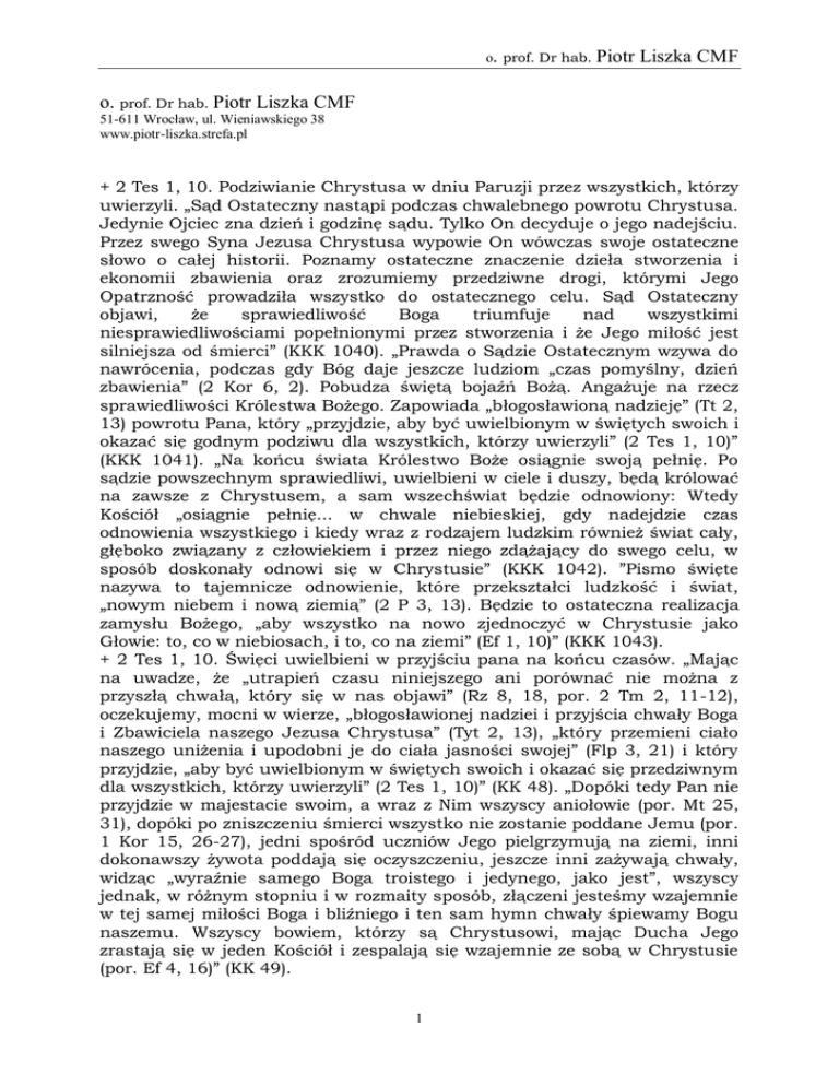 o. prof. Dr hab. Piotr Liszka CMF o. prof. Dr hab. Piotr Liszka CMF 51-611 Wrocław, ul. Wieniawskiego 38 www.piotr-liszka.strefa.pl + 2 Tes 1, 10. Podziwianie Chrystusa w dniu Paruzji przez wszystkich, którzy uwierzyli. „Sąd Ostateczny nastąpi podczas chwalebnego powrotu Chrystusa. Jedynie Ojciec zna dzień i godzinę sądu. Tylko On decyduje o jego nadejściu. Przez swego Syna Jezusa Chrystusa wypowie On wówczas swoje ostateczne słowo o całej historii. Poznamy ostateczne znaczenie dzieła stworzenia i ekonomii zbawienia oraz zrozumiemy przedziwne drogi, którymi Jego Opatrzność prowadziła wszystko do ostatecznego celu. Sąd Ostateczny objawi, że sprawiedliwość Boga triumfuje nad wszystkimi niesprawiedliwościami popełnionymi przez stworzenia i że Jego miłość jest silniejsza od śmierci” (KKK 1040). „Prawda o Sądzie Ostatecznym wzywa do nawrócenia, podczas gdy Bóg daje jeszcze ludziom „czas pomyślny, dzień zbawienia” (2 Kor 6, 2). Pobudza świętą bojaźń Bożą. Angażuje na rzecz sprawiedliwości Królestwa Bożego. Zapowiada „błogosławioną nadzieję” (Tt 2, 13) powrotu Pana, który „przyjdzie, aby być uwielbionym w świętych swoich i okazać się godnym podziwu dla wszystkich, którzy uwierzyli” (2 Tes 1, 10)” (KKK 1041). „Na końcu świata Królestwo Boże osiągnie swoją pełnię. Po sądzie powszechnym sprawiedliwi, uwielbieni w ciele i duszy, będą królować na zawsze z Chrystusem, a sam wszechświat będzie odnowiony: Wtedy Kościół „osiągnie pełnię... w chwale niebieskiej, gdy nadejdzie czas odnowienia wszystkiego i kiedy wraz z rodzajem ludzkim również świat cały, głęboko związany z człowiekiem i przez niego zdążający do swego celu, w sposób doskonały odnowi się w Chrystusie” (KKK 1042). ”Pismo święte nazywa to tajemnicze odnowienie, które przekształci ludzkość i świat, „nowym niebem i nową ziemią” (2 P 3, 13). Będzie to ostateczna realizacja zamysłu Bożego, „aby wszystko na nowo zjednoczyć w Chrystusie jako Głowie: to, co w niebiosach, i to, co na ziemi” (Ef 1, 10)” (KKK 1043). + 2 Tes 1, 10. Święci uwielbieni w przyjściu pana na końcu czasów. „Mając na uwadze, że „utrapień czasu niniejszego ani porównać nie można z przyszłą chwałą, który się w nas objawi” (Rz 8, 18, por. 2 Tm 2, 11-12), oczekujemy, mocni w wierze, „błogosławionej nadziei i przyjścia chwały Boga i Zbawiciela naszego Jezusa Chrystusa” (Tyt 2, 13), „który przemieni ciało naszego uniżenia i upodobni je do ciała jasności swojej” (Flp 3, 21) i który przyjdzie, „aby być uwielbionym w świętych swoich i okazać się przedziwnym dla wszystkich, którzy uwierzyli” (2 Tes 1, 10)” (KK 48). „Dopóki tedy Pan nie przyjdzie w majestacie swoim, a wraz z Nim wszyscy aniołowie (por. Mt 25, 31), dopóki po zniszczeniu śmierci wszystko nie zostanie poddane Jemu (por. 1 Kor 15, 26-27), jedni spośród uczniów Jego pielgrzymują na ziemi, inni dokonawszy żywota poddają się oczyszczeniu, jeszcze inni zażywają chwały, widząc „wyraźnie samego Boga troistego i jedynego, jako jest”, wszyscy jednak, w różnym stopniu i w rozmaity sposób, złączeni jesteśmy wzajemnie w tej samej miłości Boga i bliźniego i ten sam hymn chwały śpiewamy Bogu naszemu. Wszyscy bowiem, którzy są Chrystusowi, mając Ducha Jego zrastają się w jeden Kościół i zespalają się wzajemnie ze sobą w Chrystusie (por. Ef 4, 16)” (KK 49). 1 o. prof. Dr hab. Piotr Liszka CMF + 2 Tes 1, 7-10. Śmierć druga karą wieczną. Charakterystyka sądu ostatecznego według Pisma Świętego: sąd Boży jest straszny (Mt 10, 15; 11, 22-24; 13, 41n; 25, 41; Dz 24, 25), dotyczy najdrobniejszych nawet szczegółów (Mt 12, 36), sędzią jest Bóg (Rz 3, 6), sędzią jest Chrystus (Mt 25, 31; J 5, 27, Rz 2, 16; 1 Kor 4, 5), oskarżać i sądzić będą sprawiedliwi (Mt 12, 42), oskarżać będzie sumienie (J 12, 43), wykonawcami wyroku będą aniołowie (Mt 13, 41), normą decydująca będzie Ewangelia (Rz 2, 16), sądzeni będą: aniołowie odstępcy (2 P 2, 4; Jd 6), ludzie niesprawiedliwi (2 P 2, 9; Jd 15; Ap 11, 8), niebo i ziemia (2 P 3, 7), w wydarzeniu sądu udział wezmą wszyscy ludzie (Ap 20, 11-15), tych, dla których, sąd jest równoznaczny z potępieniem czeka „śmierć druga” i ogień piekielny (Mt 3, 12; 5, 29n; 10, 28; 18, 8; 23, 33; 25, 4.46; 2 Tes 1, 7-10; Jd 7; Ap 19, 10; 21 ,3). + 2 Tes 1, 8n. Piekło przygotowane diabłu i aniołom jego. W piekle znajdują się ludzie zmarli w grzechu śmiertelnym oraz zbuntowani aniołowie. Są pozbawieni tam szczęścia wiekuistego na wieki. (dogmat orzeczony na Soborze Lateraneńskim IV, w konstytucji Benedictus Deus i na Soborze Florenckim /. Rangą nauki teologów posiada twierdzenie: „Istnieje w piekle czynnik materialny, zwany ogniem, a będący narzędziem kary”. Ogień ten wpływa nie tylko na ciało, ale i na duszę; oddziałuje również na szatanów. Kara utraty szczęścia niebieskiego jest co do istoty ta sama u wszystkich potępionych, może być jednak odczuwana w różnym stopniu. Nierówne są też inne kary. Wszyscy odczuwają karę ognia, ale w różny sposób. Ponadto każdy cierpi swoiście w zależności od rodzaju popełnianych na ziemi grzechów. Kościół nigdy nie orzekł, kto z ludzi znajduje się w sytuacji wiekuistego potępienia. Nie należy jednak lekkomyślnie powoływać się na Boże miłosierdzie, po to by spokojnie popełniać zło. Istnieją dwa fundamentalne grzechy przeciwko Duchowi Świętemu, z których jeden to właśnie grzech zuchwałości i lekceważenia Bożych przestróg. Ciągle prawdziwe są słowa Pisma Świętego: „Idźcie precz ode mnie, przeklęci, w ogień wieczny, który jest przygotowany diabłu i aniołom jego” (Mt 25, 41; Por. 2 Tes 1, 8n; Mt 9, 42; 1 Kor 6, 9-11; Ef 5, 5; Ap 20, 15 i inne). Piekła nie potrafimy sobie wyobrazić, ani jego jakości i intensywności, ani jego 