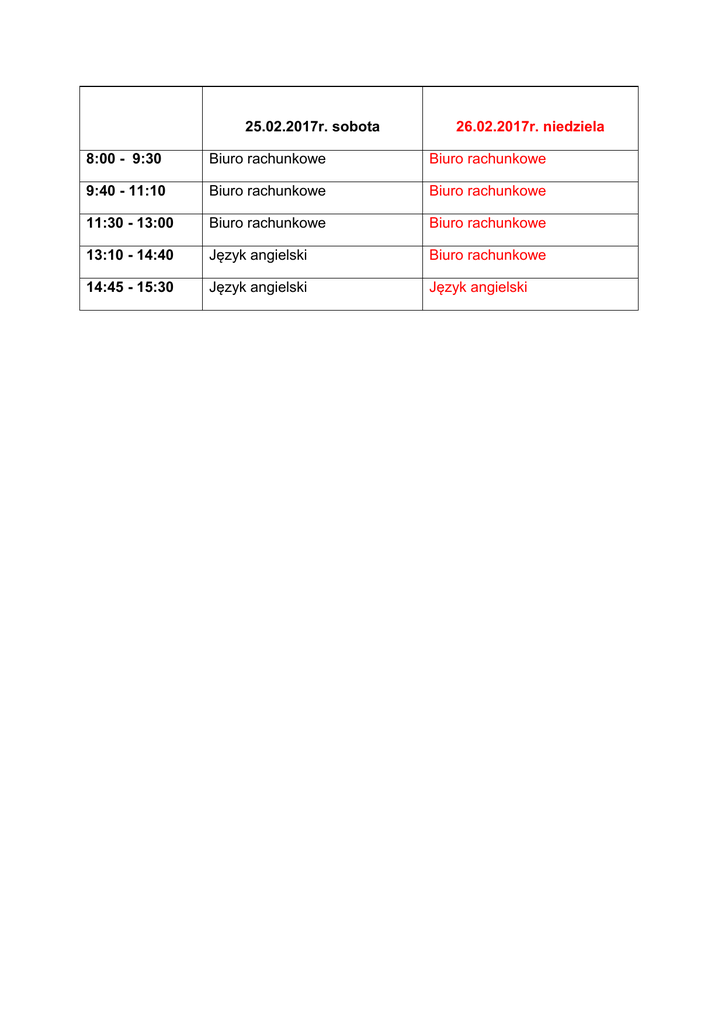 25.02.2017r. sobota 26.02.2017r. niedziela 8:00 - 9:30 Biuro rachunkowe Biuro rachunkowe 9:40 - 11:10 Biuro rachunkowe Biuro rachunkowe 11:30 - 13:00 Biuro rachunkowe Biuro rachunkowe 13:10 - 14:40 Język angielski Biuro rachunkowe 14:45 - 15:30 Język angielski Język angielski