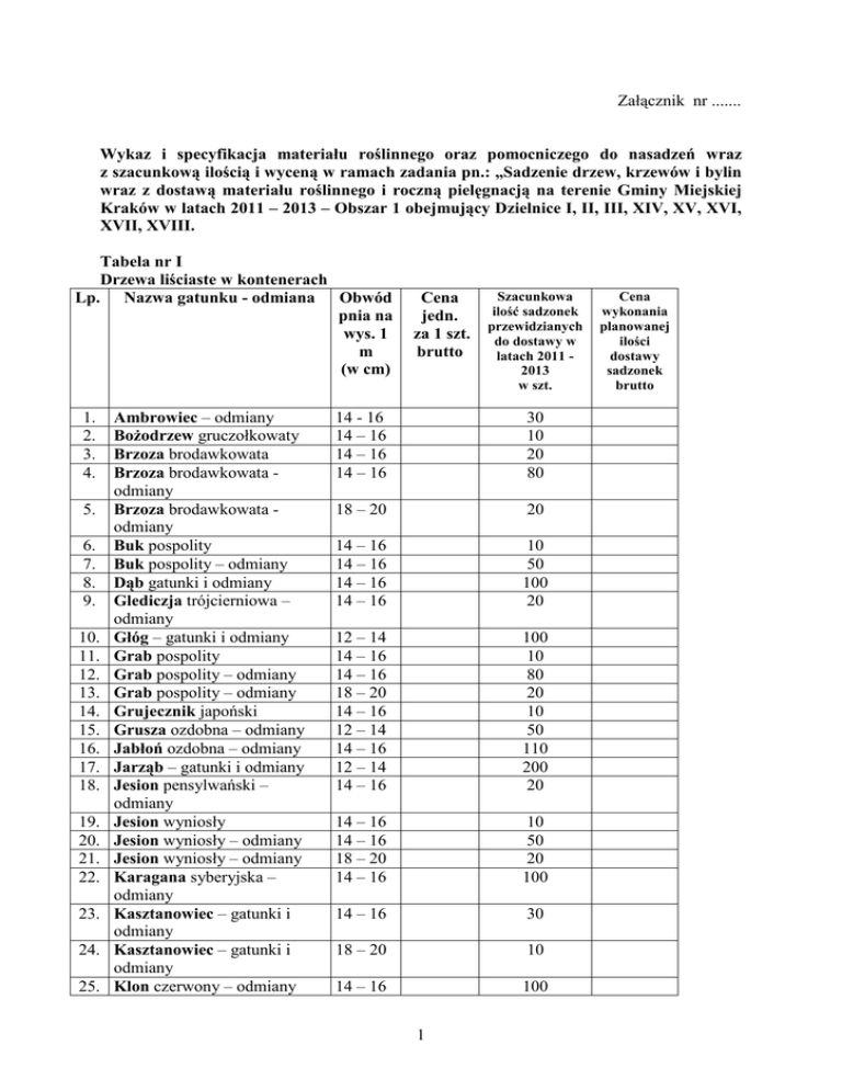 Załącznik nr ....... Wykaz i specyfikacja materiału roślinnego oraz pomocniczego do nasadzeń wraz z szacunkową ilością i wyceną w ramach zadania pn.: „Sadzenie drzew, krzewów i bylin wraz z dostawą materiału roślinnego i roczną pielęgnacją na terenie Gminy Miejskiej Kraków w latach 2011 – 2013 – Obszar 1 obejmujący Dzielnice I, II, III, XIV, XV, XVI, XVII, XVIII. Tabela nr I Drzewa liściaste w kontenerach Lp. Nazwa gatunku - odmiana Obwód pnia na wys. 1 m (w cm) 1. 2. 3. 4. 5. 6. 7. 8. 9. 10. 11. 12. 13. 14. 15. 16. 17. 18. 19. 20. 21. 22. 23. 24. 25. Ambrowiec – odmiany BoŜodrzew gruczołkowaty Brzoza brodawkowata Brzoza brodawkowata odmiany Brzoza brodawkowata odmiany Buk pospolity Buk pospolity – odmiany Dąb gatunki i odmiany Glediczja trójcierniowa – odmiany Głóg – gatunki i odmiany Grab pospolity Grab pospolity – odmiany Grab pospolity – odmiany Grujecznik japoński Grusza ozdobna – odmiany Jabłoń ozdobna – odmiany Jarząb – gatunki i odmiany Jesion pensylwański – odmiany Jesion wyniosły Jesion wyniosły – odmiany Jesion wyniosły – odmiany Karagana syberyjska – odmiany Kasztanowiec – gatunki i odmiany Kasztanowiec – gatunki i odmiany Klon czerwony – odmiany Cena jedn. za 1 szt. brutto Szacunkowa ilość sadzonek przewidzianych do dostawy w latach 2011 2013 w szt. 14 - 16 14 – 16 14 – 16 14 – 16 30 10 20 80 18 – 20 20 14 – 16 14 – 16 14 – 16 14 – 16 10 50 100 20 12 – 14 14 – 16 14 – 16 18 – 20 14 – 16 12 – 14 14 – 16 12 – 14 14 – 16 100 10 80 20 10 50 110 200 20 14 – 16 14 – 16 18 – 20 14 – 16 10 50 20 100 14 – 16 30 18 – 20 10 14 – 16 100 1 Cena wykonania planowanej ilości dostawy sadzonek brutto 26. 27. 28. 29. 30. 31. 32. 33. 34. 35. 36. 37. 38. 39. 40. 41. 42. 43. 44. 45. 46. 47. 48. 49. 50. 51. 52. 53. 54. 55. 56. 57. 58. 59. 60. Klon jawor Klon jawor – odmiany Klon jawor – odmiany Klon jesionolistny – odmiany Klon polny Klon polny ‘Elsrijk’ Klon polny ‘Elsrijk’ Klon polny ‘Nanum’ Klon pospolity Klon pospolity - odmiany Klon pospolity - odmiany Klon tatarski ginnala Leszczyna turecka – odmiany Lipa drobnolistna – odmiany Lipa drobnolistna – odmiany Lipa srebrzysta – odmiany Lipa srebrzysta – odmiany Magnolia – odmiany Miłorząb dwuklapowy – odmiany Olsza – gatunki i odmiany Perełkowiec chiński Platan klonolistny Robinia akacjowa – odmiany Robinia akacjowa – odmiany Surmia bignoniowa – odmiany Śliwa – gatunki i odmiany Świdośliwa – odmiany Topola – odmiany Tulipanowiec amerykański Wiąz holenderski ‘Wredei’ Wiąz szypułkowy – odmiany Wierzba – gatunki i odmiany Wiśnia – gatunki i odmiany Wiśnia pospolita ‘Umbraculifera’ Złotokap – odmiany 14 – 16 14 – 16 18 – 20 14 – 16 14 – 16 14 – 16 18 – 20 14 – 16 14 – 16 14 – 16 18 - 20 14 – 16 14 – 16 14 – 16 18 – 20 14 – 16 18 – 20 12 – 14 14 – 16 10 80 20 30 20 90 20 10 10 120 40 10 100 120 40 120 40 50 20 14 – 16 14 – 16 14 – 16 14 – 16 18 – 20 14 – 16 30 10 50 125 25 20 12 – 14 12 – 14 14 – 16 14 – 16 14 – 16 14 – 16 14 – 16 12 – 14 18 – 20 150 80 10 10 60 20 50 75 40 12 – 14 10 Tabela nr II Krzewy liściaste i pnącza w kontenerach Lp. Nazwa gatunku – odmiana Wysokość rośliny min. (w cm) 2 Cena jedn. za 1 szt. brutto Szacunkowa ilość sadzonek przewidzianych do dostawy w latach 2011 - Cena wykonania planowanej ilości dostawy sadzonek 2013 w szt. 1. 2. 3. 4. 5. 6. 7. 8. 9. 10. 11. 12. 13. 14. 15. 16. 17. 18. 19. 20. 21. 22. 23. 24. 25. 26. 27. 28. 29. 30. 31. 32. 33. 34. 35. 36. 37. 38. 39. 40. 41. 42. 43. 44. Amorfa zwyczajna Azalia – odmiany Berberys – odmiany Bluszcz pospolity Buk pospolity Bukszpan wiecznie zielony Dereń – odmiany Dereń – odmiany Forsycja – odmiany Glicynia – odmiany Grab pospolity Hortensja ogrodowa – odmiany Hortensja pnąca Irga – odmiany Irga – odmiany Jaśminowiec Kalina – odmiany Klon palmowy – odmiany Kolkwitzia chińska Krzewuszka – odmiany Krzewuszka – odmiany Lawenda – odmiany Leszczyna – odmiany Ligustr – odmiany Lilak – odmiany Lilak – odmiany Magnolia – odmiany Mahonia – odmiany Migdałowiec trójklapowy Milin – odmiany Ognik szkarłatny – odmiany Oliwnik – odmiany Parczelina trójlistkowa Perukowiec – odmiany Pęcherznica - odmiany Pięciornik krzewiasty – odmiany Pigwowiec – odmiany Porzeczka – odmiany Rokitnik pospolity RóŜa okrywowa i wielokwiatowa – odmiany RóŜa parkowa – odmiany RóŜa pnąca – odmiany RóŜa pomarszczona - odmiany RóŜa wielkokwiatowa – odmiany 40 – 50 40 – 50 30 – 40 40 – 50 50 – 60 20 – 30 30 – 40 50 – 60 30 – 40 40 – 50 50 – 60 40 – 50 30 – 40 20 – 30 40 – 50 50 – 60 50 – 60 40 – 50 40 – 50 20 – 30 40 – 50 20 – 30 50 – 60 30 – 40 30 – 40 50 – 60 50 – 60 30 – 40 50 – 60 40 – 50 40 – 50 50 – 60 50 – 60 50 – 60 40 – 50 30 – 40 10 10 700 50 150 200 50 50 500 10 200 20 20 600 200 50 20 20 25 200 75 150 150 500 10 10 15 50 20 150 50 150 10 10 750 200 40 – 50 20 – 30 50 – 60 20 – 30 50 300 50 300 30 – 40 50 – 60 30 – 40 30 – 40 50 20 400 20 3 brutto 45. 46. 47. 48. 49. 50. 51. 52. 53. 54. 55. RóŜanecznik – odmiany Suchodrzew – odmiany Suchodrzew – odmiany Śnieguliczka – odmiany Tawuła – odmiany Tawuła – odmiany Trzmielina – odmiany Wiciokrzew – odmiany Winobluszcz – odmiany Złotokap śylistek – odmiany 40 – 50 20 – 30 50 – 60 40 – 50 20 – 30 50 – 60 20 – 30 40 – 50 40 – 50 50 – 60 40 – 50 20 25 25 150 700 150 500 10 200 20 125 Ogółem suma cen brutto: Tabela nr III Drzewa i krzewy iglaste w kontenerach Cena Lp. Nazwa gatunku - odmiana Wysokość Cena jedn. Szacunkowa ilość sadzonek wykonania rośliny za 1 szt. przewidzianych planowanej min. brutto do dostawy w ilości dostawy (w cm) latach 2011 sadzonek 2013 w szt. 1. 2