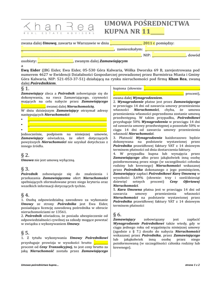 UMOWA POŚREDNICTWA KUPNA NR 11_____ zwana dalej Umową, zawarta w Warszawie w dniu _____________________ 2011 r. pomiędzy: _____________________________________________________________, zamieszkałym: ____________________________________ _______________________________________________________________________________, NIP: ______________________, dowód osobisty: _______________________, zwanym dalej Zamawiającym a Ewą Eider (JBG Eider, Ewa Eider, 05-530 Góra Kalwaria, Wólka Dworska 69 B, zarejestrowana pod numerem 4627 w Ewidencji Działalności Gospodarczej prowadzonej przez Burmistrza Miasta i Gminy Góra Kalwaria, NIP: 521-053-37-51) działającą na rynku nieruchomości pod firmą Khan Rea, zwaną dalej Pośrednikiem. § 1. kupiona (słownie: ________________________________________, Zamawiający zleca a Pośrednik zobowiązuje się do dokonywania, na rzecz Zamawiającego, czynności mających na celu nabycie przez Zamawiającego _________________, zwanej dalej Nieruchomością. W dniu dzisiejszym Zamawiający otrzymał adresy następujących Nieruchomości: • _________________________________________________________ procent), zwana dalej Wynagrodzeniem. 2. Wynagrodzenie płatne jest przez Zamawiającego w przeciągu 14 dni od zawarcia umowy przeniesienia własności Nieruchomości, chyba, że umowa przeniesienia własności poprzedzona zostanie umową przedwstępną. W takim przypadku, Pośrednikowi przysługuje 50% Wynagrodzenia w przeciągu 14 dni od zawarcia umowy przedwstępnej a pozostałe 50% w ciągu 14 dni od zawarcia umowy przeniesienia własność Nieruchomości. 3. Płatność Wynagrodzenia każdorazowo będzie dokonywana na podstawie wystawionej przez Pośrednika prawidłowej faktury VAT z 14 dniowym terminem płatności od dnia dostarczenia faktury. 4. W przypadku kupna lub wynajęcia przez Zamawiającego albo przez jakąkolwiek inną osobę poinformowaną przez niego (w szczególności członka rodziny lub krewnego) Nieruchomości wskazanej przez Pośrednika dokonanego z jego pominięciem, Zamawiający zapłaci Pośrednikowi Karę Umowną w wysokości 3,69% (słownie: trzy i sześćdziesiąt dziewięć setnych procent) Ceny Ofertowej Nieruchomości. 5. Kara Umowna płatna jest w przeciągu 14 dni od zawarcia umowy przeniesienia własności Nieruchomości na podstawie wystawionej przez Pośrednika prawidłowej faktury VAT z 14 dniowym terminem płatności • • _________________________________________________________ _________________________________________________________ Jednocześnie, podpisem na niniejszej umowie, Zamawiający oświadcza, że ofert dotyczących powyższych Nieruchomości nie uzyskał dotychczas z innego źródła. § 2. Umowa nie jest umową wyłączną. § 3. Pośrednik zobowiązuje się do znalezienia i przekazania Zamawiającemu ofert Nieruchomości spełniających sformułowane przez niego kryteria oraz wszelkich informacji dotyczących tychże. § 4. 1. Osobą odpowiedzialną zawodowo za wykonanie Umowy ze strony Pośrednika jest Ewa Eider, posiadająca licencję zawodową pośrednika w obrocie nieruchomościami nr 13561. 2. Pośrednik oświadcza, że posiada ubezpieczenie od odpowiedzialności cywilnej za szkody mogące powstać w związku z wykonywaniem Umowy. § 5. 1. Z tytułu wykonywania Umowy Pośrednikowi przysługuje prowizja w wysokości brutto __________ procent od Ceny Transakcyjnej, to jest ceny brutto za jaką Nieruchomość została przez Zamawiającego Umowa pośrednictwa kupna... ___________________________________________________ § 6. Zamawiający zobowiązany jest zapłacić Wynagrodzenie Pośrednikowi także wtedy, gdy w ciągu jednego roku od wygaśnięciu niniejszej umowy (zgodnie z § 7.) doszło do nabycia Nieruchomości wskazanej przez Pośrednika, przez Zamawiającego lub jakąkolwiek inną osobę przez niego poinformowaną (w szczególności członka rodziny lub krewnego). strona 1 z 2 dnia 29.08.1997 r. o ochronie danych osobowych. § 7. 1. Umowa została zawarta zawarta bezterminowo. Może zostać wypowiedziana przez każdą ze stron w ciągu 14 dniu z zachowaniem formy pisemnej. 2. Rozwiązanie, wypowiedzenie lub odstąpienie od Umowy wymaga od Zamawiającego potwierdzenia wykazu przekazanych ofert Nieruchomości. Odmowa potwierdzenia przez Zamawiającego wspomnianego wykazu Nieruchomości lub przyjęcia korespondencji zawierającej ten wykaz jest bezskuteczna w stosunku do Pośrednika. § 8. Pośrednik informuje Zamawiającego, że możliwe jest zaistnienie sytuacji, w której będzie on wykonywać czynności pośrednictwa także na rzecz sprzedającego Nieruchomość. Zamawiający wyraża na to zgodę. § 9. Zamawiający oświadcza, że nie zawarł żadnej wyłącznej umowy pośrednictwa kupna Nieruchomości w innych agencjach pośrednictwa obrotu nieruchomościami, która uniemożliwiałaby zawarcie Umowy oraz, że wyraża zgodę na przetwarzanie swoich danych osobowych w zakresie niezbędnym do realizacji Umowy zgodnie z ustawą z Zamawiający Umowa pośrednictwa kupna... § 10. Pośrednik nie ponosi odpowiedzialności za działania kupującego i sprzedającego podjęte po zawarciu umowy sprzedaży Nieruchomości a naruszające postanowienia Umowy lub prawa i obowiązki stron. § 11. W sprawach nieuregulowanych postanowieniami Umowy mają zastosowanie odpowiednie przepisy Kodeksu Cywilnego . § 12. Zamawiający oświadcza, że zapoznał się i rozumie warunki Umowy, a jej zapisy zostały omówione, wynegocjowane i są w pełni przez niego akceptowane. § 13. Umowa została sporządzona w dwóch jednobrzmiących egzemplarzach, po jednym dla Zamawiającego i Pośrednika. Pośrednik strona 2 z 2