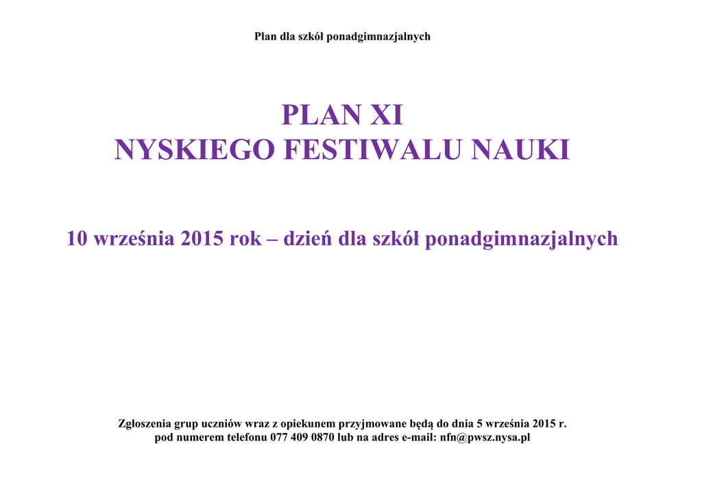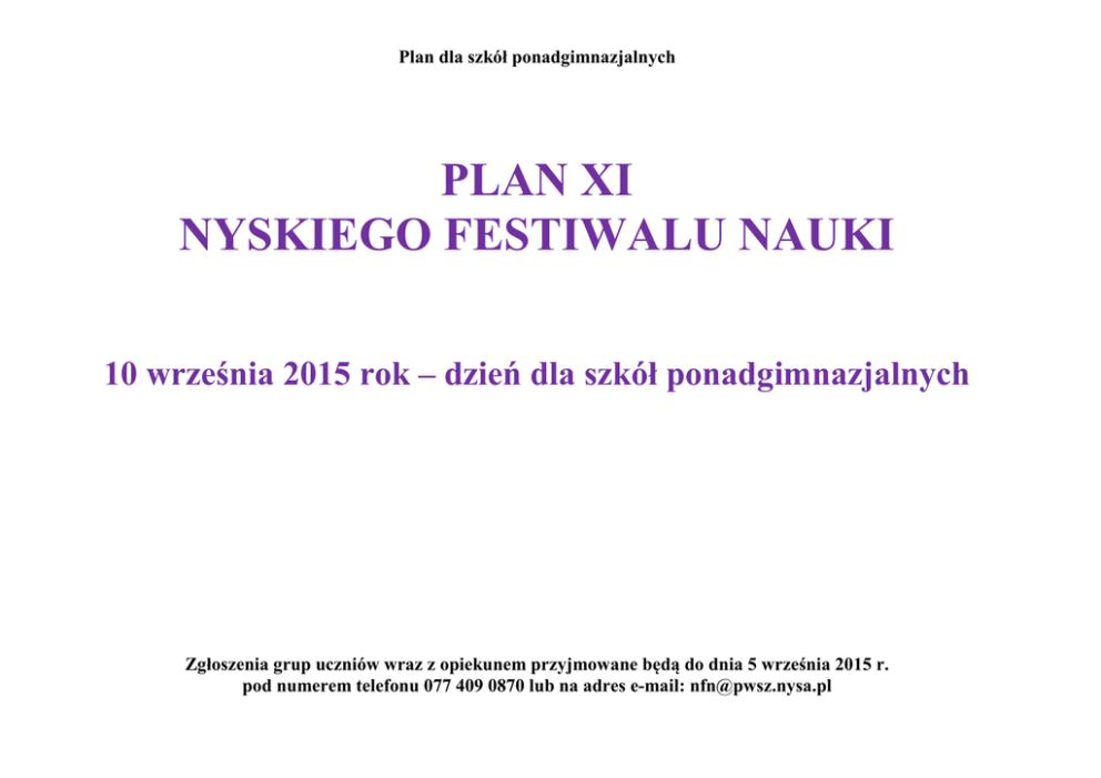 Plan dla szkół ponadgimnazjalnych PLAN XI NYSKIEGO FESTIWALU NAUKI 10 września 2015 rok – dzień dla szkół ponadgimnazjalnych Zgłoszenia grup uczniów wraz z opiekunem przyjmowane będą do dnia 5 września 2015 r. pod numerem telefonu 077 409 0870 lub na adres e-mail: [email protected] Plan dla szkół ponadgimnazjalnych Instytut Architektury i Urbanistyki – Budynek G, ul. Obrońców Tobruku 5 Rynek miasta Nysa Temat Forma (wystawa, wykład, ćwiczenia, laboratoria, warsztaty itp.) Prowadzący Ekspozycja prac studentów – makiet, projektów Ekspozycja prac studentów z przedmiotu plastyka – rysunki. Wystawa mgr Andrzej Jaworski Wiatry, huragany i architektura. Warsztaty Rysunek odręczny – zasady odwzorowania przestrzeni, perspektywa i walor. Wykład Rysunek architektury w plenerze. Zagadnienie perspektywy. Plener rysunkowy Czas (zajęcia od godz. 9.00-14.00) Ilość Osób Sala BO mgr inż. Marcin Zdanowicz dr inż. arch. Grażyna Lasek mgr Ryszard Szymończyk 9.00-14.00 Bud. G 10.00-13.00 30 9.30-10.00 30 10.00-11.30 30 Rynek Bud. G Sala nr 6 Obok obiektów RCTWiTI Instytut Bezpieczeństwa Wewnętrznego – Budynek Regionalnego Centrum Transferu Wiedzy i Technologii Innowacyjnych, ul. Obrońców Tobruku 5 Temat Forma (wystawa, wykład, ćwiczenia, laboratoria, warsztaty itp.) Pokaz walizki kryminalistycznej. Pokaz sprzętu przeciwpożarowego. Ćwiczenia Ćwiczenia Prowadzący mgr Dariusz Bednarz mgr Marek Makówka Czas (zajęcia od godz. 9.00-14.00) 9.00-10.00 10.00-11.00 11.00-12.00 12.00-13.00 Zgłoszenia grup uczniów wraz z opiekunem przyjmowane będą do dnia 5 września 2015 r. pod numerem telefonu 077 409 0870 lub na adres e-mail: [email protected] Ilość osób 30 Sala 1 RCTWiTI 1 RCTWiTI 30 Plan dla szkół ponadgimnazjalnych Instytut Dietetyki – Budynek D, ul. Ujejskiego 12 Temat Forma (wystawa, wykład, ćwiczenia, laboratoria, warsztaty itp.) Co kryje etykieta? Wykład Pomiary antropometryczne ze szczegółową interpretacją wyników. Badania antropometryczne Jak czytać informacje umieszczone na opakowaniach produktów spożywczych. Prowadzący dr n. med., inż. Marta Misiarz prof. Joanna Wyka Czas (zajęcia od godz. 9.00-14.00) Ilość osób 9.00-10.00 50-60 10.00-11.00 25-30 11.00-12.00 25-30 Warsztaty dr n. med., inż. Marta Misiarz Sala 13 D 108 D /109D 10.00-11.00 25-30 11 D 11.00-12.00 25-30 Zgłoszenia grup uczniów wraz z opiekunem przyjmowane będą do dnia 5 września 2015 r. pod numerem telefonu 077 409 0870 lub na adres e-mail: [email protected] Plan dla szkół ponadgimnazjalnych Instytut Finansów – Budynek A, ul. Chodowieckiego 4 Budynek G, ul. Obrońców Tobruku 5 Budynek Regionalnego Centrum Transferu Wiedzy i Technologii Innowacyjnych, ul. Obrońców Tobruku 5 Temat Forma (wystawa, wykład, ćwiczenia, laboratoria, warsztaty itp.) Wykład Ekonofizyka nauką wyjaśniającą związek między energią a kapitałem, entropią i ryzykiem, impetem a wartością przedsiębiorstwa. Celem wykładu jest popularyzowanie matematyki wśród młodzieży gimnazjalnej, inspirowanie i rozwijanie zainteresowań matematycznych, podnoszenie poziomu wiedzy, a przede wszystkim doskonalenie umiejętności operowania procentami w różnych sytuacjach życia codziennego. Wykład + warsztaty Giełda bez tajemnic. Prowadzący Czas (zajęcia od godz. 9.00-14.00) Ilość osób 11.00-12.00 dr inż. Zbigniew Kulas BO Aula duża RCTWiTI 20 21 G Celem wykładu i warsztatów jest poszerzenie wiedzy młodzieży w zakresie inwestowania na giełdzie papierów wartościowych. dr Joanna Szczepańska mgr inż. Adriana Halikowska Wykład prof. Zofia Wilimowska Rektor PWSZ w Nysie 10.00-11.00 BO Aula duża RCTWiTI dr inż. Marek Wilimowski 12.00-13.00 18 209 A dr Marta Targowicz 12.00-13.00 BO Aula duża RCTWiTI Jak ustalić wartość firmy? Celem wykładu jest przybliżenie młodzieży metod wyceny przedsiębiorstwa „Gra w Excel – zaawansowane możliwości Excela”. Warsztaty Celem warsztatów jest przedstawienie możliwości Excela. 11.00-12.00 Wykład + warsztaty Na czym polega zawód księgowego? Sala Celem wykładu i warsztatów jest przybliżenie czynności wykonywanych w ramach zawodu księgowego. Zgłoszenia grup uczniów wraz z opiekunem przyjmowane będą do dnia 5 września 2015 r. pod numerem telefonu 077 409 0870 lub na adres e-mail: [email protected] Plan dla szkół ponadgimnazjalnych Instytut Informatyki – Budynek H, ul. Marcinkowskiego 6-8 Temat Forma (wystawa, wykład, ćwiczenia, laboratoria, warsztaty itp.) Czy programować może każdy? Laboratoria Prowadzący mgr inż. Daniel Halikowski Czas (zajęcia od godz. 9.00-14.00) 9.00-10.00 11.00-12.00 Ilość osób Sala 18 3H Rysujemy algorytmy. Laboratoria mgr inż. Daniel Halikowski 10.00-11.00 18 3H Laboratoria mgr inż. Adam Dudek 9.00-10.00 10.00-11.00 18 1H Laboratoria mgr inż. Adam Dudek 11.00-12.00 18 1H Laboratoria mgr inż. Adam Dudek 12.00-13.00 18 1H Laboratoria mgr inż. Michał Malski 10.00-11.00 11.00-12.00 12.00-13.00 18 2H Grafika inżynierska. Programowanie wizualne robotów. Od zera do gierkodera – programowanie gier. Wirtualizacja czyli matrix dla komputerów. Zgłoszenia grup uczniów wraz z opiekunem przyjmowane będą do dnia 5 września 2015 r. pod numerem telefonu 077 409 0870 lub na adres e-mail: [email protected] Plan dla szkół ponadgimnazjalnych Instytut Kosmetologii Budynek R, ul. Armii Krajowej 7 Budynek D, ul. Ujejskiego 12 Temat Podstawowe techniki i zastosowania inżynierii genetycznej. Prezentacja Instytutu Kosmetologii. „Rola kosmetologa we współczesnym świecie”. Zastosowanie urządzenia - Analizer Nati do diagnostyki kosmetologicznej skóry. „Tajemnica i magia zapachu”. „Czy możesz zostać perfumiarzem? Sprawdź swój nos”. Zastosowanie ultradźwięków w zabiegach pielęgnacyjnych. Pokaz zabiegu jonoforezy oraz peelingu kawitacyjnego. Forma (wystawa, wykład, ćwiczenia, laboratoria, warsztaty itp.) Prowadzący Wykład dr Marcin Błaszczyk Wykład