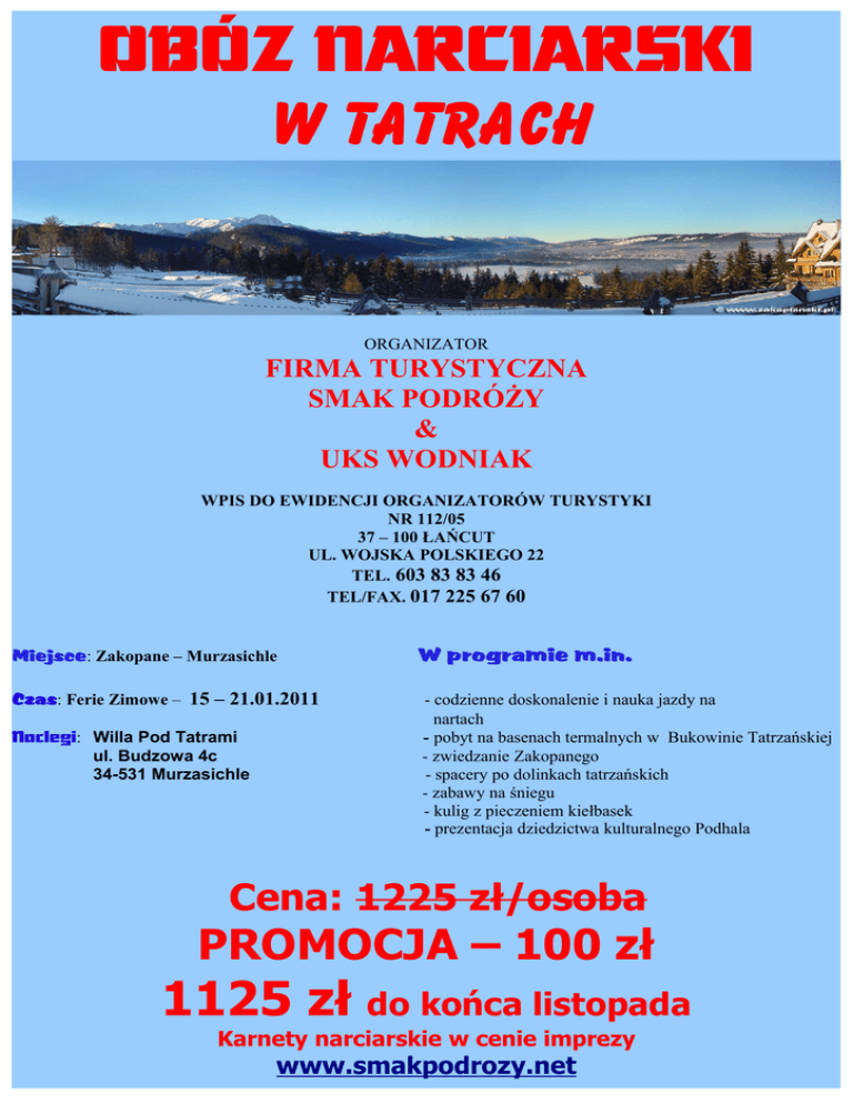 OBÓZ NARCIARSKI W TATRACH ORGANIZATOR FIRMA TURYSTYCZNA SMAK PODRÓŻY & UKS WODNIAK WPIS DO EWIDENCJI ORGANIZATORÓW TURYSTYKI NR 112/05 37 – 100 ŁAŃCUT UL. WOJSKA POLSKIEGO 22 TEL. 603 83 83 46 TEL/FAX. 017 225 67 60 Miejsce: Zakopane – Murzasichle W programie m.in. Czas: Ferie Zimowe – 15 – 21.01.2011 - codzienne doskonalenie i nauka jazdy na nartach - pobyt na basenach termalnych w Bukowinie Tatrzańskiej - zwiedzanie Zakopanego - spacery po dolinkach tatrzańskich - zabawy na śniegu - kulig z pieczeniem kiełbasek - prezentacja dziedzictwa kulturalnego Podhala Noclegi: Willa Pod Tatrami ul. Budzowa 4c 34-531 Murzasichle Cena: 1225 zł/osoba PROMOCJA – 100 zł 1125 zł do końca listopada Karnety narciarskie w cenie imprezy www.smakpodrozy.net