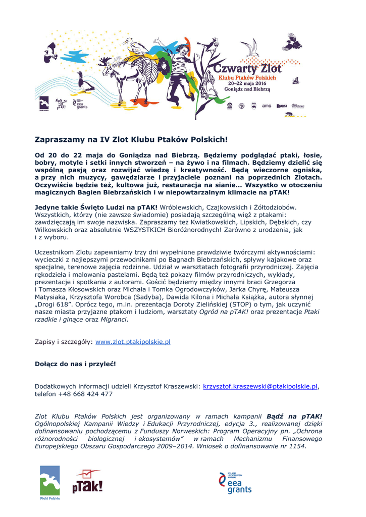 Zapraszamy na IV Zlot Klubu Ptaków Polskich! Od 20 do 22 maja do Goniądza nad Biebrzą. Będziemy podglądać ptaki, łosie, bobry, motyle i setki innych stworzeń – na żywo i na filmach. Będziemy dzielić się wspólną pasją oraz rozwijać wiedzę i kreatywność. Będą wieczorne ogniska, a przy nich muzycy, gawędziarze i przyjaciele poznani na poprzednich Zlotach. Oczywiście będzie też, kultowa już, restauracja na sianie... Wszystko w otoczeniu magicznych Bagien Biebrzańskich i w niepowtarzalnym klimacie na pTAK! Jedyne takie Święto Ludzi na pTAK! Wróblewskich, Czajkowskich i Żółtodziobów. Wszystkich, którzy (nie zawsze świadomie) posiadają szczególną więź z ptakami: zawdzięczają im swoje nazwiska. Zapraszamy też Kwiatkowskich, Lipskich, Dębskich, czy Wilkowskich oraz absolutnie WSZYSTKICH Bioróżnorodnych! Zarówno z urodzenia, jak i z wyboru. Uczestnikom Zlotu zapewniamy trzy dni wypełnione prawdziwie twórczymi aktywnościami: wycieczki z najlepszymi przewodnikami po Bagnach Biebrzańskich, spływy kajakowe oraz specjalne, terenowe zajęcia rodzinne. Udział w warsztatach fotografii przyrodniczej. Zajęcia rękodzieła i malowania pastelami. Będą też pokazy filmów przyrodniczych, wykłady, prezentacje i spotkania z autorami. Gościć będziemy między innymi braci Grzegorza i Tomasza Kłosowskich oraz Michała i Tomka Ogrodowczyków, Jarka Chyrę, Mateusza Matysiaka, Krzysztofa Worobca (Sadyba), Dawida Kilona i Michała Książka, autora słynnej „Drogi 618”. Oprócz tego, m.in. prezentacja Doroty Zielińskiej (STOP) o tym, jak uczynić nasze miasta przyjazne ptakom i ludziom, warsztaty Ogród na pTAK! oraz prezentacje Ptaki rzadkie i ginące oraz Migranci. Zapisy i szczegóły: www.zlot.ptakipolskie.pl Dołącz do nas i przyleć! Dodatkowych informacji udzieli Krzysztof Kraszewski: [email protected], telefon +48 668 424 477 Zlot Klubu Ptaków Polskich jest organizowany w ramach kampanii Bądź na pTAK! Ogólnopolskiej Kampanii Wiedzy i Edukacji Przyrodniczej, edycja 3., realizowanej dzięki dofinansowaniu pochodzącemu z Funduszy Norweskich: Program Operacyjny pn. „Ochrona różnorodności biologicznej i ekosystemów” w ramach Mechanizmu Finansowego Europejskiego Obszaru Gospodarczego 2009–2014. Wniosek o dofinansowanie nr 1154.