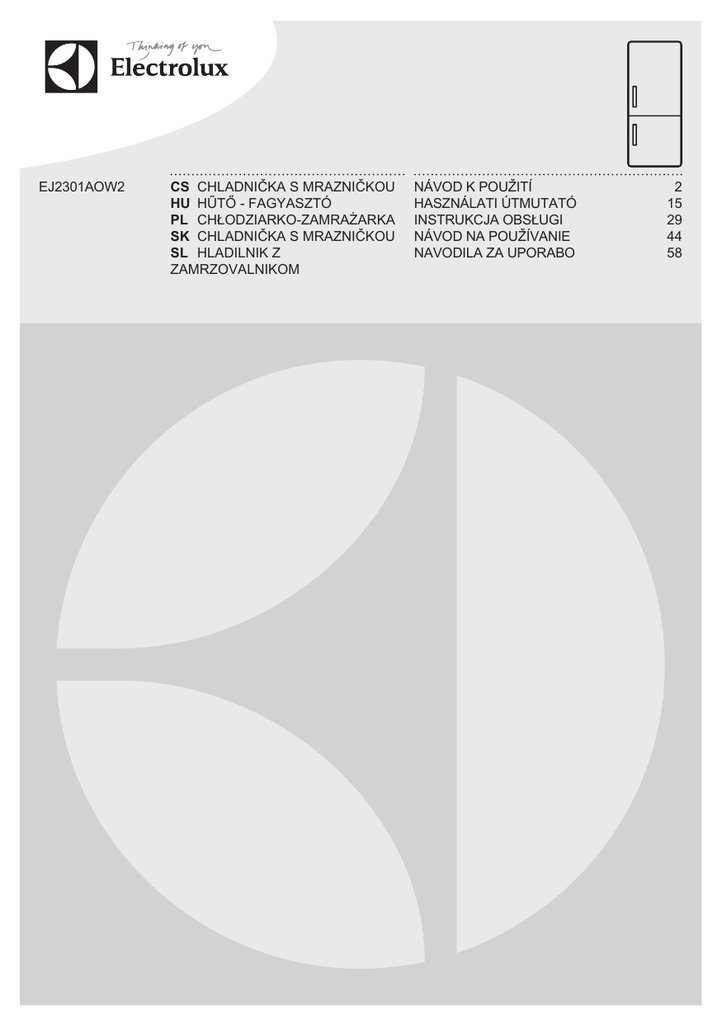 EJ2301AOW2 CS CHLADNIČKA S MRAZNIČKOU HU HŰTŐ - FAGYASZTÓ PL CHŁODZIARKO-ZAMRAŻARKA SK CHLADNIČKA S MRAZNIČKOU SL HLADILNIK Z ZAMRZOVALNIKOM NÁVOD K POUŽITÍ HASZNÁLATI ÚTMUTATÓ INSTRUKCJA OBSŁUGI NÁVOD NA POUŽÍVANIE NAVODILA ZA UPORABO 2 15 29 44 58 2 www.electrolux.com OBSAH 1. BEZPEČNOSTNÍ INFORMACE......................................................................... 3 2. BEZPEČNOSTNÍ POKYNY................................................................................4 3. PROVOZ.............................................................................................................6 4. PŘI PRVNÍM POUŽITÍ........................................................................................6 5. DENNÍ POUŽÍVÁNÍ............................................................................................ 6 6. TIPY A RADY..................................................................................................... 8 7. ČIŠTĚNÍ A ÚDRŽBA.......................................................................................... 9 8. ODSTRAŇOVÁNÍ ZÁVAD................................................................................ 10 9. INSTALACE......................................................................................................12 10. TECHNICKÉ INFORMACE............................................................................ 13 MYSLÍME NA VÁS Děkujeme, že jste si zakoupili spotřebič značky Electrolux. Vybrali jste si produkt, se kterým jsou spjaty desítky let profesionálních zkušeností a inovací. Tento důmyslný a stylový spotřebič byl navržen s ohledem na jeho uživatele. Kdykoliv jej proto používáte, můžete se spolehnout, že pokaždé dosáhnete skvělých výsledků. Vítá Vás Electrolux. Navštivte naše stránky ohledně: Rady ohledně používání, brožury, poradce při potížích, servisních informací: www.electrolux.com Registrace vašeho spotřebiče, kterou získáte lepší servis: www.registerelectrolux.com Nákupu příslušenství, spotřebního materiálu a originálních náhradních dílů pro váš spotřebič: www.electrolux.com/shop PÉČE O ZÁKAZNÍKY A SERVIS Doporučujeme používat originální náhradní díly. Při kontaktu se servisním střediskem se ujistěte, že máte k dispozici následující údaje: Model, výrobní číslo (PNC), sériové číslo. Tyto informace jsou uvedeny na typovém štítku. Upozornění / Důležité bezpečnostní informace Všeobecné informace a rady Poznámky k ochraně životního prostředí Zmĕny vyhrazeny. ČESKY 1. 3 BEZPEČNOSTNÍ INFORMACE Tento návod si pečlivě přečtěte ještě před instalací spotřebiče a jeho prvním použitím. Výrobce nezodpovídá za škody a zranění způsobená nesprávnou instalací či chybným používáním. Návod k použití vždy uchovávejte spolu se spotřebičem pro jeho budoucí použití. 1.1 Bezpečnost dětí a postižených osob • • • • Tento spotřebič smí používat děti starší osmi let nebo osoby se sníženými fyzickými, smyslovými nebo duševními schopnostmi nebo osoby bez patřičných zkušeností a znalostí, pouze pokud tak činí pod dozorem nebo vedením, které zohledňuje bezpečný provoz spotřebiče, a pokud rozumí rizikům spojeným s provozem spotřebiče. Nenechte děti hrát si se spotřebičem. Všechny obaly uschovejte z dosahu dětí. Čištění a uživatelskou údržbu spotřebiče by neměly provádět děti bez dozoru. 1.2 Všeobecné bezpečnostní informace • • • • Tento spotřebič je určen pro použití v domácnosti a pro následující způsoby použití: – Ve farmářských domech, v kuchyňkách pro zaměstnance v obchodech, kancelářích a jiných pracovních prostředích – Pro zákazníky hotelů, motelů, penzionů a jiných ubytovacích zařízení Udržujte volně průchodné větrací otvory na povrchu spotřebiče nebo kolem vestavěného spotřebiče. K urychlení odmrazování nepoužívejte mechanické ani jiné pomocné prostředky, které nejsou doporučeny výrobcem. Nepoškozujte chladicí okruh. 4 www.electrolux.com • • • • • V prostoru chladicích spotřebičů nepoužívejte jiné elektrické přístroje, než typy schválené k tomuto účelu výrobcem. K čištění spotřebiče nepoužívejte proud vody nebo páru. Vyčistěte spotřebič vlhkým měkkým hadrem. Používejte pouze neutrální mycí prostředky. Nepoužívejte prostředky s drsnými částicemi, drátěnky, rozpouštědla nebo kovové předměty. V tomto spotřebiči neuchovávejte výbušné směsi, jako např. aerosolové spreje s hořlavým hnacím plynem. Jestliže je poškozený přívodní kabel, smí ho vyměnit pouze výrobce, servisní technik nebo osoba s podobnou příslušnou kvalifikací, jinak by mohlo dojít k úrazu. 2. BEZPEČNOSTNÍ POKYNY 2.1 Instalace UPOZORNĚNÍ! Tento spotřebič smí instalovat jen kvalifikovaná osoba. • • • • • • • • • • Odstraňte veškerý obalový materiál. Poškozený spotřebič neinstalujte ani nepoužívejte. Řiďte se pokyny k instalaci dodanými spolu s tímto spotřebičem. Při přemisťování spotřebiče buďte vždy opatrní, protože je těžký. Vždy noste ochranné rukavice. Přesvědčte se, že vzduch může okolo spotřebiče volně proudit. Počkejte alespoň čtyři hodiny, než spotřebič připojíte k napájení. Olej tak může natéct zpět do kompresoru. Neinstalujte spotřebič v blízkosti topidel, sporáků, trub či varných desek. Zadní stěna spotřebiče musí být umístěna směrem ke zdi. Neinstalujte spotřebič tam, kde by se dostal do přímého slunečního světla. Neinstalujte spotřebič v příliš vlhkých či příliš chladných místech, jako jsou přístavby, garáže či vinné sklepy. • Při přemisťování spotřebiče jej nadzdvihněte za přední okraj, abyste zabránili poš