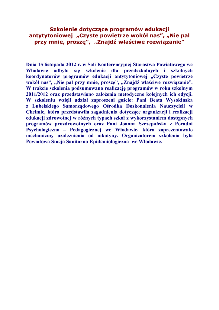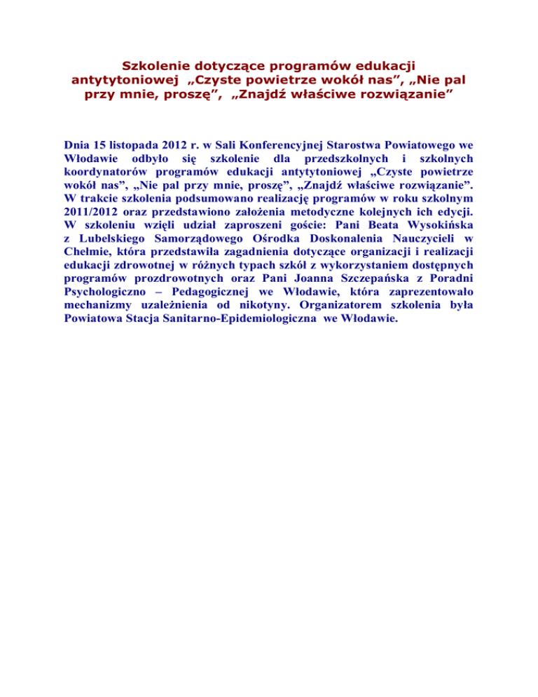 Szkolenie dotycz ce programów edukacji antytytoniowej „Czyste powietrze wokó nas”, „Nie pal przy mnie, prosz ”, „Znajd w ciwe rozwi zanie” Dnia 15 listopada 2012 r. w Sali Konferencyjnej Starostwa Powiatowego we odawie odby o si szkolenie dla przedszkolnych i szkolnych koordynatorów programów edukacji antytytoniowej „Czyste powietrze wokó nas”, „Nie pal przy mnie, prosz ”, „Znajd w ciwe rozwi zanie”. W trakcie szkolenia podsumowano realizacj programów w roku szkolnym 2011/2012 oraz przedstawiono za enia metodyczne kolejnych ich edycji. W szkoleniu wzi li udzia zaproszeni go cie: Pani Beata Wysoki ska z Lubelskiego Samorz dowego O rodka Doskonalenia Nauczycieli w Che mie, która przedstawi a zagadnienia dotycz ce organizacji i realizacji edukacji zdrowotnej w ró nych typach szkó z wykorzystaniem dost pnych programów prozdrowotnych oraz Pani Joanna Szczepa ska z Poradni Psychologiczno – Pedagogicznej we W odawie, która zaprezentowa o mechanizmy uzale nienia od nikotyny. Organizatorem szkolenia by a Powiatowa Stacja Sanitarno-Epidemiologiczna we W odawie.