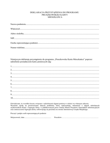 DEKLARACJA PRZYSTĄPIENIA DO PROGRAMU PRUSZKOWSKIEJ KARTY MIESZKAŃCA Nazwa podmiotu..................................................................................................................................... Właściciel............................................................................................................................................... Adres siedziby........................................................................................................................................ NIP.......................................................................................................................................................... Osoba reprezentująca podmiot............................................................................................................... Numer telefonu...................................................................................................................................... Niniejszym deklaruję przystąpienie do programu „Pruszkowska Karta Mieszkańca” poprzez udzielenie posiadaczom karty poniższych ulg: 1.............................................................................................................................................................. 2.............................................................................................................................................................. 3.............................................................................................................................................................. 4.............................................................................................................................................................. 5.............................................................................................................................................................. 6.............................................................................................................................................................. 7.............................................................................................................................................................. 8.............................................................................................................................................................. 9.............................................................................................................................................................. 10............................................................................................................................................................ Oświadczam, że wszelkie koszty związane z udzielonymi ulgami poniosę w całości we własnym zakresie. Wyrażam zgodę na przetwarzanie danych podmiotu, który reprezentuję, informacji o ulgach udzielanych użytkownikom Karty i logotypu firmy, w publikowanych przez Gminę Miasta Pruszków materiałach informacyjnych oraz umieszczenie logotypu (który zobowiązuję się przesłać) na stronie internetowej Urzędu Miejskiego. Pieczęć i podpis osób reprezentujących podmiot Miejscowość, data ......................................................... Pruszków……………………………………………………