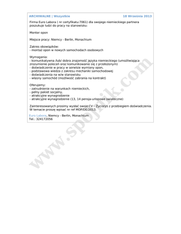 ARCHIWALNE | Wszystkie 18 Września 2013 Firma Euro Labora ( nr certyfikatu:7061) dla swojego niemieckiego partnera poszukuje ludzi do pracy na stanowisku: Monter opon Miejsce pracy: Niemcy - Berlin, Monachium Zakres obowiązków: - montaż opon w nowych samochodach osobowych .c o m Wymagania: - komunikatywna /lub/ dobra znajomość języka niemieckiego (umożliwiająca zrozumienie poleceń oraz komunikowanie się z przełożonym) - doświadczenie w pracy w serwisie wymiany opon, - podstawowa wiedza z zakresu mechaniki samochodowej - doświadczenia na w/w stanowisku - własny samochód (możliwość zabrania na kontrakt) jn ik Oferujemy: - zatrudnienie na warunkach niemieckich, - pełny pakiet socjalny, - atrakcyjne wynagrodzenie - atrakcyjne wynagrodzenie (13, 14 pensja-urlopowe swiateczne) Zainteresowanych prosimy wysłać swoje CV – Życiorys z przebiegiem doświadczenia. W temacie proszę wpisać nr ref MOP/DE/2013. w w w .s po Euro Labora, Niemcy - Berlin, Monachium Tel.: 324172056