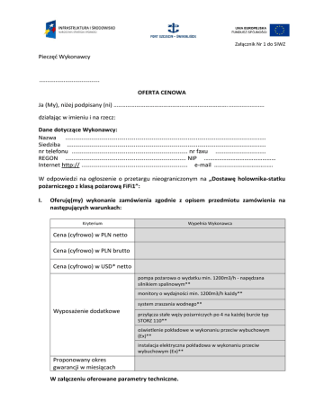 Załącznik Nr 1 do SIWZ Pieczęć Wykonawcy ..................................... OFERTA CENOWA Ja (My), niżej podpisany (ni) …………………………………………………………………. ...................... działając w imieniu i na rzecz: Dane dotyczące Wykonawcy: Nazwa ........................................................................................................................... Siedziba .......................................................................................................................... nr telefonu ....................................................................... nr faxu ............................... REGON .......................................................................... NIP ………………………………………… Internet http:// ................................................................. e-mail ……………………………..…. W odpowiedzi na ogłoszenie o przetargu nieograniczonym na „Dostawę holownika-statku pożarniczego z klasą pożarową FiFi1”: I. Oferuję(my) wykonanie zamówienia zgodnie z opisem przedmiotu zamówienia na następujących warunkach: Kryterium Wypełnia Wykonawca Cena (cyfrowo) w PLN netto Cena (cyfrowo) w PLN brutto Cena (cyfrowo) w USD* netto pompa pożarowa o wydatku min. 1200m3/h - napędzana silnikiem spalinowym** monitory o wydajności min. 1200m3/h każdy** system zraszania wodnego** Wyposażenie dodatkowe przyłącza stałe węży pożarniczych po 4 na każdej burcie typ STORZ 110** oświetlenie pokładowe w wykonaniu przeciw wybuchowym (Ex)** instalacja elektryczna pokładowa w wykonaniu przeciw wybuchowym (Ex)** Proponowany okres gwarancji w miesiącach W załączeniu oferowane parametry techniczne. Załącznik Nr 1 do SIWZ * W przypadku, gdy kwota w złożonej przez Wykonawcę ofercie, wyrażona będzie w walucie innej niż PLN Zamawiający w celu porównania ofert dokona przeliczenia wartości tej kwoty z walut obcych na PLN przy zastosowaniu średniego kursu NBP z dnia publikacji ogłoszenia o zamówieniu w Dzienniku Urzędowym Unii Europejskiej. ** Wykreślić sprzęt, którego Wykonawca nie oferuje ! II. Oświadczam(my), że powierzę(my) do wykonania podwykonawcom następujące części zamówienia: ………………………………………………………………………………………………………………………………………. (w razie braku wskazania, Zamawiający uznaje, że Wykonawca nie zamierza powierzyć żadnej części zamówienia podwykonawcom) III. Oświadczamy, że żądamy / nie żądamy*** by w zakresie nieuregulowanym umową zastosowanie miało prawo angielskie. (niewykonanie odpowiedniego skreślenia w tym punkcie oznacza, że przyjmuję/emy warunki postawione przez Zamawiającego w siwz i nie zamierzam/my zaproponować odmiennych) IV. Oświadczam(y), iż przedmiot zamówienia zrealizuję(my) w terminie określonym w siwz. V. Oświadczam(y), że jestem(śmy) związany(ni) niniejszą ofertą przez okres 60 dni od upływu terminu składania ofert. VI. Pod groźbą odpowiedzialności karnej oświadczam(y), że załączone do oferty dokumenty opisują stan prawny i faktyczny, aktualny na dzień złożenia ofert (art.270 i 297 k. k.). VII. Oświadczam(y), że oferta nie zawiera informacji stanowiących / zawiera informacje stanowiące*** tajemnicę przedsiębiorstwa w rozumieniu art. 11 ust. 4 ustawy z dnia 16 kwietnia 1993r. o zwalczaniu nieuczciwej konkurencji. Informacje takie zawarte są w następujących dokumentach: ………………………………………………………………………………………………………………………………………… ………………………………………………………………………………………………………………………………………… ……………………………………………………………………………………………………………………………………….. ………………………………………………………………………………………………………………………………………… ………………………………………………………………………………………………………………………………………… ……………………………………………………………………………………………………………………………………….. ………………………………………………………………………………………………………………………………………… W dokumentach dołączonych do oferty wykazane zostało, iż zastrzeżone informacje stanowią tajemnicę przedsiębiorstwa*** VIII. Oświadczam(y), że żądamy / nie żądamy*** załączenia do umowy angielskiego brzmienia umowy zgodnie z § 8 ust. 5 załącznika nr 6 do SIWZ. (niewykonanie odpowiedniego skreślenia w tym punkcie oznacza, że przyjmuję/emy warunki postawione przez Zamawiającego w siwz i nie zamierzam/my zaproponować odmiennych) IX. Informuje(my), że wybór oferty będzie / nie będzie*** prowadził do powstania u Zamawiającego obowiązku podatkowego. Załącznik Nr 1 do SIWZ Nazwa (rodzaj) towaru lub usługi, których dostawa lub świadczenie będzie prowadzić do powstania obowiązku podatkowego u Zamawiającego: ……………………………………………………………………………………………………………………………………….. ……………………………………………………………………………………………………………………………………….. ……………………………………………………………………………………………………………………………………….. Ich wartość bez podatku: ……………………………………………………………………………………
