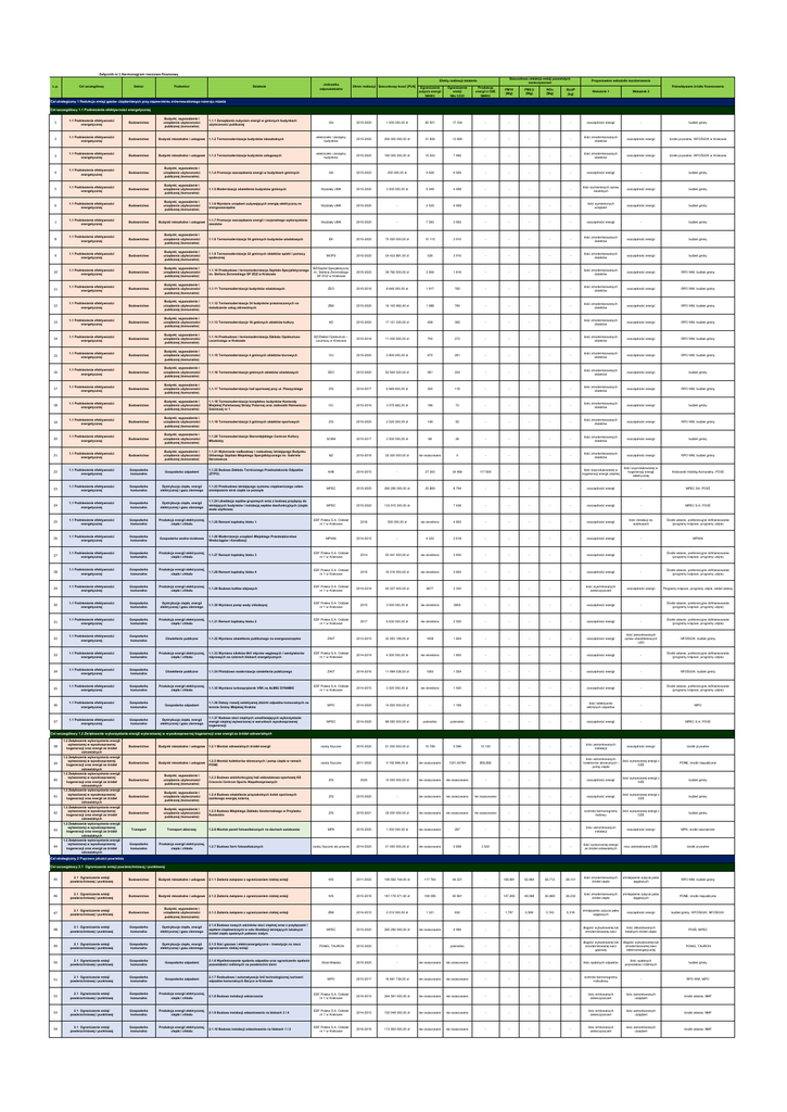 Załącznik nr 1 Harmonogram rzeczowo-finansowy Szacunkowa redukcja emisji pozostałych zanieczyszczeń Efekty realizacji działania L.p. Cel szczegółowy Sektor Podsektor Działanie Jednostka odpowiedzialna Okres realizacji Szacunkowy koszt [PLN] Ograniczenie zużycia energii [MWh] Ograniczenie emisji [Mg CO2] Produkcja energii z OZE [MWh] PM10 [Mg] PM2,5 [Mg] NOx [Mg] B(α)P [kg] Proponowane wskaźniki monitorowania Przewidywane źródło finansowania Wskaźnik 1 Wskaźnik 2 Cel strategiczny 1 Redukcja emisji gazów cieplarnianych przy zapewnieniu zrównoważonego rozwoju miasta Cel szczegółowy 1.1 Podniesienie efektywności energetycznej 1 1.1 Podniesienie efektywności energetycznej Budownictwo Budynki, wyposażenie i urządzenia użyteczności publicznej (komunalne) GK 2015-2020 1 000 000,00 zł 92 501 17 334 - - - - - oszczędność energii - budżet gminy 2 1.1 Podniesienie efektywności energetycznej Budownictwo Budynki mieszkalne i usługowe 1.1.2 Termomodernizacja budynków mieszkalnych właściciele i zarządcy budynków 2015-2020 293 000 000,00 zł 31 654 13 569 - - - - - ilość zmodernizowanych obiektów oszczędność energii środki prywatne, WFOŚiGW w Krakowie 3 1.1 Podniesienie efektywności energetycznej Budownictwo Budynki mieszkalne i usługowe 1.1.3 Termomodernizacja budynków usługowych właściciele i zarządcy budynków 2015-2020 180 000 000,00 zł 15 543 7 992 - - - - - ilość zmodernizowanych obiektów oszczędność energii środki prywatne, WFOŚiGW w Krakowie 4 1.1 Podniesienie efektywności energetycznej Budownictwo Budynki, wyposażenie i urządzenia użyteczności publicznej (komunalne) GK 2015-2020 250 000,00 zł 4 626 6 929 - - - - - oszczędność energii - budżet gminy 5 1.1 Podniesienie efektywności energetycznej Budownictwo Budynki, wyposażenie i urządzenia użyteczności publicznej (komunalne) 1.1.5 Modernizacja oświetlenia budynków gminnych Wydziały UMK 2015-2020 3 200 000,00 zł 5 049 4 958 - - - - - ilość wymienionych opraw świetlnych oszczędność energii budżet gminy 6 1.1 Podniesienie efektywności energetycznej Budownictwo Budynki, wyposażenie i urządzenia użyteczności publicznej (komunalne) 1.1.6 Wymiana urządzeń zużywających energię elektryczną na energooszczędne Wydziały UMK 2015-2020 - 2 525 4 958 - - - - - ilość wymienionych urządzeń oszczędność energii budżet gminy 7 1.1 Podniesienie efektywności energetycznej Budownictwo Budynki mieszkalne i usługowe 1.1.7 Promocja oszczędzania energii i racjonalnego wykorzystania zasobów Wydziały UMK 2015-2020 - 7 593 3 952 - - - - - oszczędność energii - budżet gminy 8 1.1 Podniesienie efektywności energetycznej Budownictwo Budynki, wyposażenie i urządzenia użyteczności publicznej (komunalne) 1.1.8 Termomodernizacja 54 gminnych budynków oświatowych EK 2015-2020 70 000 000,00 zł 10 115 3 910 - - - - - ilość zmodernizowanych obiektów oszczędność energii budżet gminy 9 1.1 Podniesienie efektywności energetycznej Budownictwo Budynki, wyposażenie i urządzenia użyteczności publicznej (komunalne) 1.1.9 Termomodernizacja 22 gminnych obiektów opieki i pomocy społecznej MOPS 2015-2020 24 433 881,00 zł 536 3 910 - - - - - ilość zmodernizowanych obiektów oszczędność energii budżet gminy 10 1.1 Podniesienie efektywności energetycznej Budownictwo Budynki, wyposażenie i urządzenia użyteczności publicznej (komunalne) 1.1.10 Przebudowa i termomodernizacja Szpitala Specjalistycznego im. Stefana Żeromskiego SP ZOZ w Krakowie BZ/Szpital Specjalistyczny im. Stefana Żeromskiego SP ZOZ w Krakowie 2015-2020 39 760 000,00 zł 3 906 1 816 - - - - - ilość zmodernizowanych obiektów oszczędność energii RPO WM, budżet gminy 11 1.1 Podniesienie efektywności energetycznej Budownictwo Budynki, wyposażenie i urządzenia użyteczności publicznej (komunalne) 1.1.11 Termomodernizacja budynków oświatowych ZEO 2015-2016 8 646 000,00 zł 1 917 762 - - - - - ilość zmodernizowanych obiektów oszczędność energii RPO WM, budżet gminy 12 1.1 Podniesienie efektywności energetycznej Budownictwo Budynki, wyposażenie i urządzenia użyteczności publicznej (komunalne) 1.1.12 Termomodernizacja 34 budynków przeznaczonych na świadczenie usług zdrowotnych ZBK 2015-2020 16 105 992,40 zł 1 988 760 - - - - - ilość zmodernizowanych obiektów oszczędność energii RPO WM, budżet gminy 13 1.1 Podniesienie efektywności energetycznej Budownictwo Budynki, wyposażenie i urządzenia użyteczności publicznej (komunalne) 1.1.13 Termomodernizacja 16 gminnych obiektów kultury KD 2015-2020 17 121 330,00 zł 458 365 - - - - - ilość zmodernizowanych obiektów oszczędność energii RPO WM, budżet gminy 14 1.1 Podniesienie efektywności energetycznej Budownictwo Budynki, wyposażenie i urządzenia użyteczności publicznej (komunalne) 1.1.14 Przebudowa i termomodernizacja Zakładu OpiekuńczoLeczniczego w Krakowie BZ/Zakład Opiekuńczo – Leczniczy w Krakowie 2015-2018 11 000 000,00 zł 700 272 - - - - - ilość zmodernizowanych obiektów oszczędność energii RPO WM, budżet gminy 15 1.1 Podniesienie efektywności energetycznej Budownictwo Budynki, wyposażenie i urządzenia użyteczności publicznej (komunalne) 1.1.15 Termomodernizacja 4 gminnych obiektów biurowych OU 2015-2020 2 800 000,00 zł 670 261 - - - - - ilość zmodernizowanych obiektów oszczędność energii RPO WM, budżet gminy 16 1.1 Podniesienie efektywności energetycznej Budownictwo Budynki, wyposażenie i urządzenia użyteczności publicznej (komunalne) 1.1.16 Termomodernizacja gminnych obiektów oświatowych ZEO 2012-2020 52 942 020,00 zł 581 224 - - - - - ilość zmodernizowanych obiektów oszczędność energii budżet gminy 17 1.1 Podniesienie efektywności energetycznej Budownictwo Budynki, wyposażenie i urządzenia użyteczności publicznej (komunalne) 1.1.17 Termomodernizacja hali sportowej przy ul. Ptaszyckiego ZIS 2014-2017 6 849 400,00 zł 300 116 - - - - - ilość z